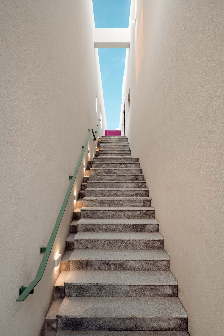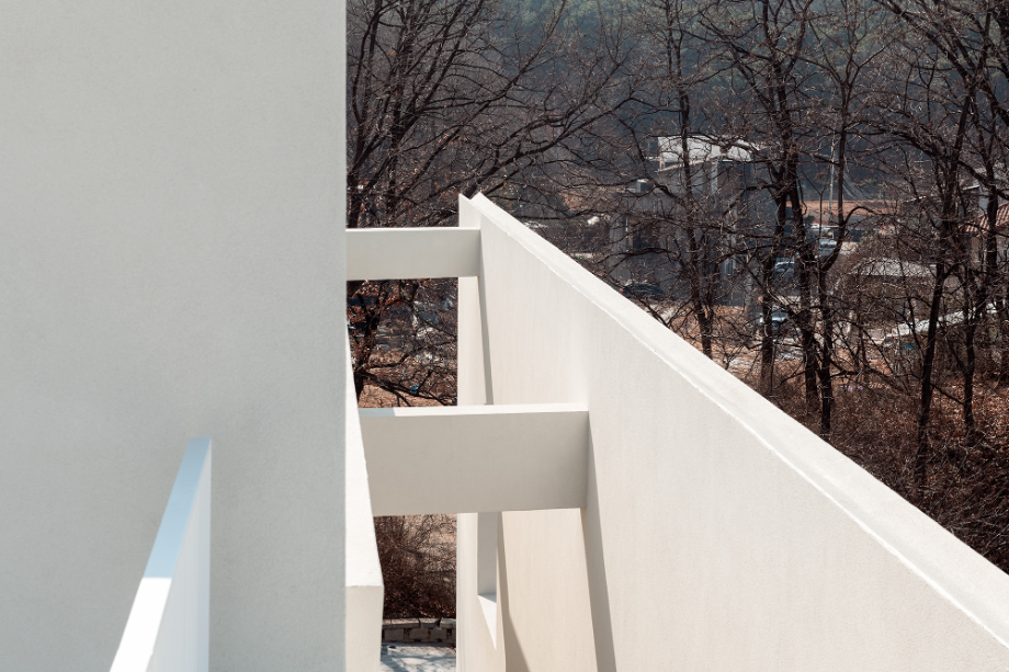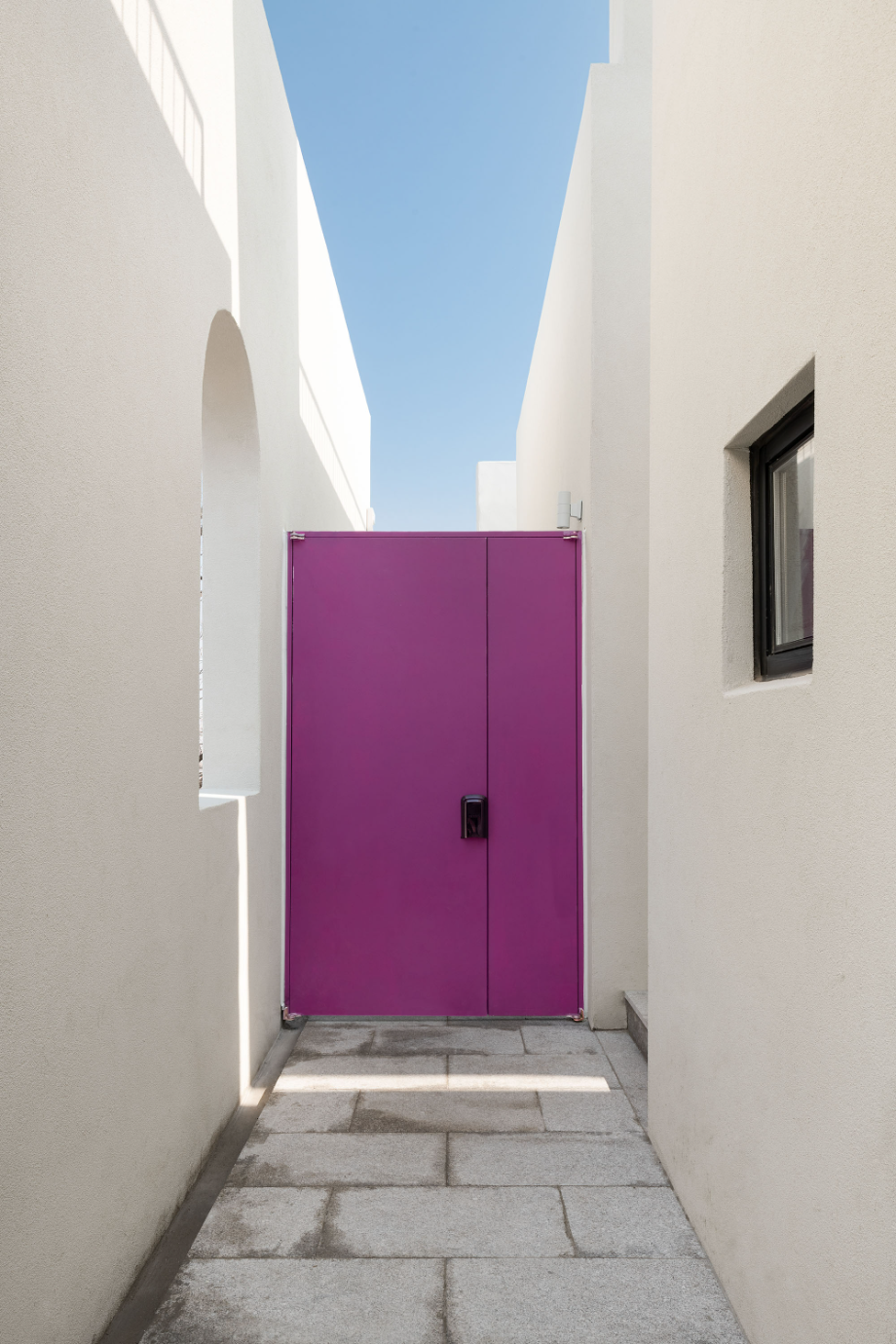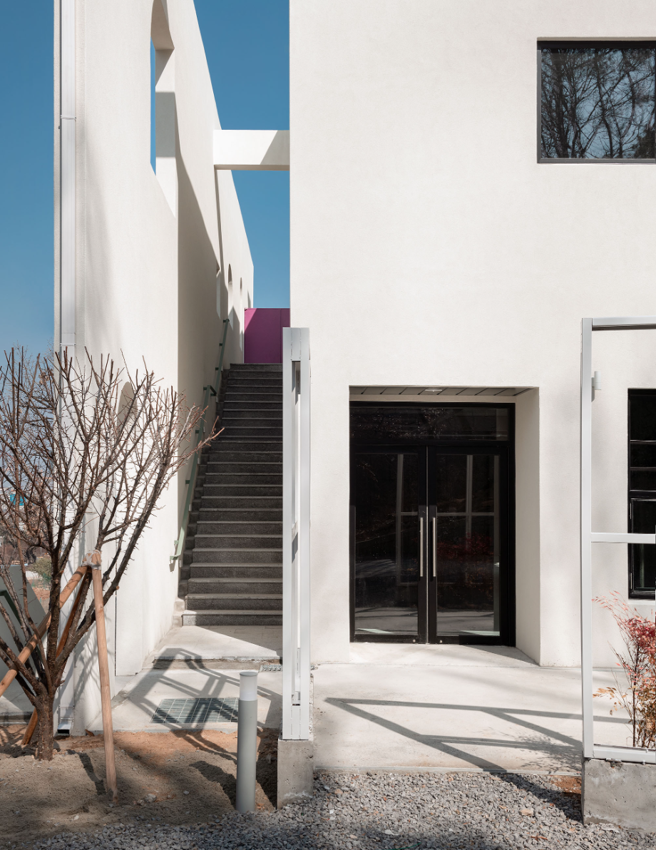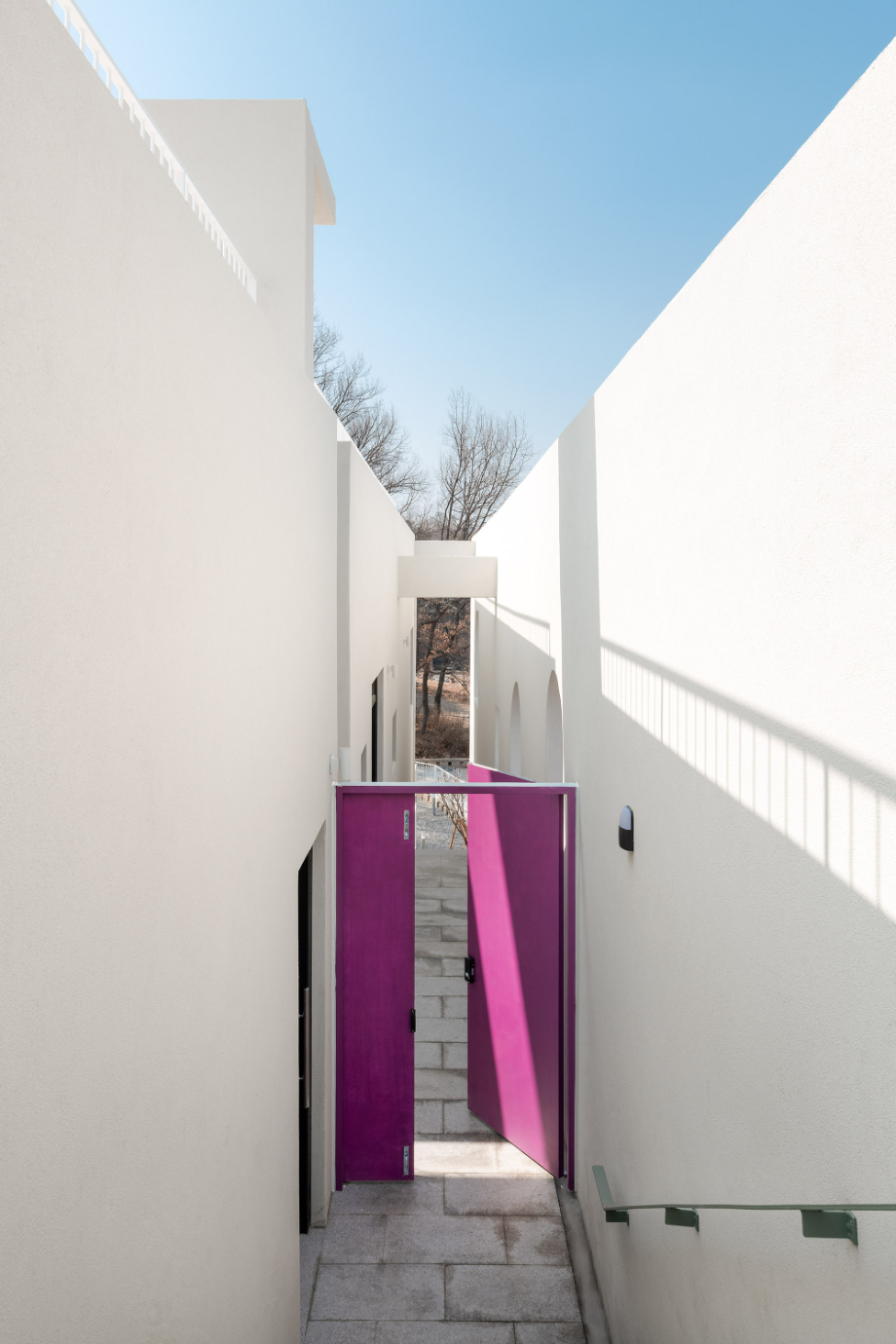 마을을 향한 입면을 구성하고 있는 벽과 내부공간 사이에는 외부 계단을 두어 각 공간들 사이에 적절한 공간적 거리감을 두었다. 하얀벽 사이로 올리브색 난간을 따라 파란 하늘을 향해 올라가면 만나는 자주색 문은 경쾌한 분위기를 만드는 시각적 역할과 함께, 건축주 공간의 시작을 알린다.