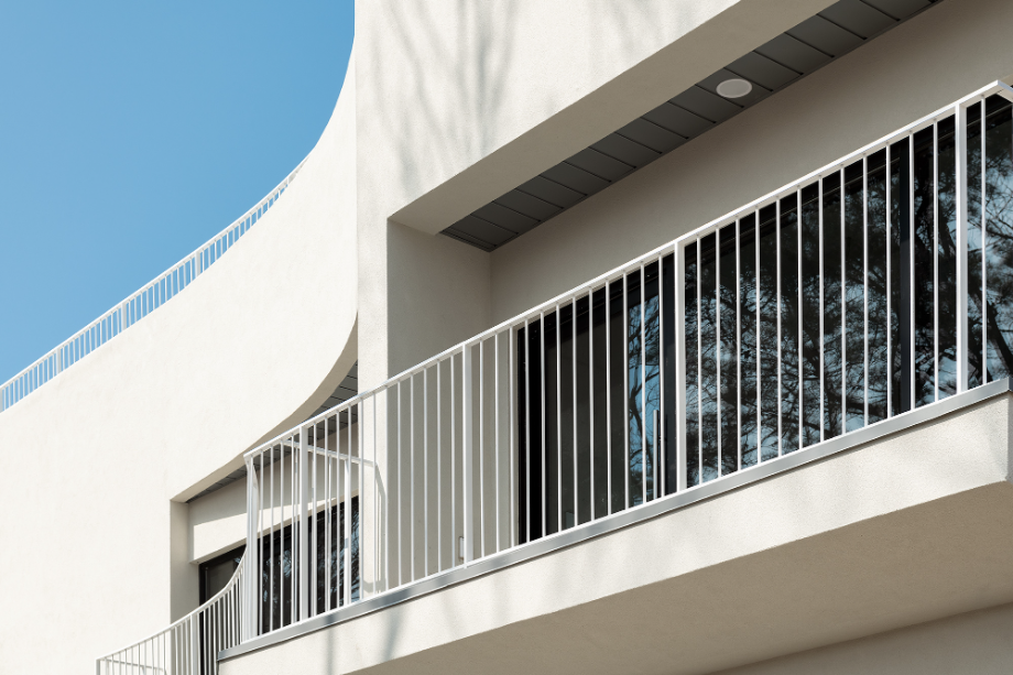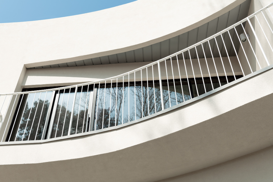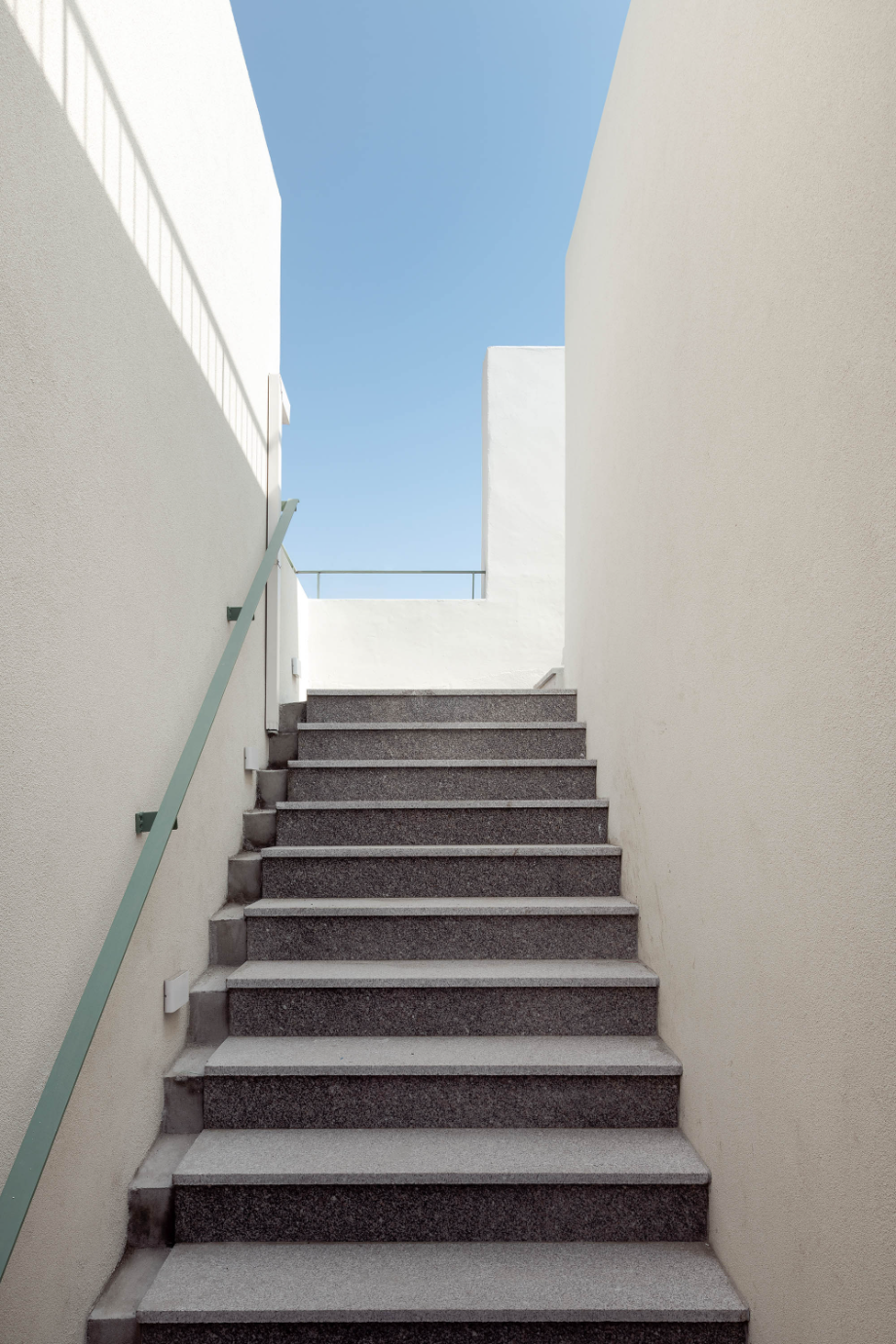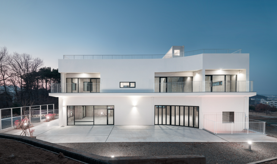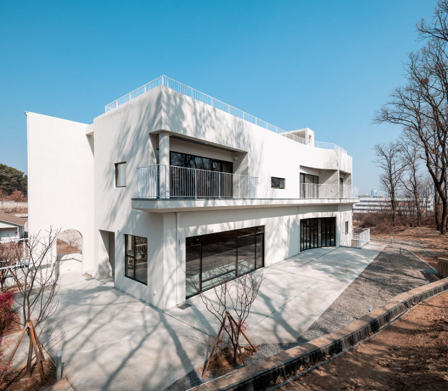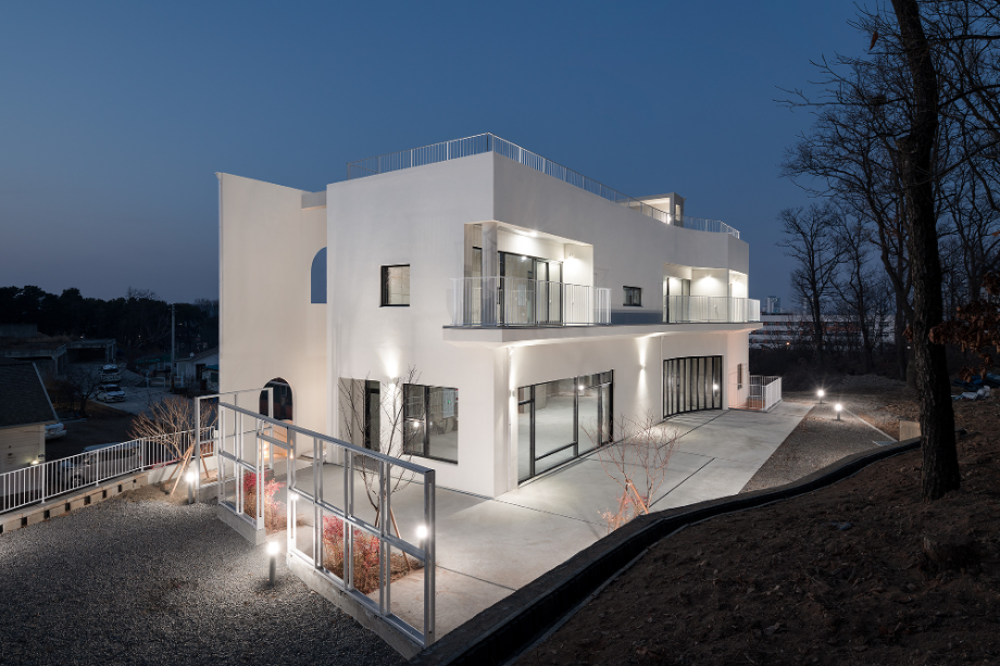 마을을 향한 입면을 구성하고 있는 벽과 내부공간 사이에는 외부 계단을 두어 각 공간들 사이에 적절한 공간적 거리감을 두었다. 하얀벽 사이로 올리브색 난간을 따라 파란 하늘을 향해 올라가면 만나는 자주색 문은 경쾌한 분위기를 만드는 시각적 역할과 함께, 건축주 공간의 시작을 알린다.