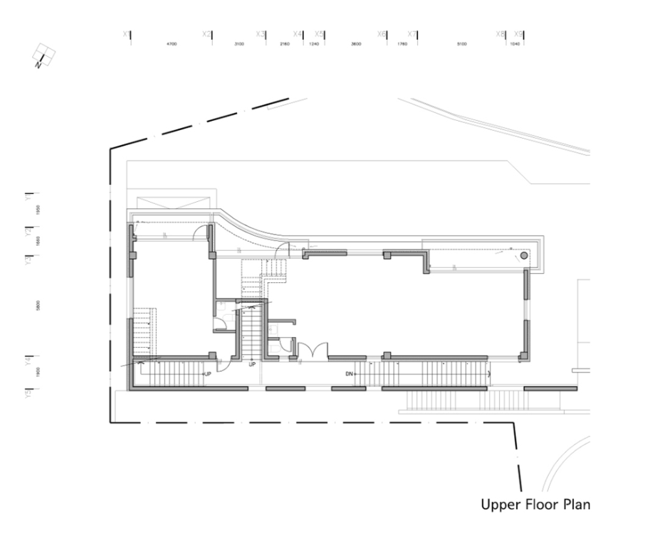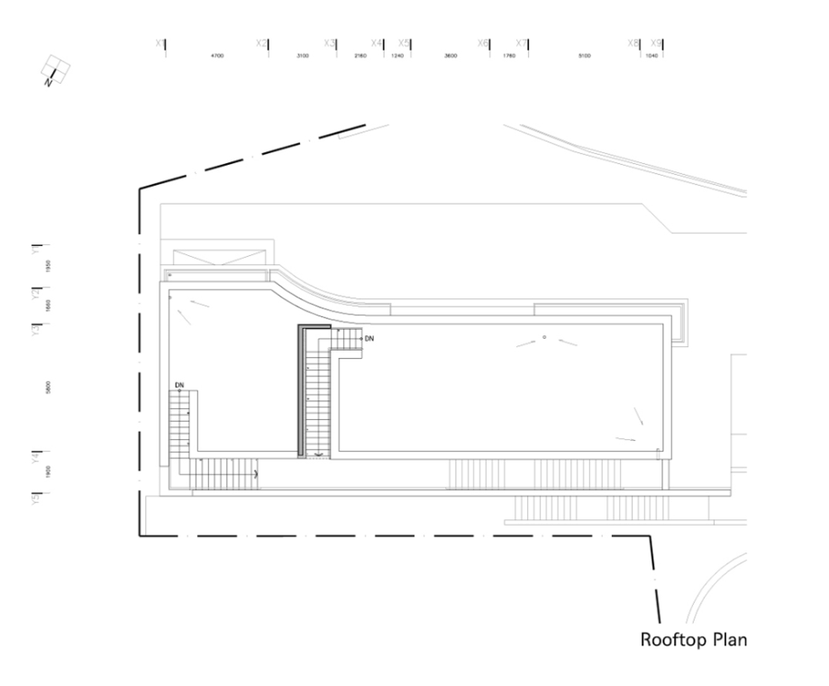 중앙계단의 'ㄱ'자 벽은 2층 각 공간에서 각각 진입하도록 계획된 옥상을 답답함없이 분리해 준다. 결과적으로는 상황상 프라이빗 공간까지 전체 임대가 되었고, 사용자가 용도에 따라 구분하여 사용하고 있다.◼︎
