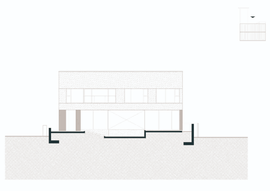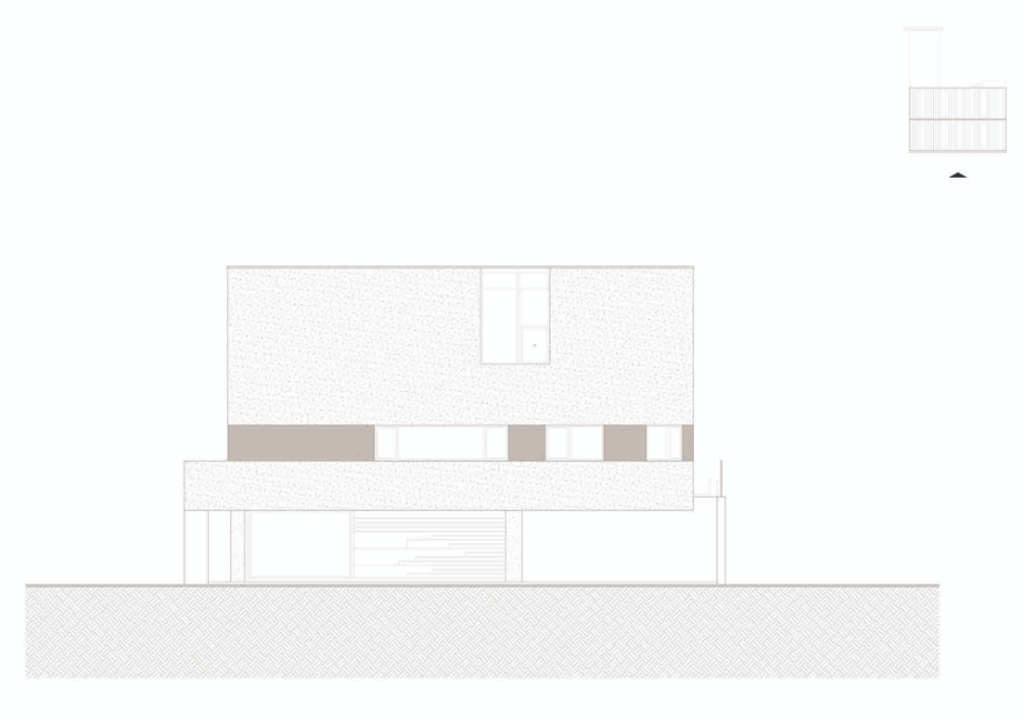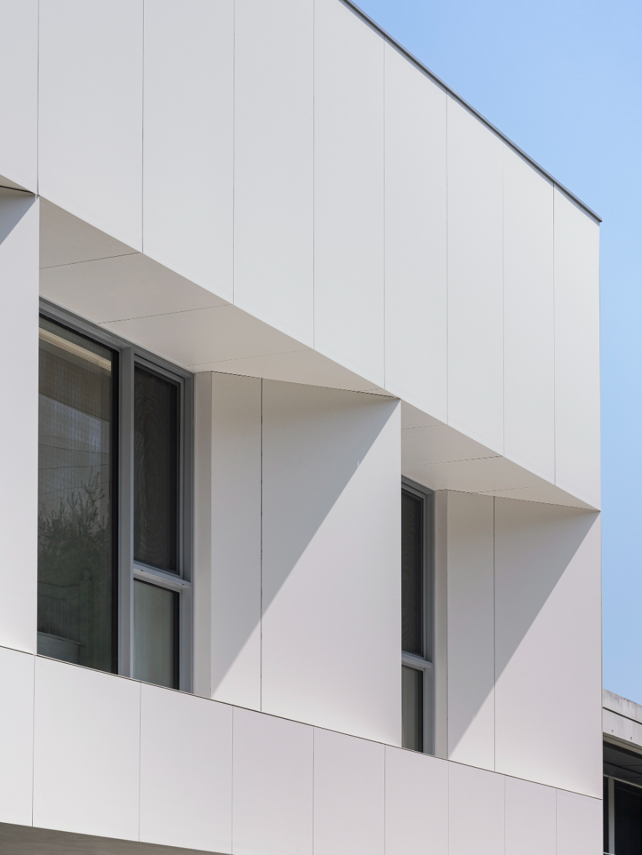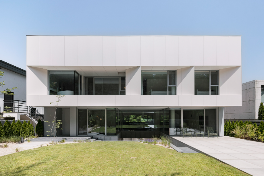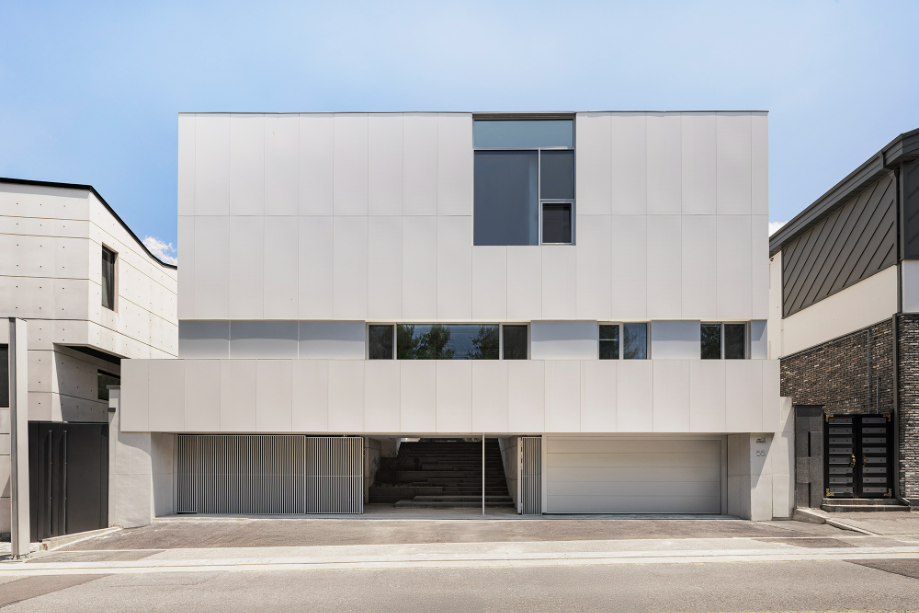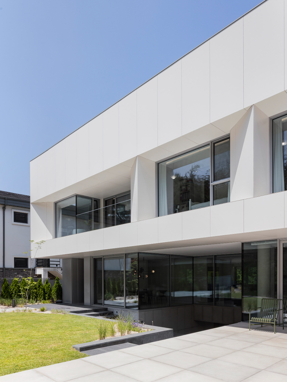 건축주는 직선이 강조된 미니멀한 건축 스타일을 원했다. 전통적인 박공지붕보다는 단순하고 모던한 형태를 선호했으나, 건축법규상 경사지붕은 피할 수 없는 조건이었다. 시선이 집중되지 않는 인접주택 쪽을 경사지붕으로 처리하고 정면과 배면은 평지붕형태로 계획함으로써 전체적인 형태를 간결하게 정리했다. 법적 조건을 따르면서도 건축주의 의도를 최대한 반영한 형태적 조율이었다.