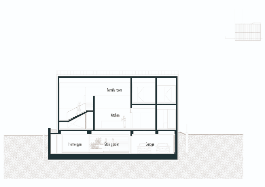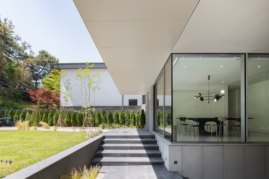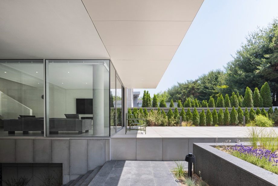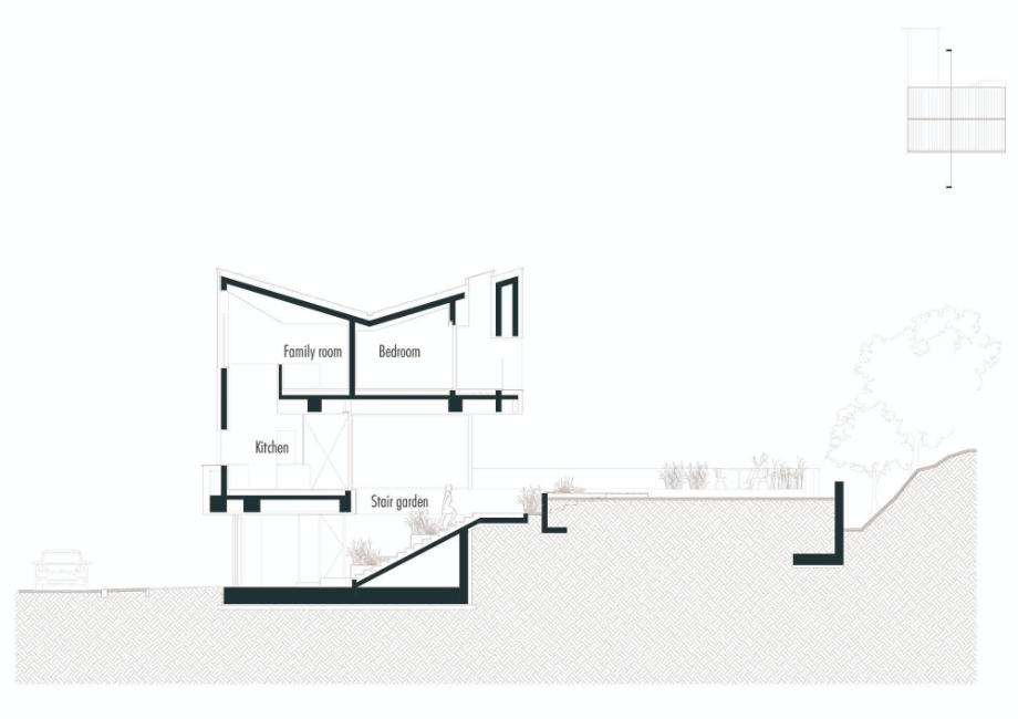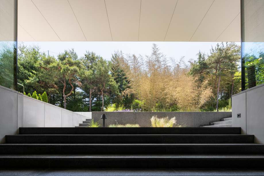 도로와 마당의 레벨차는 자연스럽게 연결되기를 원했으며, 인접한 주택들처럼 문을 열고 바로 실내로 들어가거나, 건물 옆 샛길로 난 계단으로 진입하는 방식은 지양했다. 대신 건물 중심을 관통하며 마당까지 올라가는 너른한 ‘계단정원’을 계획했다. 마당에서 쏟아지는 빛을 받으며 누하진입하는 형태의 공간은 탁 트인 숲을 마주하기 직전의 전이공간이기도 하다. 계단정원-마당-숲으로 이어지는 흐름은 다양한 레벨의 계단참, 화단, 데크 등의 매개체를 통해 유기적으로 연결되어 있다.