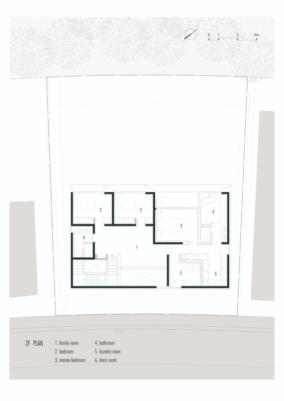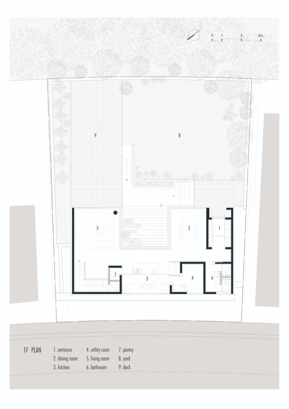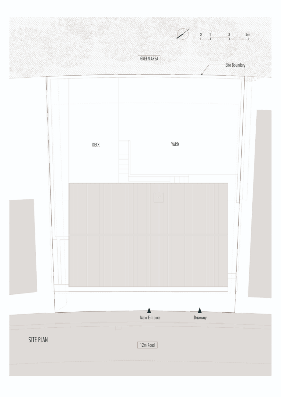북서쪽 도로와 남서쪽의 작은 숲 사이에 위치한 대지는 약 3미터의 레벨 차이를 가진 경사지였다. 이러한 대지의 높이차와 자연 환경은 집의 배치와 동선을 계획함에 있어 중요한 요소로 작용했다. 대지 양 옆에는 이미 주택이 자리하고 있어, 이웃과의 프라이버시 문제 역시 함께 고려해야 했다. 집은 숲과 평행하게 'ㅡ자형' 구조로 집을 배치함으로써, 실내 어디서든 숲을 바라볼 수 있도록 했다. 동시에 인접 대지나 외부 시선으로부터의 프라이버시 침해는 최소화하고자 했다.