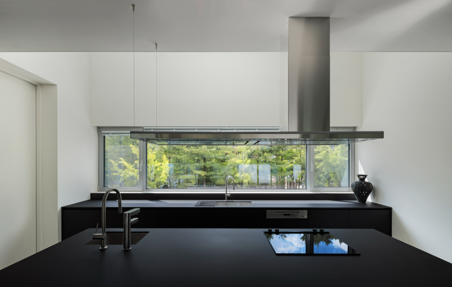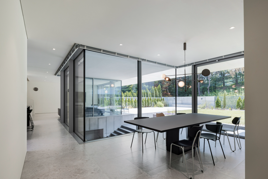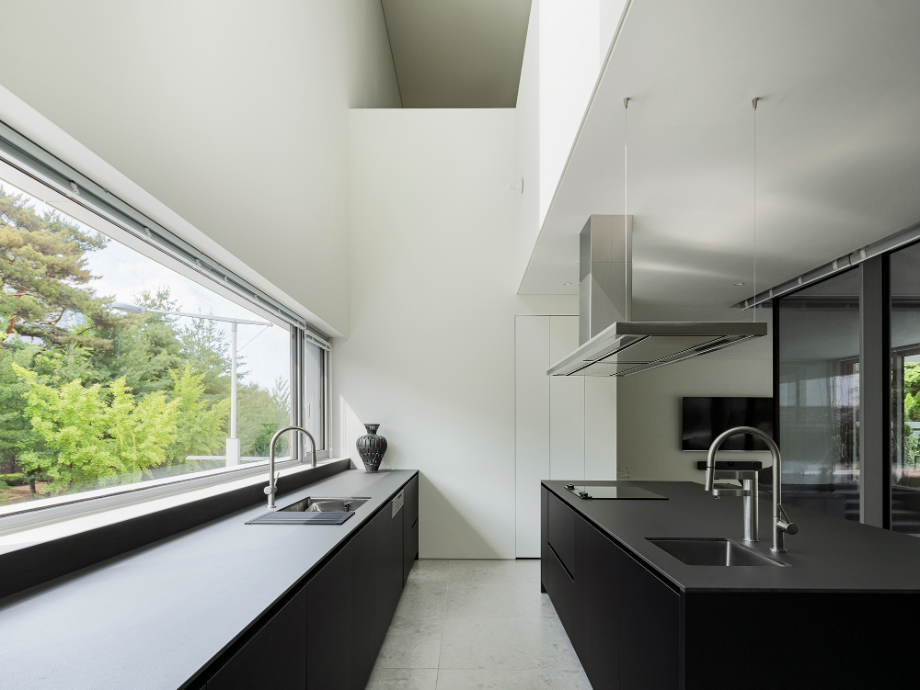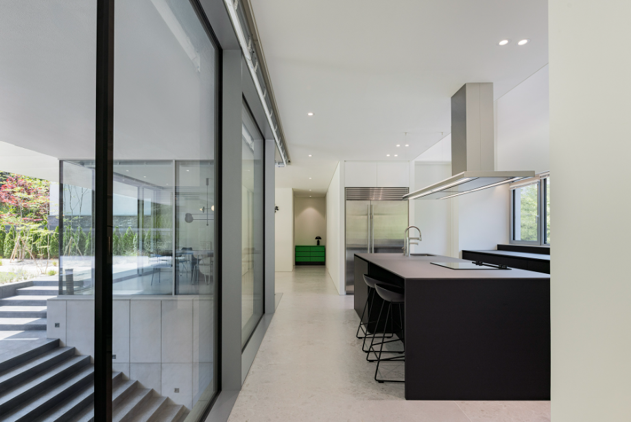 전체 공간의 중심에 자리한 주방은 수평적, 수직적으로 집 안의 공간들을 매개하는 역할을 한다. 수평적으로는 남동쪽 마당과 북서쪽 가로수의 녹음을 이어주며, 수직적으로는 오픈 천장을 통해 2층 가족실과 주방 아래에서부터 이어지는 외부 계단을 연결한다. 가족의 동선과 녹음이 하루종일 교차하는 이 주방은 집 안에서 가장 풍요롭게 생동감 넘치는 공간이다.