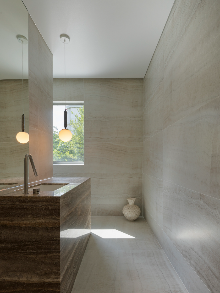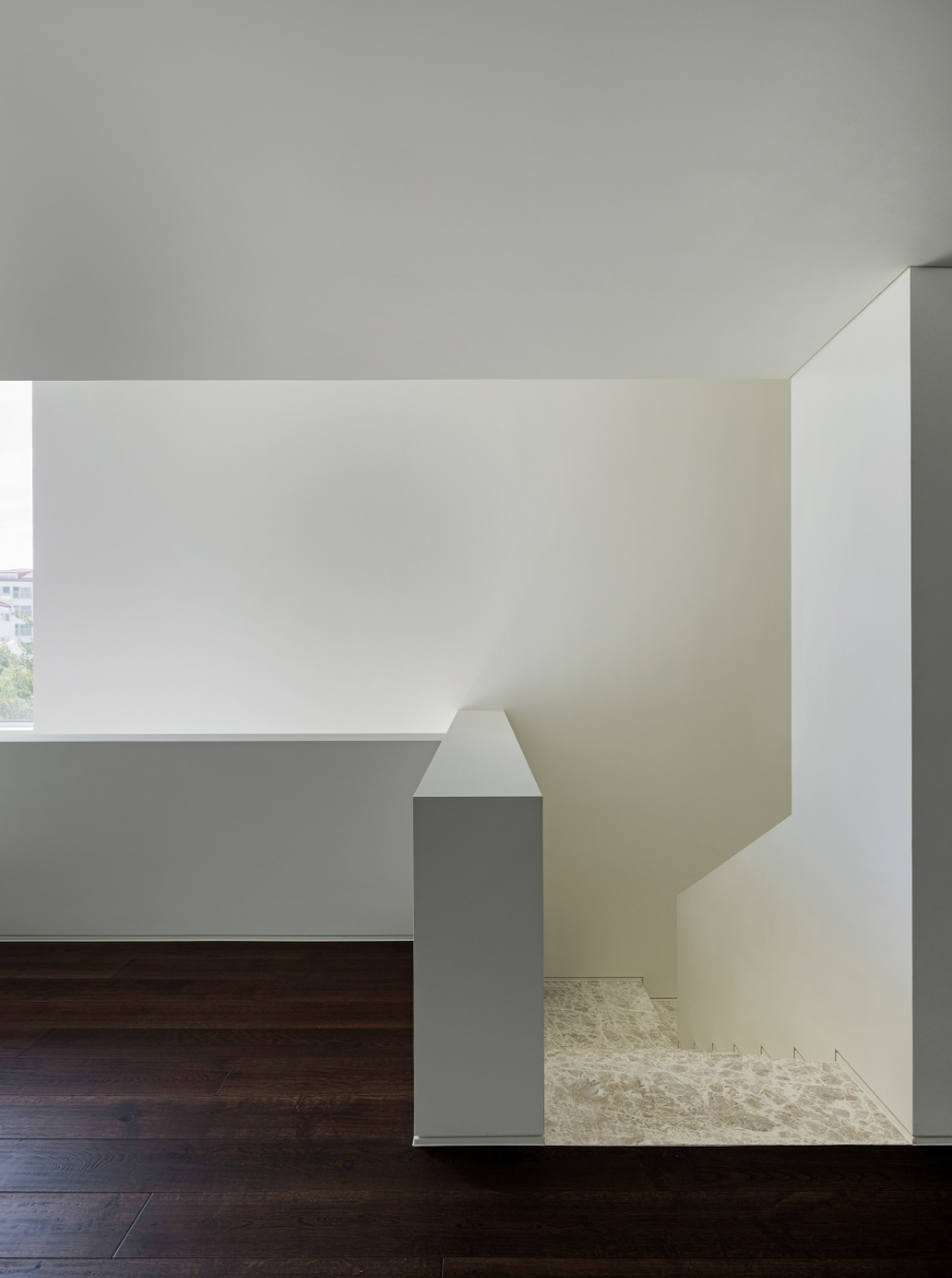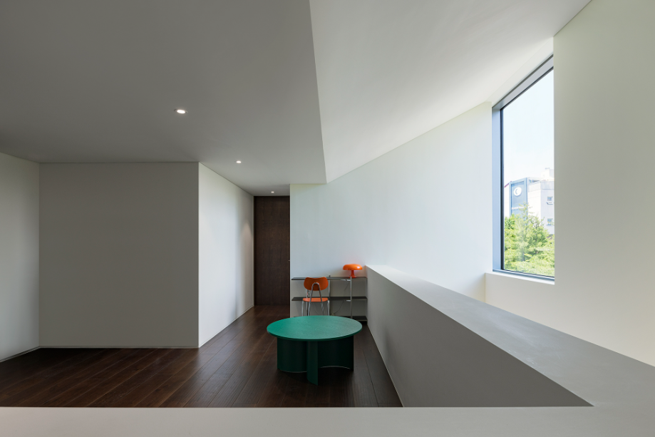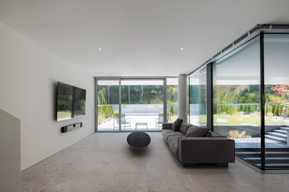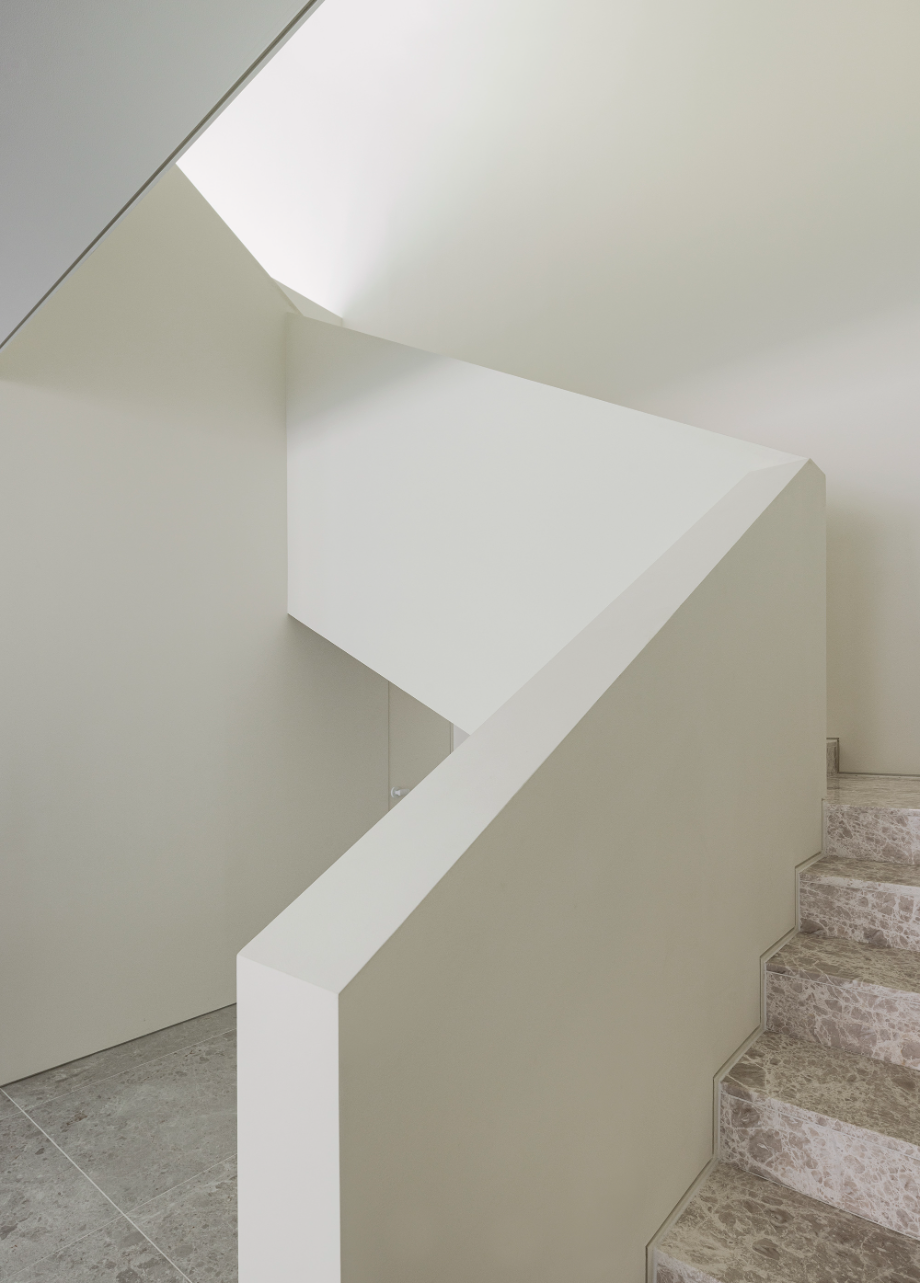 조각같은 계단을 오르면 경사지붕 아래 아늑한 가족실이 펼쳐진다. 창문 너머로 보이는 녹음은 계절의 변화를 느끼게 하고, 경사지붕을 따라 흐르는 빛은 가족의 시간을 은은하게 밝혀준다.◼︎