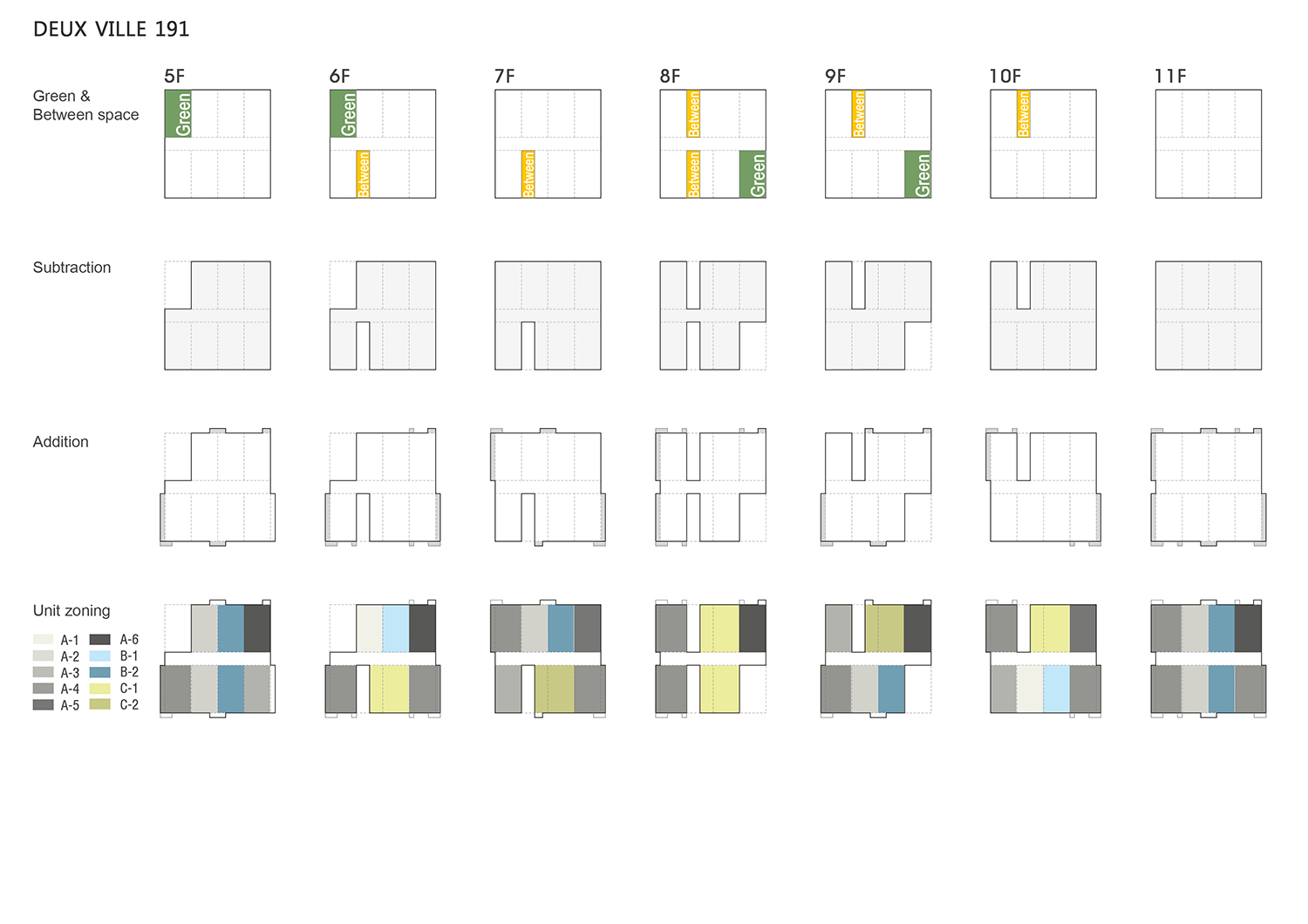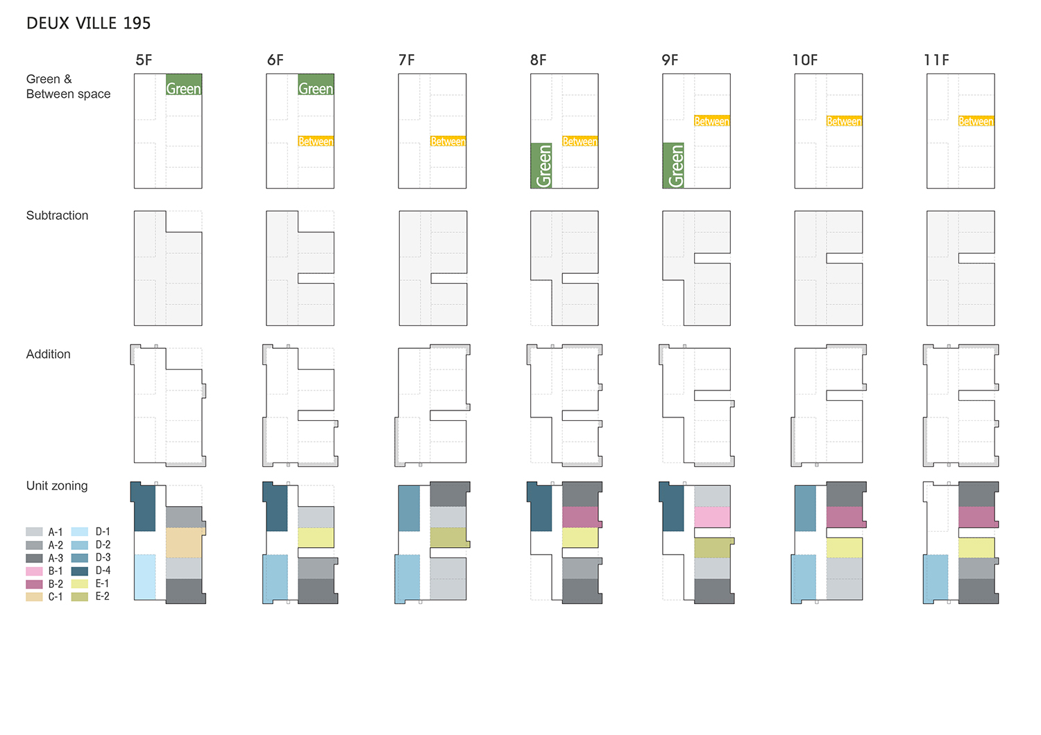 다양한 유닛을 조합, 층마다 46개의 조금씩 다른 평면을 제시한 것도 너무도 달라진 라이프스타일을 끌어안으며 "이 곳에서 이런 생활 어때요?" 라고 물으며 다채로운 삶을 담고자 하였다. 이러한 요인으로 들쑥날쑥 변화무쌍한 입면과 파사드가 나타났으며 특히 외부 마감재인 돌과 강판은 같은 색이지만 다른 질감으로 날씨와 시간에 따라 시시각각 다양한 변화를 보여줘 때론 신비함을 준다. 더욱 매력적인 것은 그러한 변화를 틈새를 통해 이동 간에 실내에서도 느낄 수 있다는 것이다. 이렇게 '공동체 공간 - 오피스텔 컴플렉스'를 극복할 수 있었다.