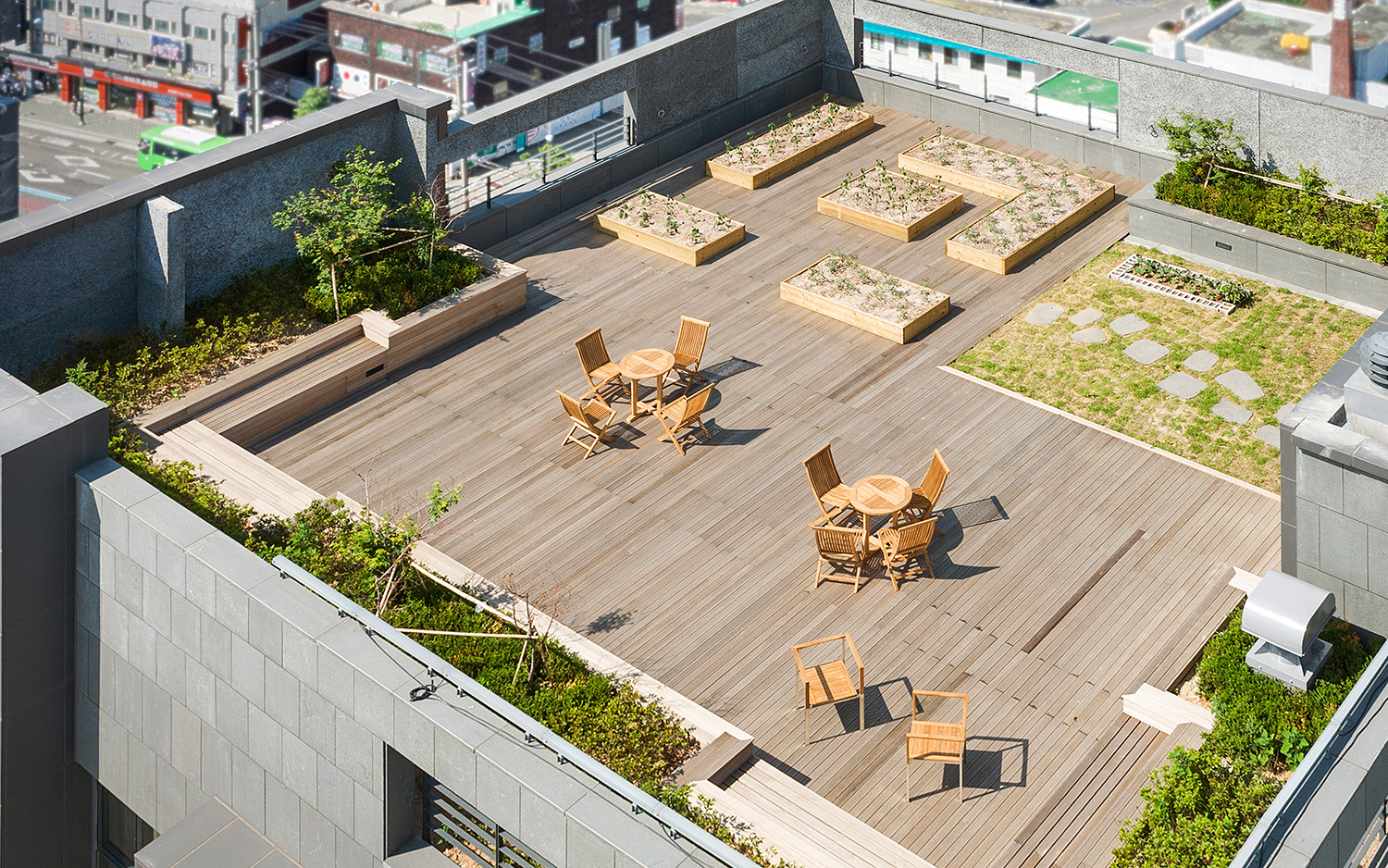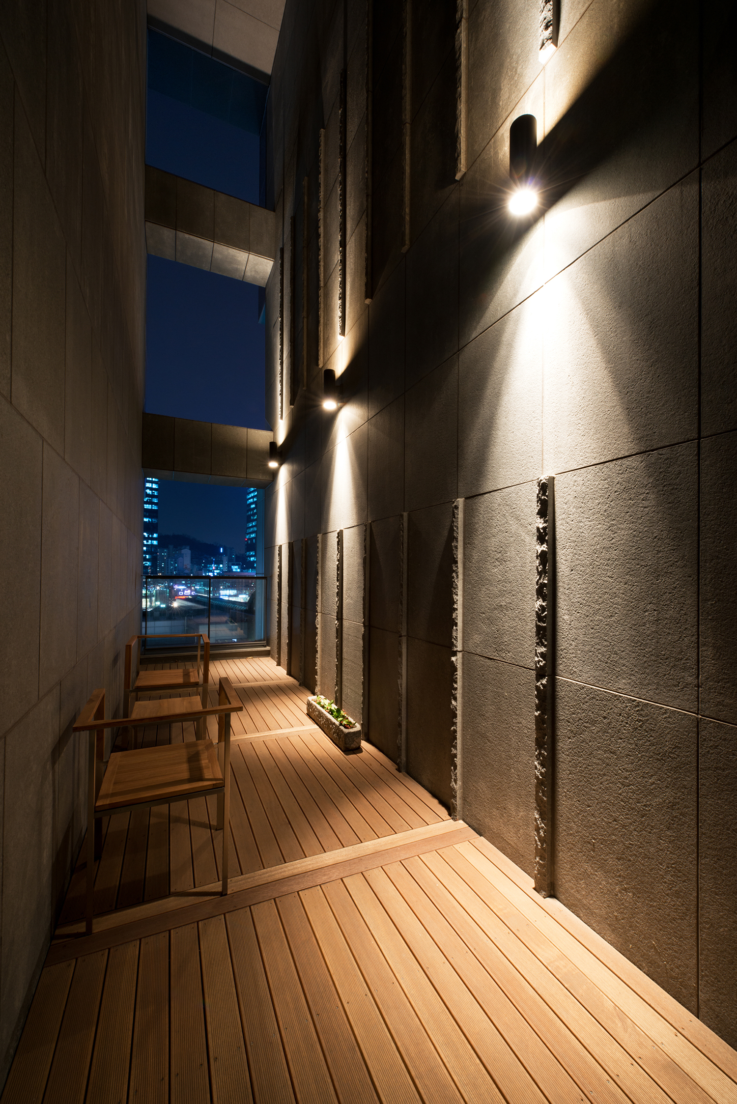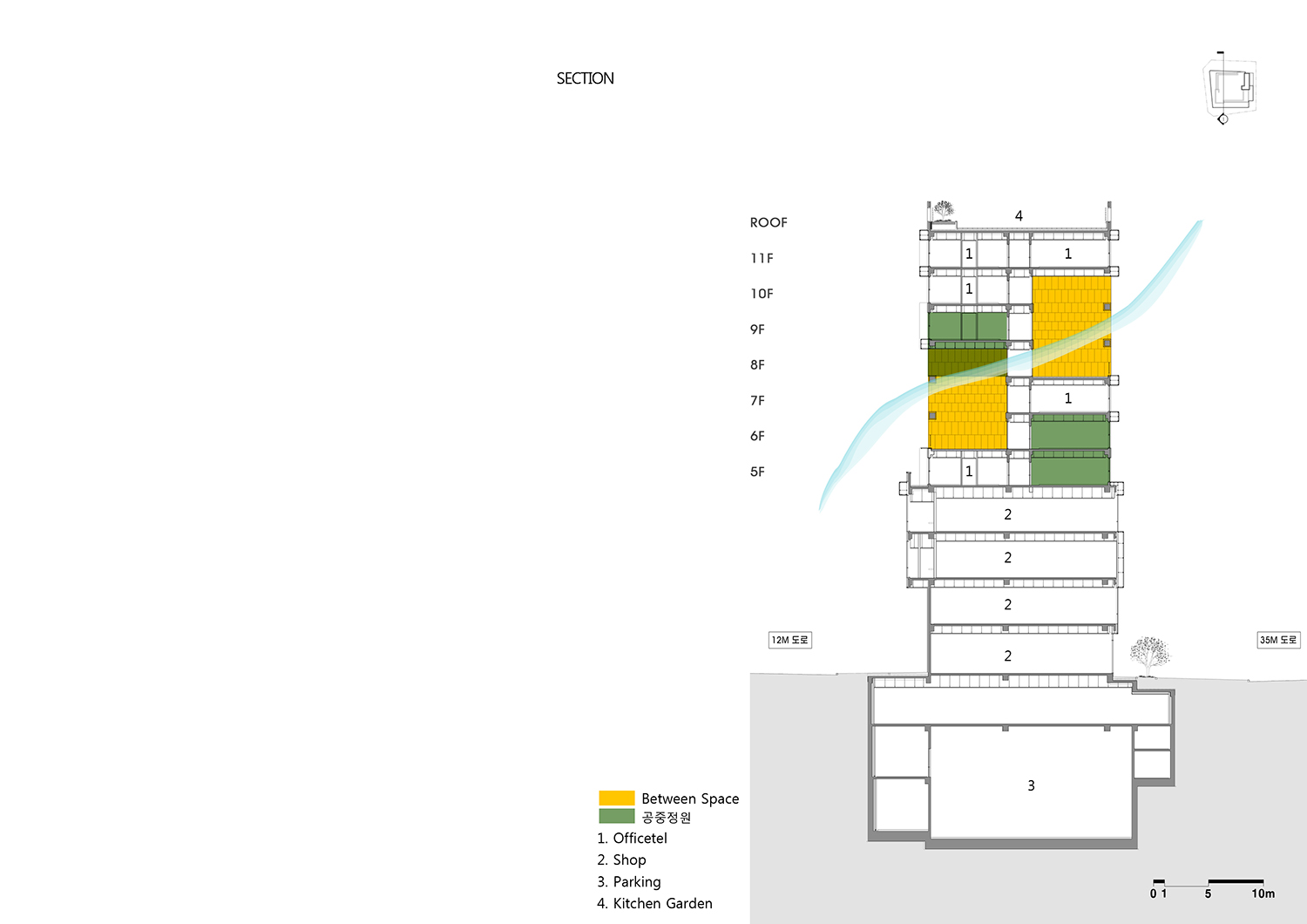세대와 세대 사이에 틈(Between Space)과 공동 데크 또한, 옥상에는 텃밭을 두어 공동체 생활 전체를 더 풍성하게 하고자 하였다. 그 곳에서 그들은 녹색의 자연과 호흡하고 바람과 함께 차를 마시며 일탈을 꿈꾸고 친구들 혹은, 이웃들과 교감할 수 있게 하였다. 특히, 틈새공간의 비움은 일반 오피스텔에서는 경험하지 못하는 개방성과 건물 한 가운데로의 '바람길'을 제시한다. 틈새는 어느 세대 앞에서는 공간을 절개하듯이 3개층이 뚫려져 수평적 투영성과 수직적 관조성이 다이나믹한 공간체험을 가능하게 해준다.