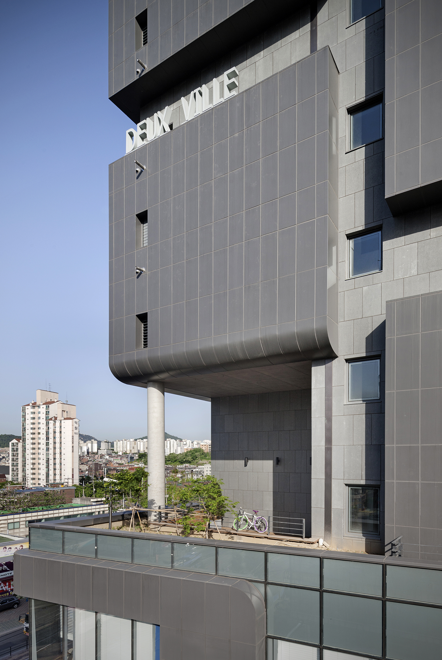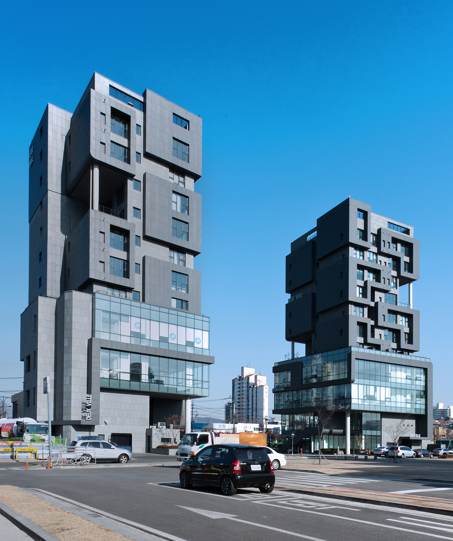 클라이언트가 소유하고 있던 땅 - 수색 1종 지구단위계획구역 내에 디지털 미디어 시티역이 생기면서 대지가 둘로 나누어지게 되어, 역을 사이에 두고 지하 3층, 지상 11층 철근 콘크리트 구조로 쌍둥이 오피스 빌딩 2개동을 설계하게 되었다. 이렇게 DEUX VILLE (불어로 둘이라는 뜻의 duxe와 ville의 합성어)은 탄생되었다. 10개월의 길지 않은 도시계획 · 지구단위 과정을 거쳐 지상 4층까지는 상업공간, 11층까지는 오피스텔로 확정하기에 이른다.