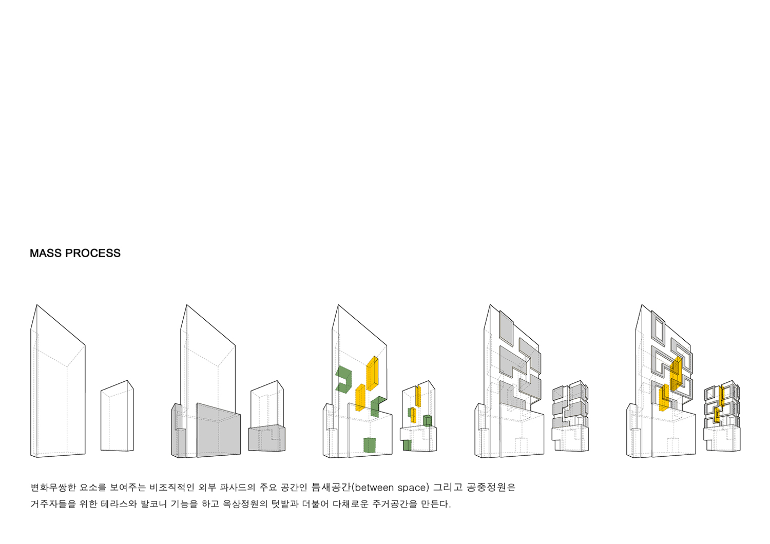 일반적인 오피스텔 건물은 최대 건폐율, 최대 용적률의 범위 안에서 반복해서 적층하는 형태에 익숙해 왔다. ‘공동체공간' - 개인만의 공간이 아니기 때문에 좀 더 다양하고 미래의 가치까지를 포함, 더 많은 가능성을 제시해야 할 의무가 있지 않겠는가? 미래를 위해 한정된 예산안에서 가장 합리적으로 계획되어야 하는 공동체 건물을 대한 고민이 시작되었다. 그래서 세대별로 적어도 화분 하나는 키울 수 있게 하자는 계획이었다.