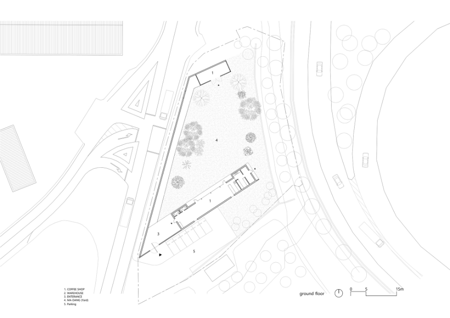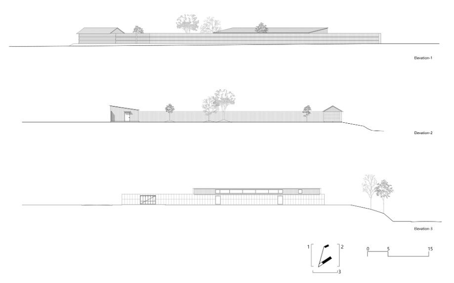 건물은 도로를 따라 길게 놓였으며, 시선과 소음을 차단하는 담장이 둘러져 있다. 이 담장은 단순한 벽이 아니라, 혼란스러운 주변 맥락을 걸러내어 차분한 내부의 공백을 만들어내는 건축적 장치로 작동한다. 담장 너머 중심에는 비워진 마당이 자리하고, 두 동의 건물이 마당을 둘러싸는 배경으로 존재한다.