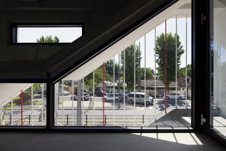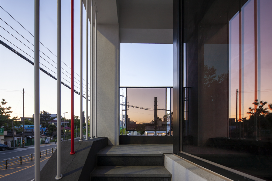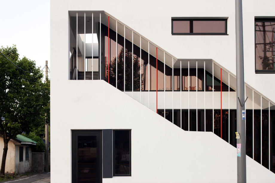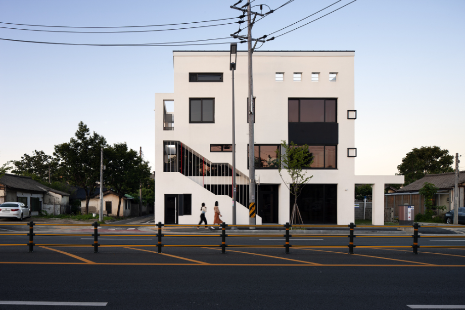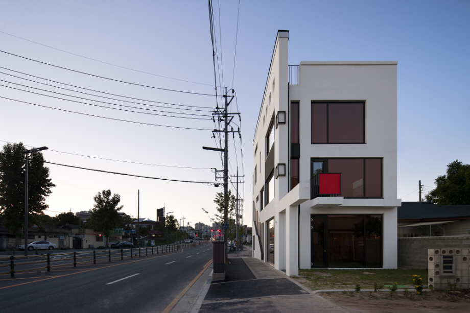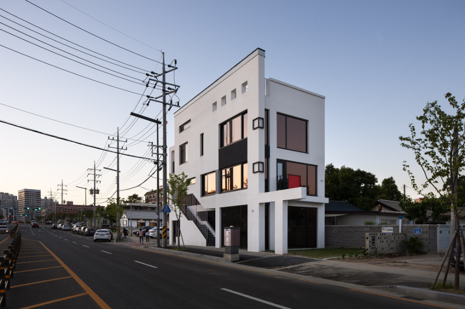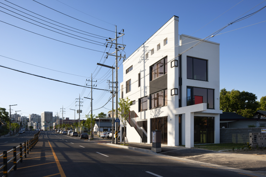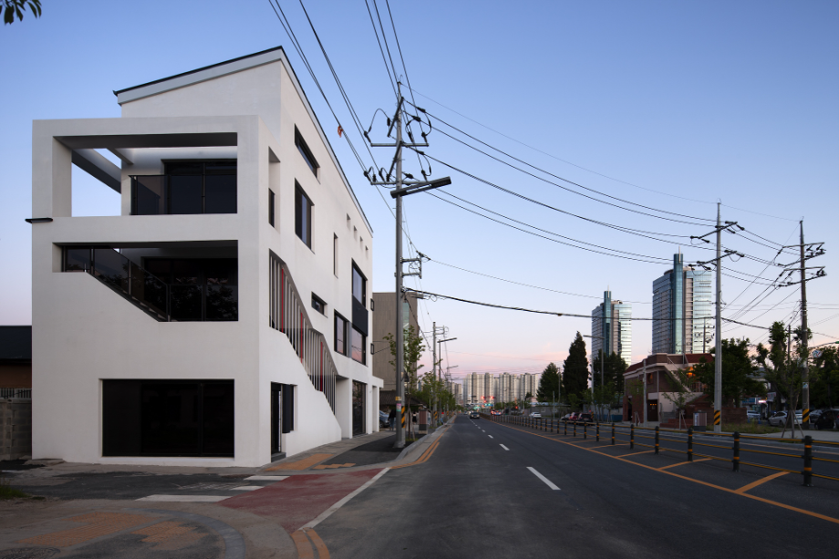 도로 확장으로 인해 땅이 분할되면서 원래 있던 건물이 철거되어, 새로 건물을 지을 수밖에 없는 상황이었다. 대지의 면적은 그리 넓지 않았으나 폭이 넓고 깊이가 얕았다. 2개 층은 건축주 본인의 사무실을 포함한 상업시설로, 3층은 주거로 구성된다. 3층 건물을 높다고 할 수는 없지만, 주변의 전반적인 높이에 비해서는 껑충한 건물이 될 수밖에 없었다. 그래서 밝은 색상으로 건물의 인상을 부드럽게 만들고 다양한 개구부와 사선으로 열리는 계단의 개구부를 통해 건물의 스케일을 낮췄다.