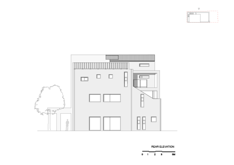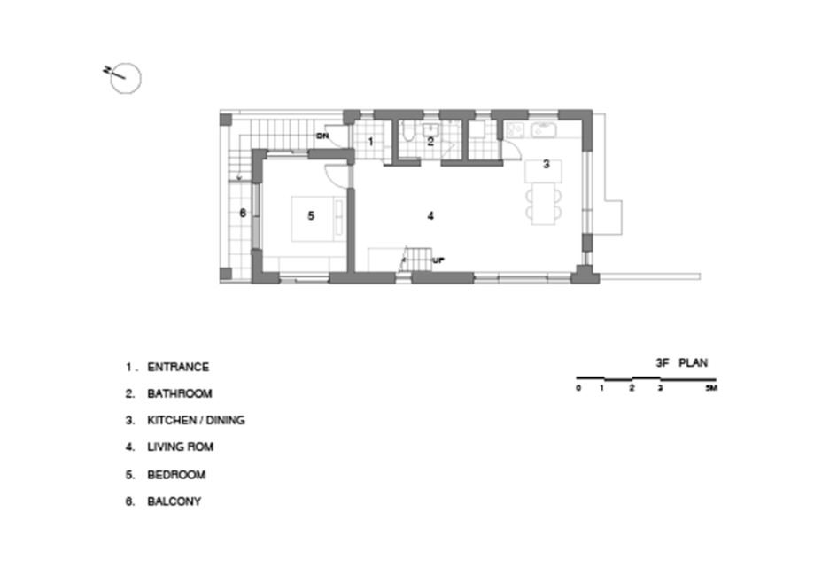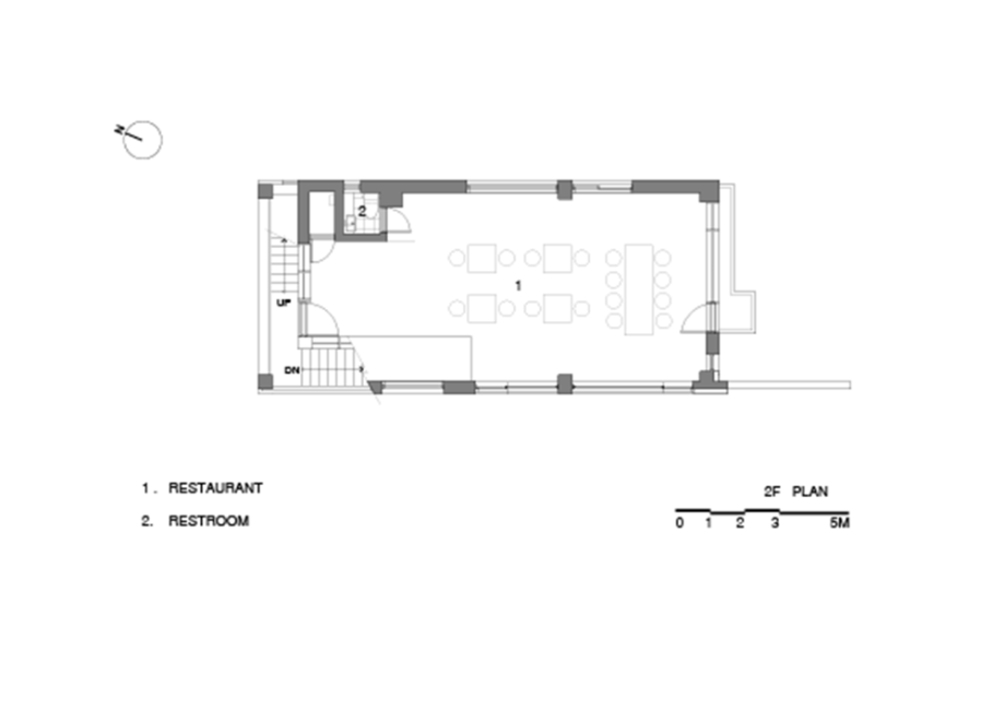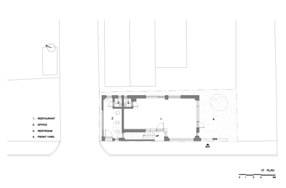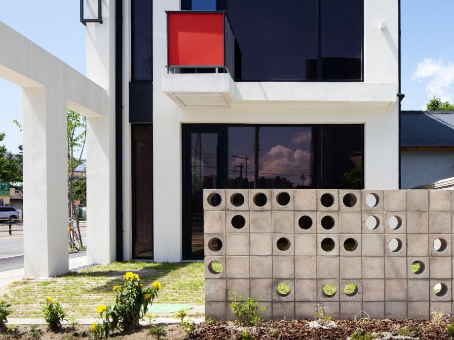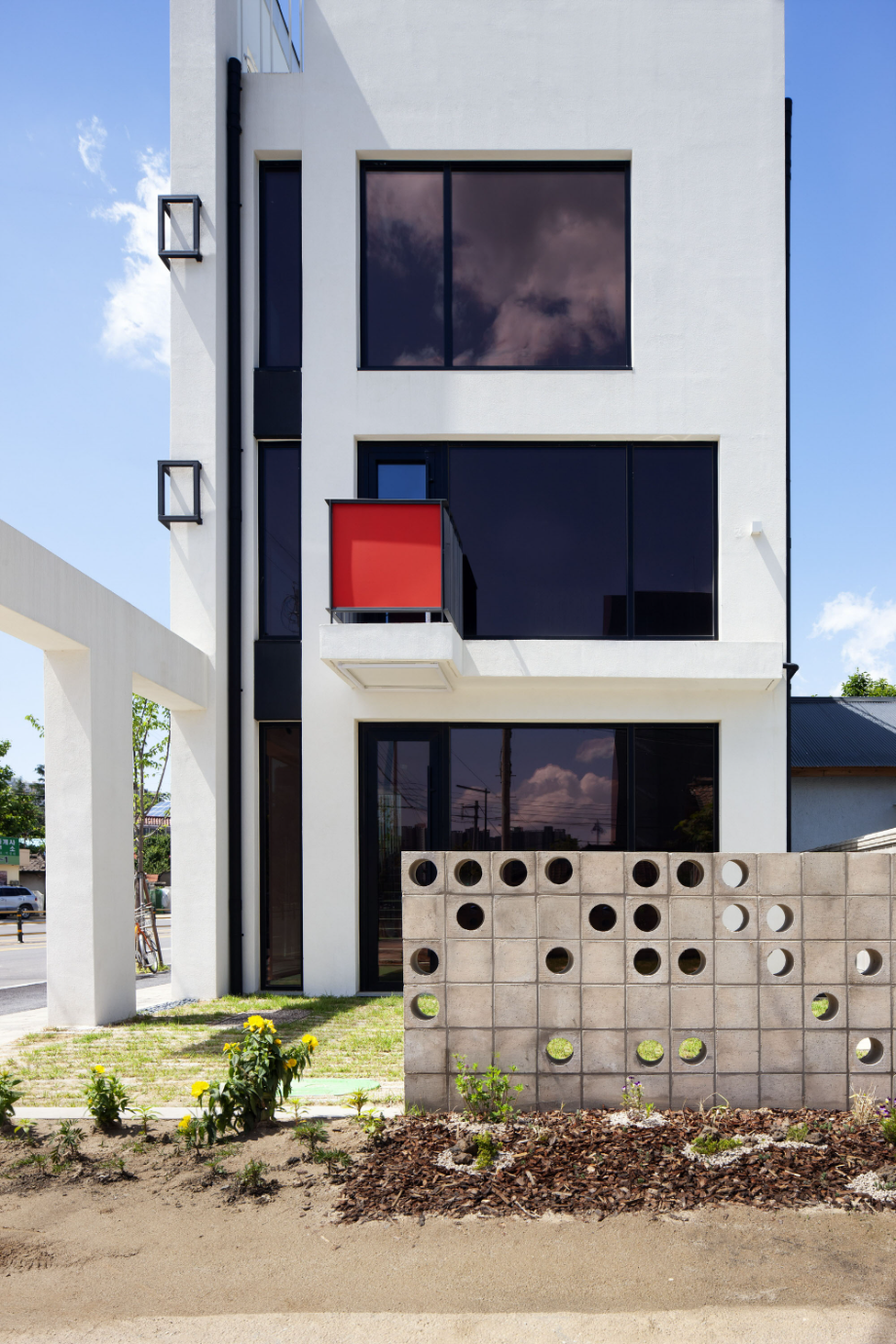 도로 확장으로 인해 땅이 분할되면서 원래 있던 건물이 철거되어, 새로 건물을 지을 수밖에 없는 상황이었다. 대지의 면적은 그리 넓지 않았으나 폭이 넓고 깊이가 얕았다. 2개 층은 건축주 본인의 사무실을 포함한 상업시설로, 3층은 주거로 구성된다. 3층 건물을 높다고 할 수는 없지만, 주변의 전반적인 높이에 비해서는 껑충한 건물이 될 수밖에 없었다. 그래서 밝은 색상으로 건물의 인상을 부드럽게 만들고 다양한 개구부와 사선으로 열리는 계단의 개구부를 통해 건물의 스케일을 낮췄다.