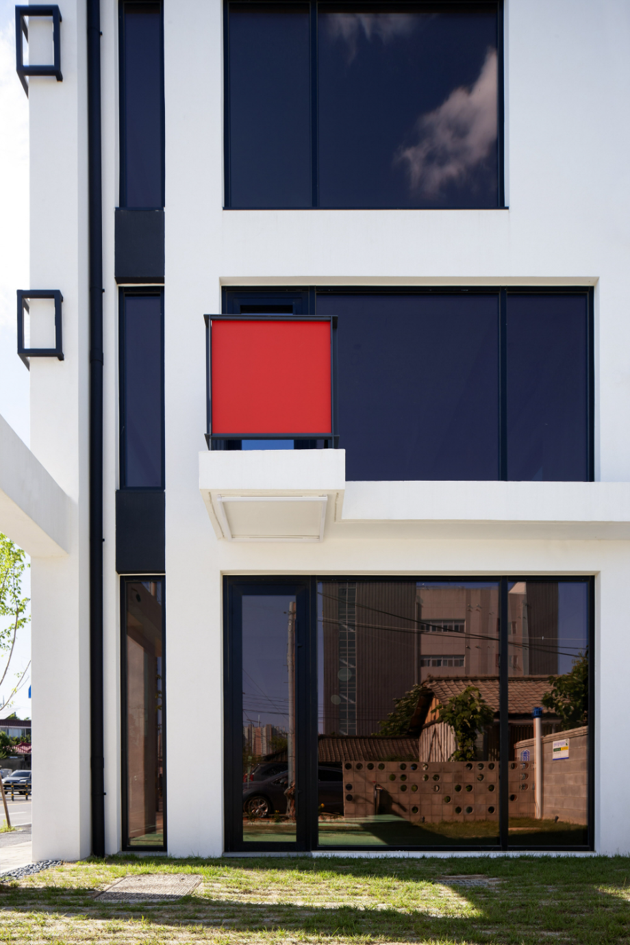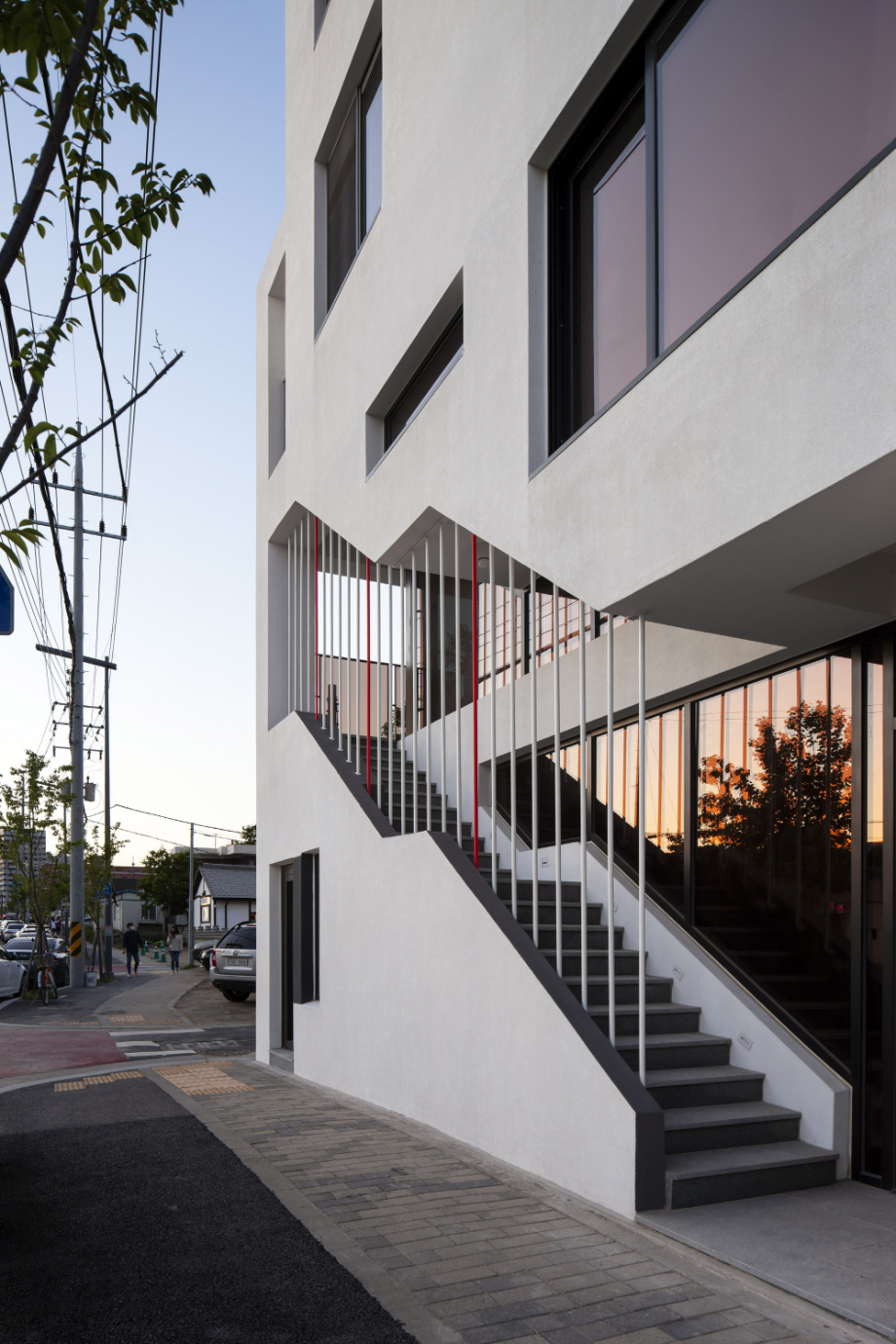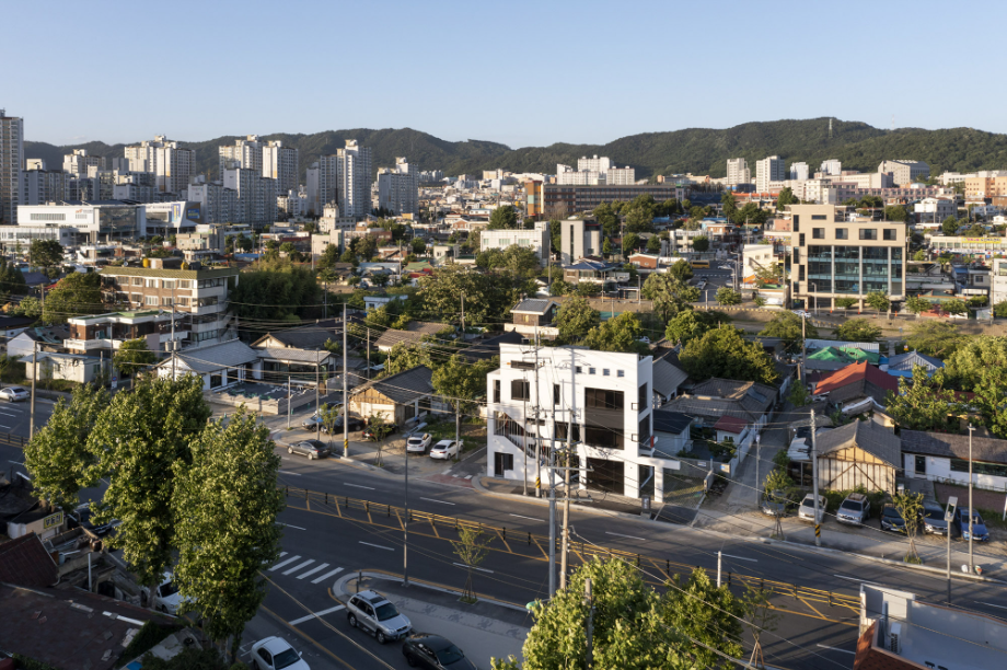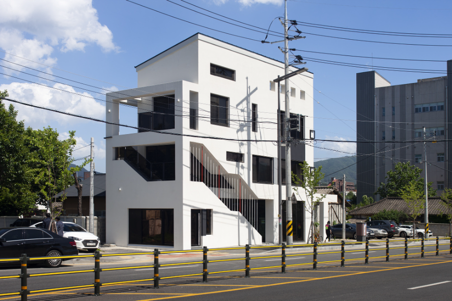 건물 정면의 좌측은 건물을 감싸고 도는 계단이 있고, 우측 대전역 쪽으로 바라보는 부분에는 작은 발코니가 돌출되어 있다. 하나는 움직이는 시선을, 하나는 정지된 시선을 가질 수 있다. 무채색의 동네에 단지 흰색의 건물을 넣은 것만으로도 마치 과거와 현재가 대비되는 듯한 이미지가 생성됐다.