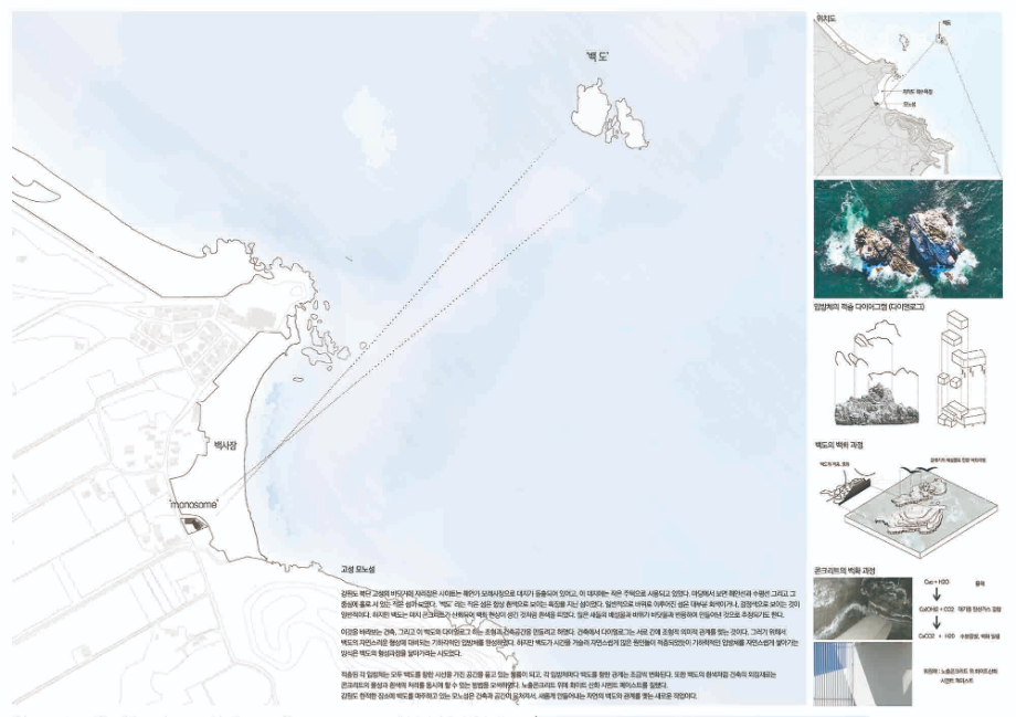 강원도 한적한 장소에 백도를 마주하고 있는 '모노섬'은 건축과 공간이 뭉쳐져서, 새롭게 만들어내는 자연의 백도와 관계를 맺는 새로운 작업이다.◼︎