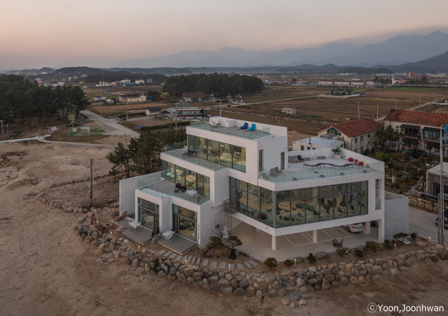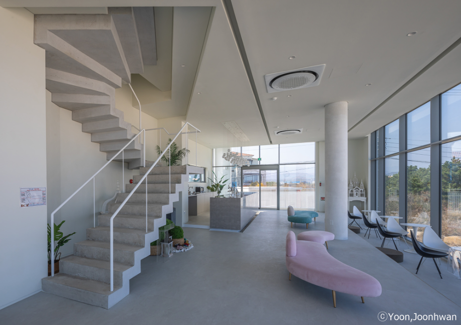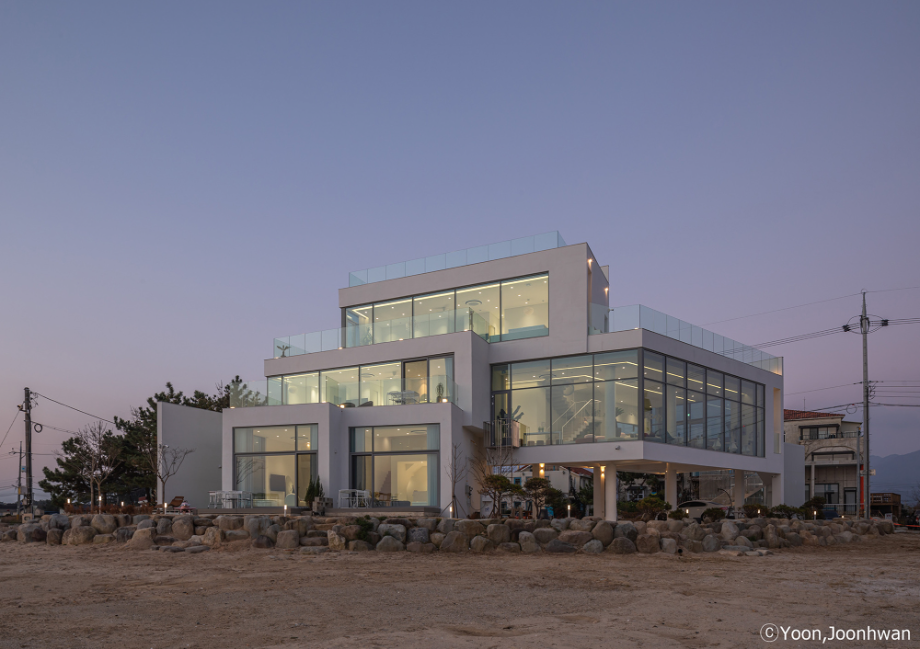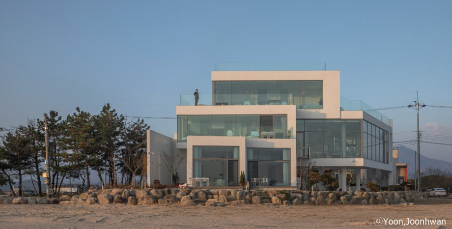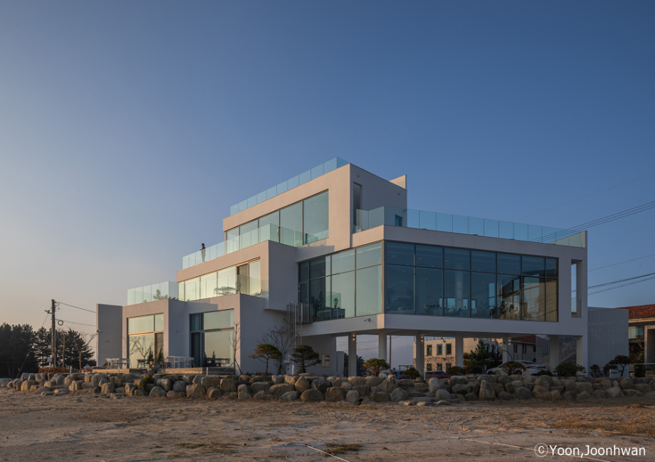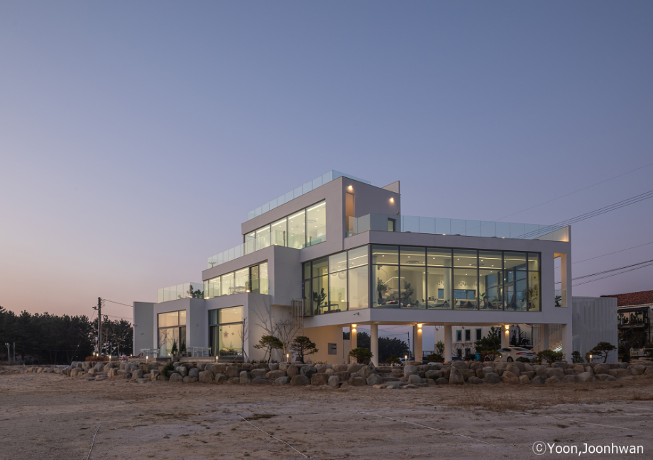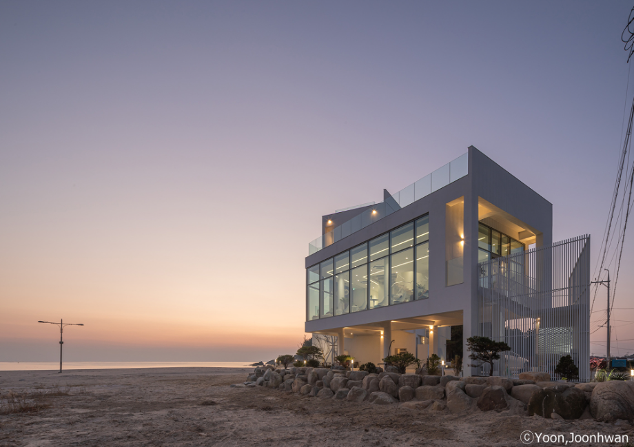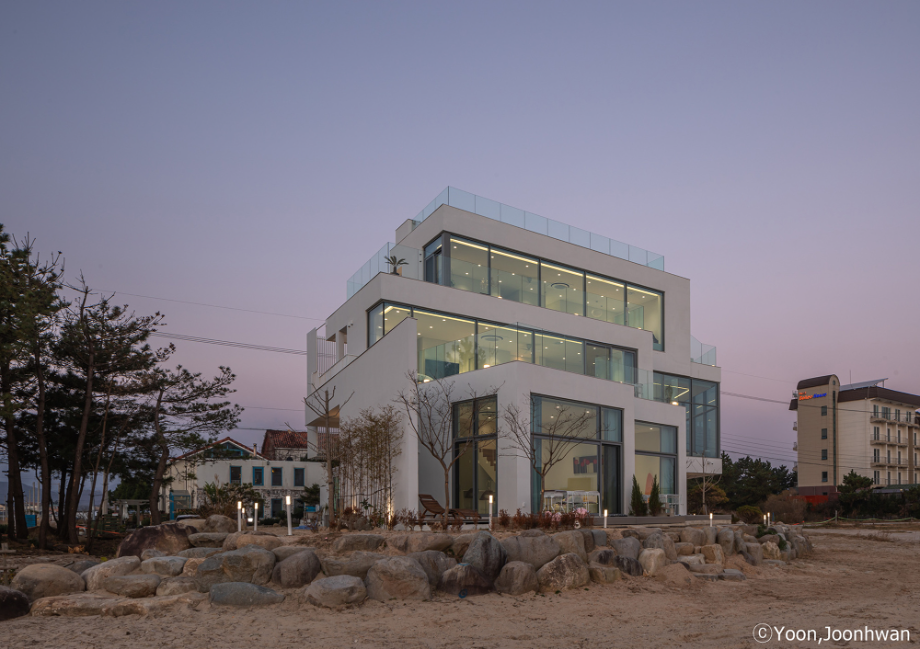 적층된 각 입방체는 모두 백도를 향한 시선을 가진 공간을 품고 있는 볼륨이 되고, 각 입방체마다 백도를 향한 관계는 조금씩 변화된다. 또한 백도의 흰색처럼 건축의 외장재료는 콘크리트의 물성과 흰색의 처리를 동시에 할 수 있는 방법을 모색했다. 노출콘크리트 위에 화이트 산화 시멘트 페이스트를 칠했다.