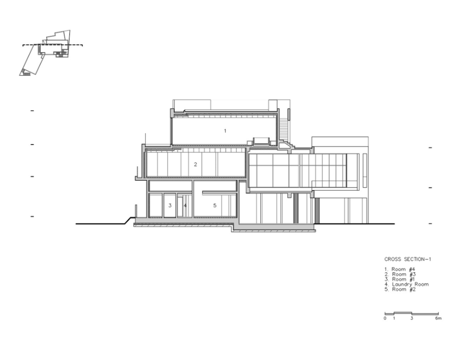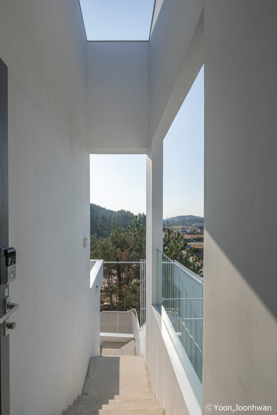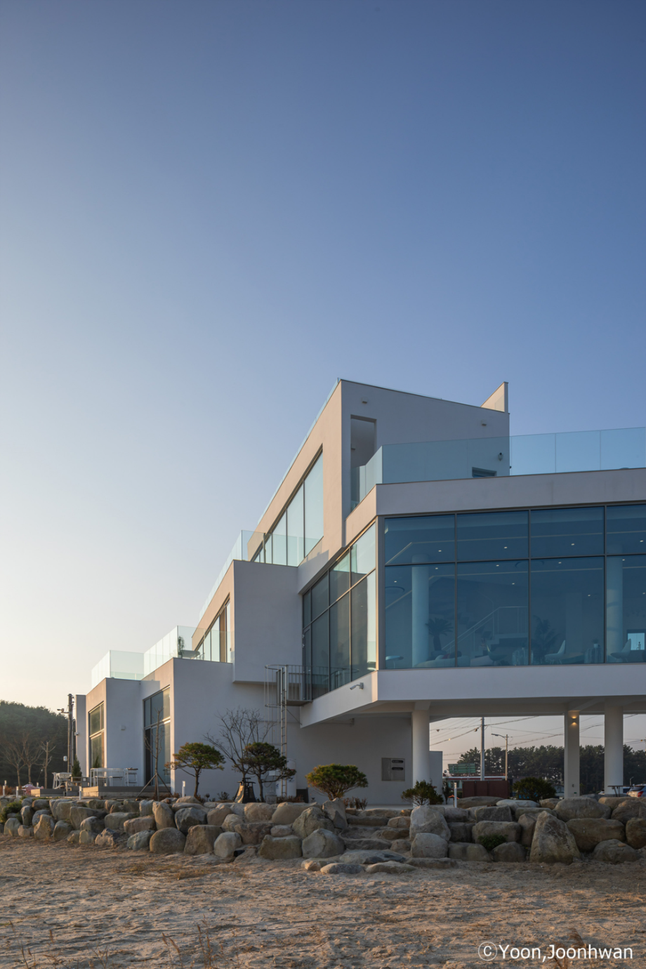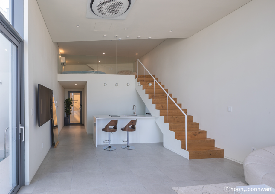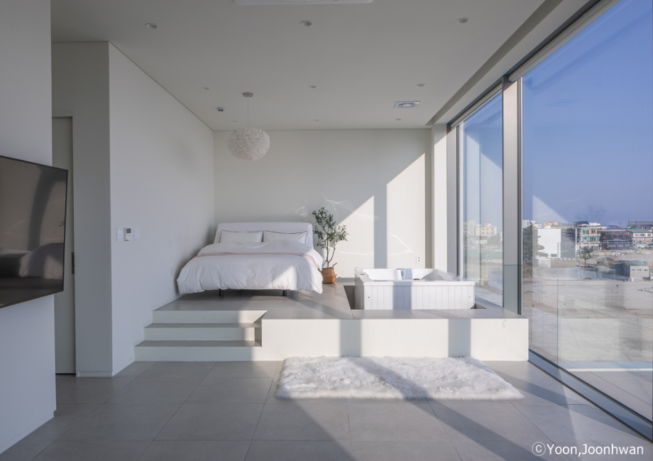 적층된 각 입방체는 모두 백도를 향한 시선을 가진 공간을 품고 있는 볼륨이 되고, 각 입방체마다 백도를 향한 관계는 조금씩 변화된다. 또한 백도의 흰색처럼 건축의 외장재료는 콘크리트의 물성과 흰색의 처리를 동시에 할 수 있는 방법을 모색했다. 노출콘크리트 위에 화이트 산화 시멘트 페이스트를 칠했다.