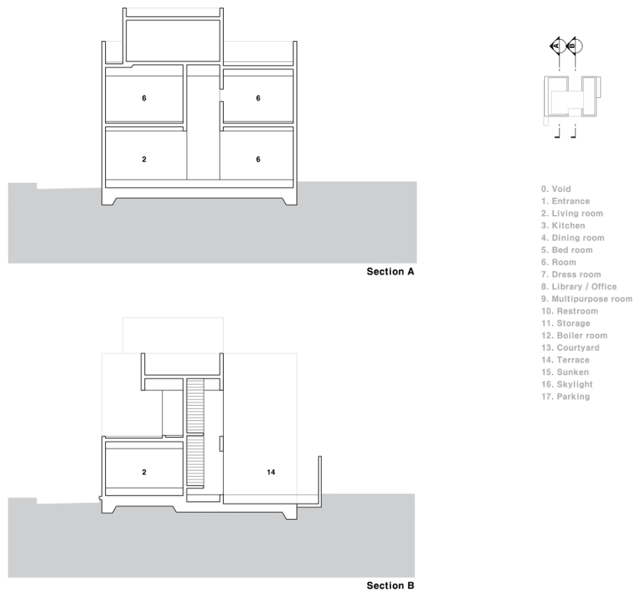 대지의 북측이 도로에 접해 있고, 동측의 레벨이 낮은 이유로 동측에 주차장을 배치하고, 건물을 가능한 높은 쪽인 서측에 위치하도록 했다. 서측에는 2개층의 오픈 공간을, 동측에는 2층에 실외 오픈 공간을 만들어 건물의 모든 공간에 자연광이 유입되고 있다.