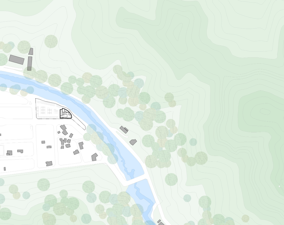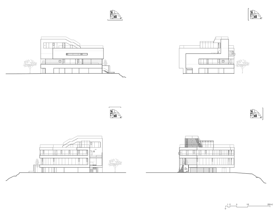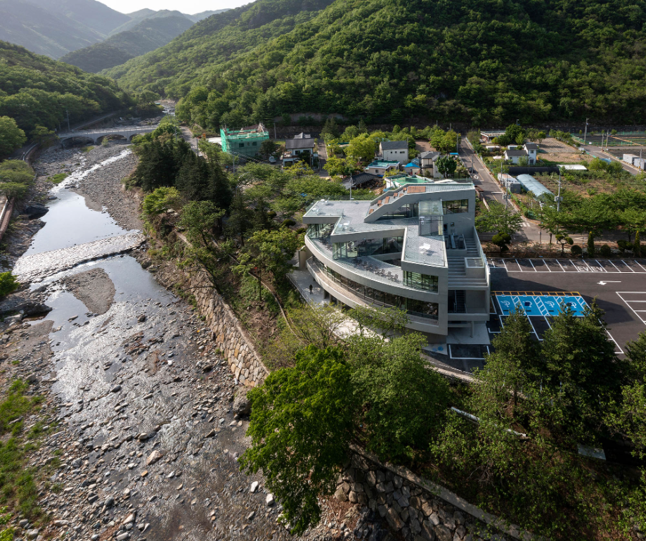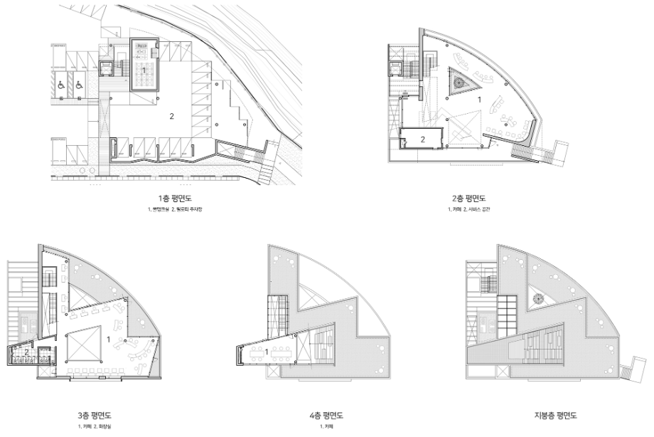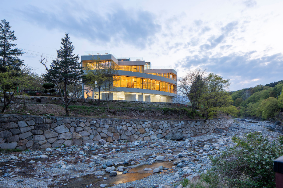 우선, 계곡과 산의 지형을 따라 매스는 곡면의 형상을 취하면서 자연과 접하는 표면적이 최대한으로 자리 잡도록 했다. 그 위로는 사선형 요철 매스를 적층시킴으로써 아래층의 곡면과 대비가 되어지면서, 자연을 접하는 다양한 경관의 가능성을 열어주고자 했다.