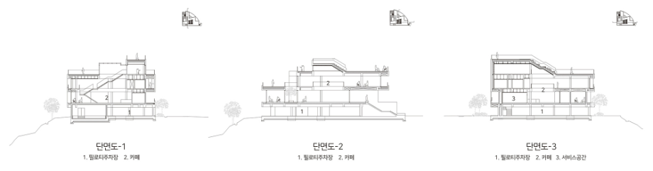 각 층은 매스의 변화에 따라 다른 공간감을 가지게 되고 내/외부로 이어져 자연과 조우하는 다양한 경험이 이루어지는 장소가 된다.