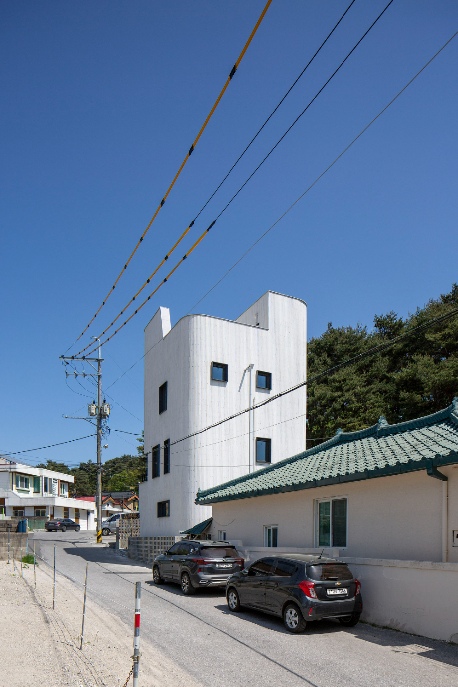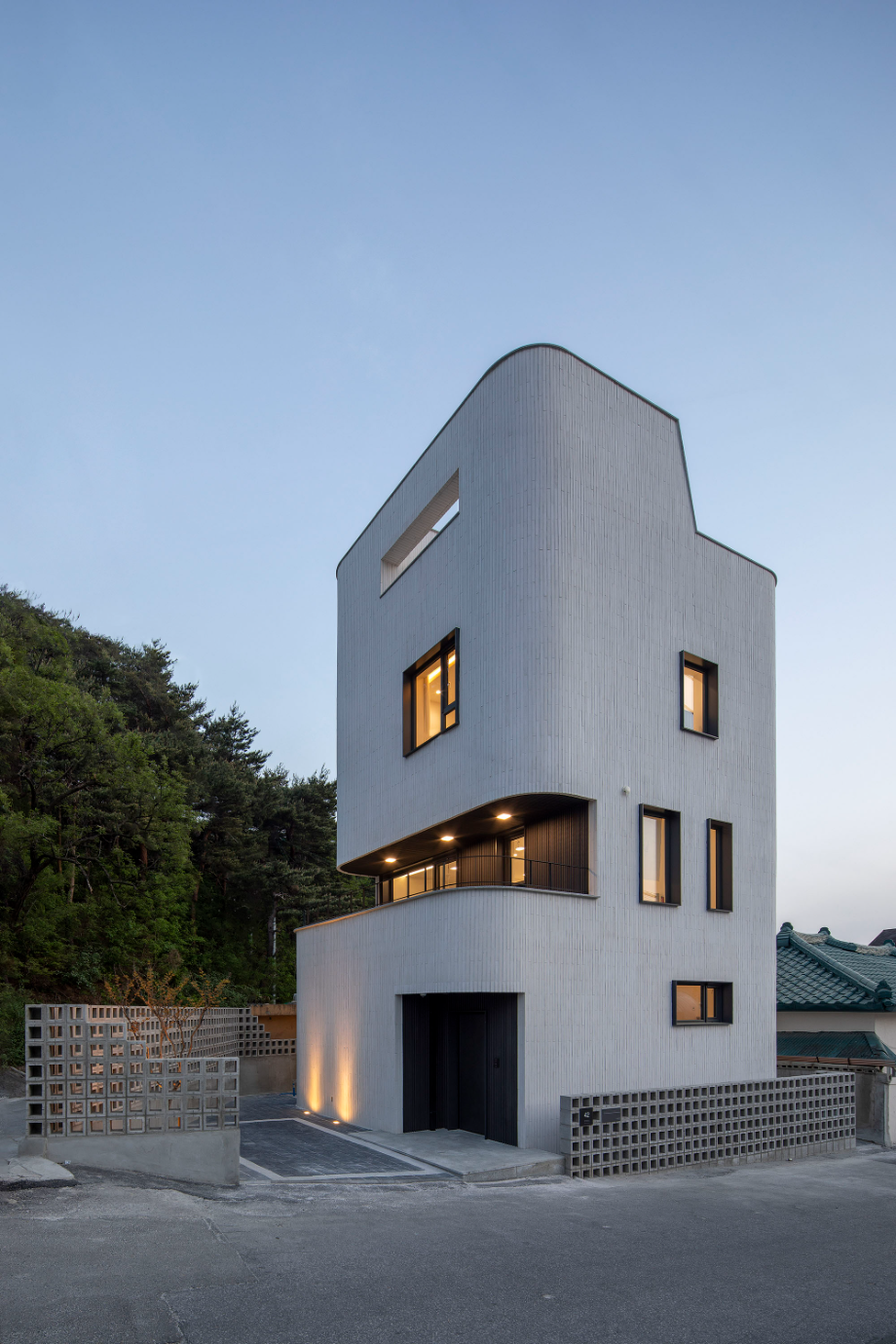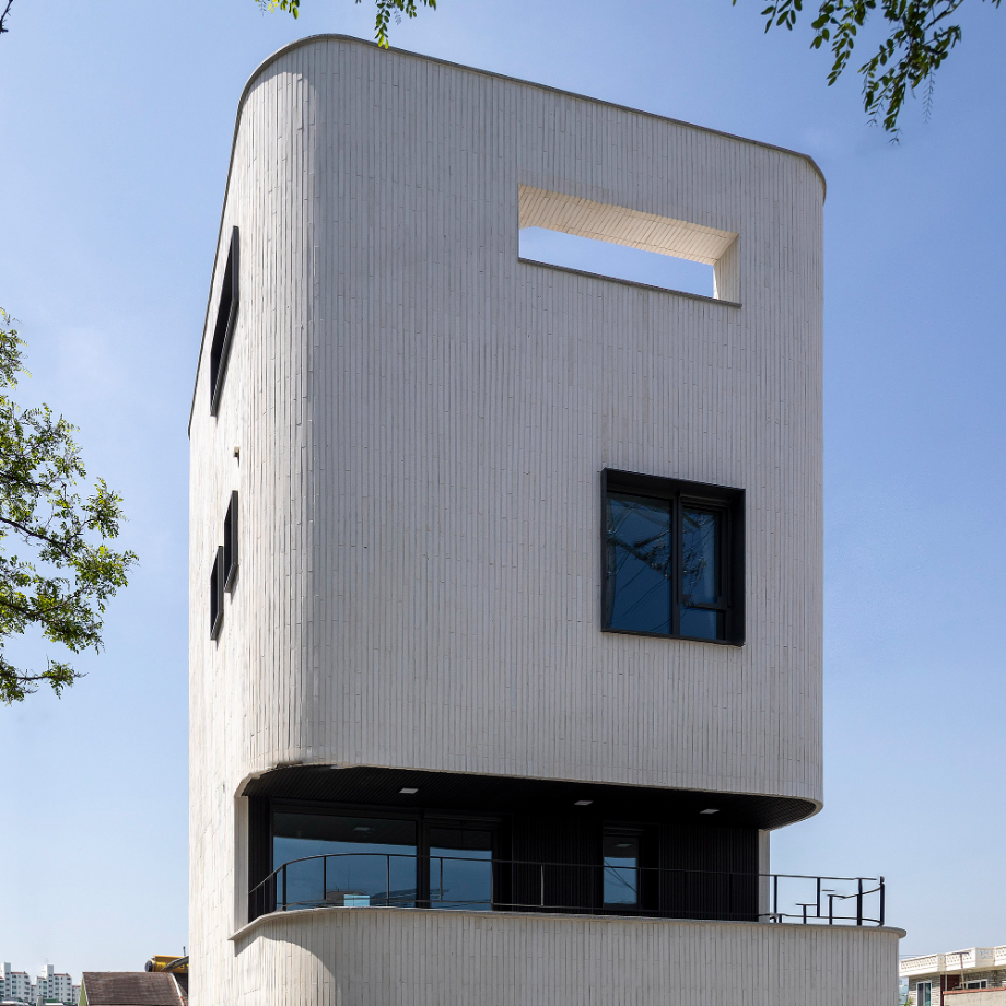 곡면을 사용한 단순한 수직적 볼륨은, 건물의 형태적 아이덴티티를 가지며 주변의 자연과 어우러지도록 구성했다.