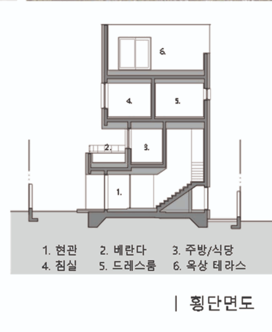 얕은 바위산인 '너래바위'가 옆에 위치하는 등 좋은 환경을 가지고 있지만, 일반적으로 기대하는 마당이 있는 단독주택을 짓기에는 작은 대지이다. 수직적 구성의 주거형식이 대지의 잠재력을 끌어내고 딩크인 건축주의 다양한 라이프스타일을 담아낼 수 있을 것으로 생각했다.