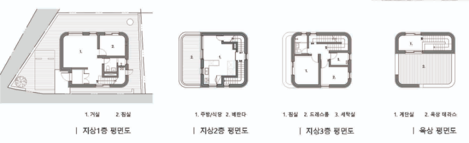 각 층은 거실영역, 주방영역, 침실영역, 마당영역으로 이루지는데, 각 영역은 높이와 구성에 따라 서로 다른 방향의 시각적 소통을 한다. 1층은 뒷마당을 향하고, 2층은 너래바위를 품으며, 3층은 강릉 시내를 내려다보고, 4층은 하늘을 향하여 열린 공간이 된다.