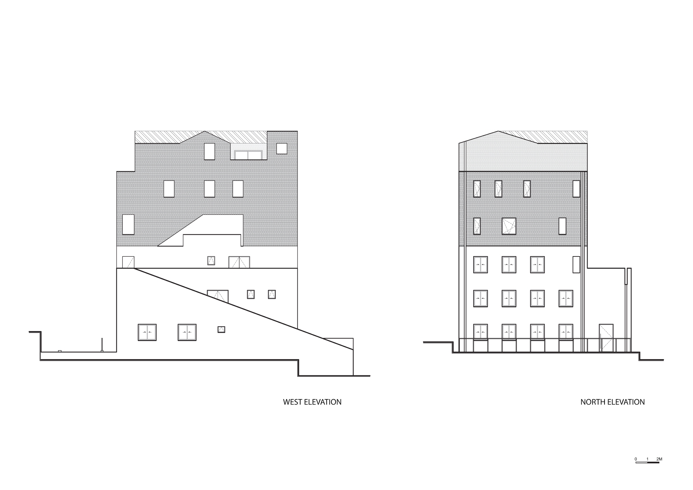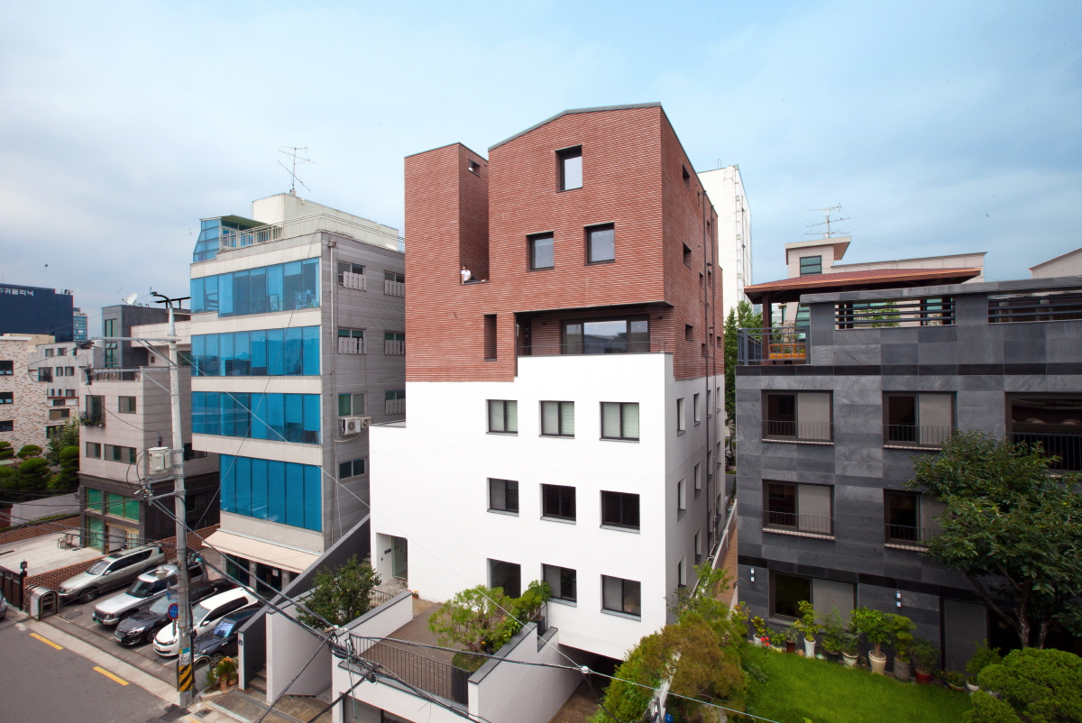 1층 상가, 중간층 임대, 최상층 건물주의 주거로 이루어진 일반적인 임대 건물들은 최대한의 면적을 확보하기 위해 획일화된 상자 모양으로 계획되어 왔다. 이런 건물들이 단독주택지 골목의 주인공으로 나서면서 마을이 가진 온건한 밀도와 이미지가 저해되는 문제가 벌어지고 있었다. 우리는 건축주 가족이 거주할 단독주택과 임대용 사무실을 결합하여, 간섭을 최소화하면서도 함께 공유공간을 사용할 수 있는 건물을 설계하는데 초점을 맞추었다. 상업 및 업무시설을 이용하는 사람들과 주택에 거주하는 사람들이 한 건물에서 공존하기 위해서는 주차, 소음, 공유공간의 활용 등 함께 살기 위한 규칙이 반영된 건물이 필요했다. 또한, 아파트를 축소해놓은 듯한 획일적 주택 평면에서 벗어나서, 조부모님이 오랫동안 거주했던 마당과 나무가 있던 옛집의 공간과 추억을 신축건물에 반영하는 것으로 계획의 방향을 정했다.