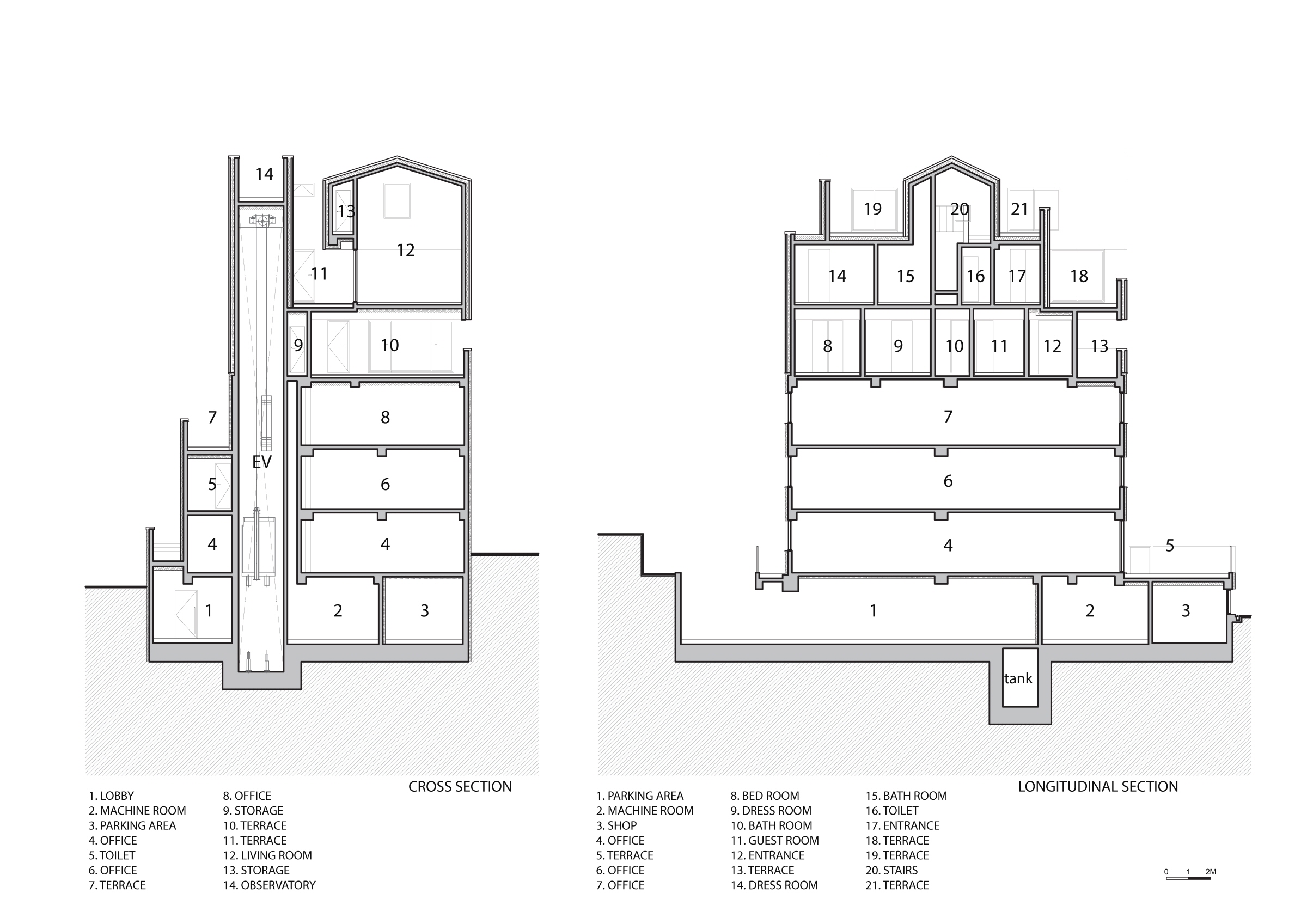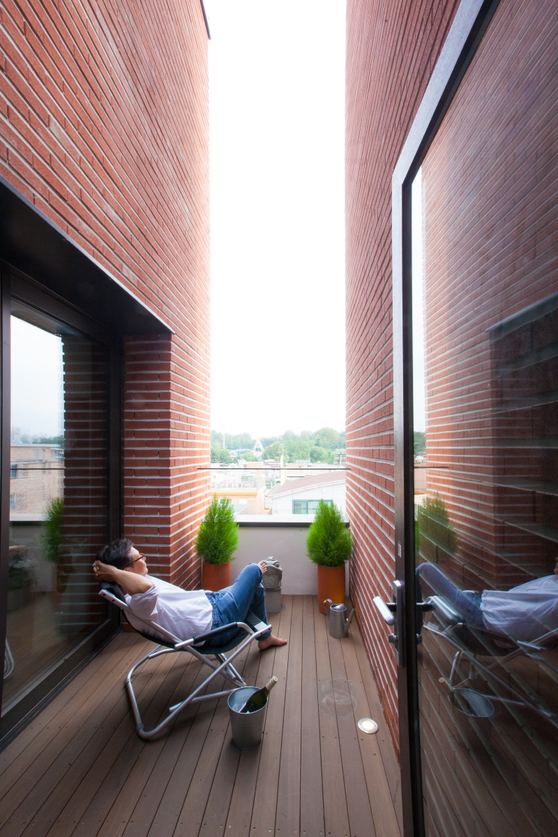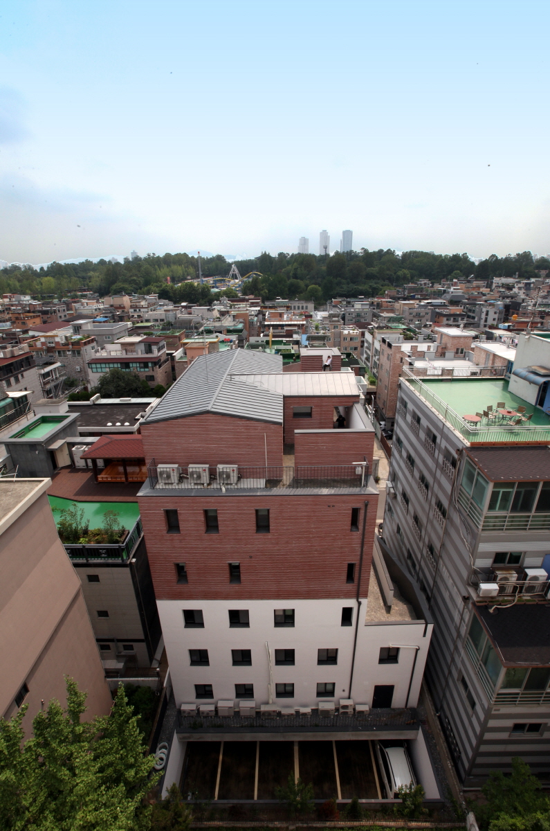 이를 위해, 우리는 외부공간을 가진 단독주택을 임대용 사무실건물의 옥상에 '쌓아 올리는' 건축 개념을 제안했다. 저층부에는 임대용 시설을 위한 효율적인 평면을 계획하고 상층부에는 마당과 테라스를 가진 단독주택의 장점을 살려서, 마치 2개의 건물이 수직적으로 결합된 형태의 건물을 계획했다. 땅이 가진 장점 중 하나는, 위층으로 올라가면 보이는 어린이 대공원의 숲과 남산타워의 멋진 조망이었다. 상층부에 올려놓은 단독주택은 이러한 주변의 조망을 향해 테라스, 옥상마당, 전망대를 두고 이를 집의 내부공간과 연결하도록 계획했다. 할아버지, 할머니가 독립적인 생활을 하시면서도 가족간의 모임과 집의 관리가 용이하도록, 위층의 아들 가족의 주택과 연결되는 동선을 테라스 공간으로 계획하였다. 자녀들의 방 앞에는 각자 옥상 마당을 하나씩 두고 자연채광이 실내로 들어오도록 했다.