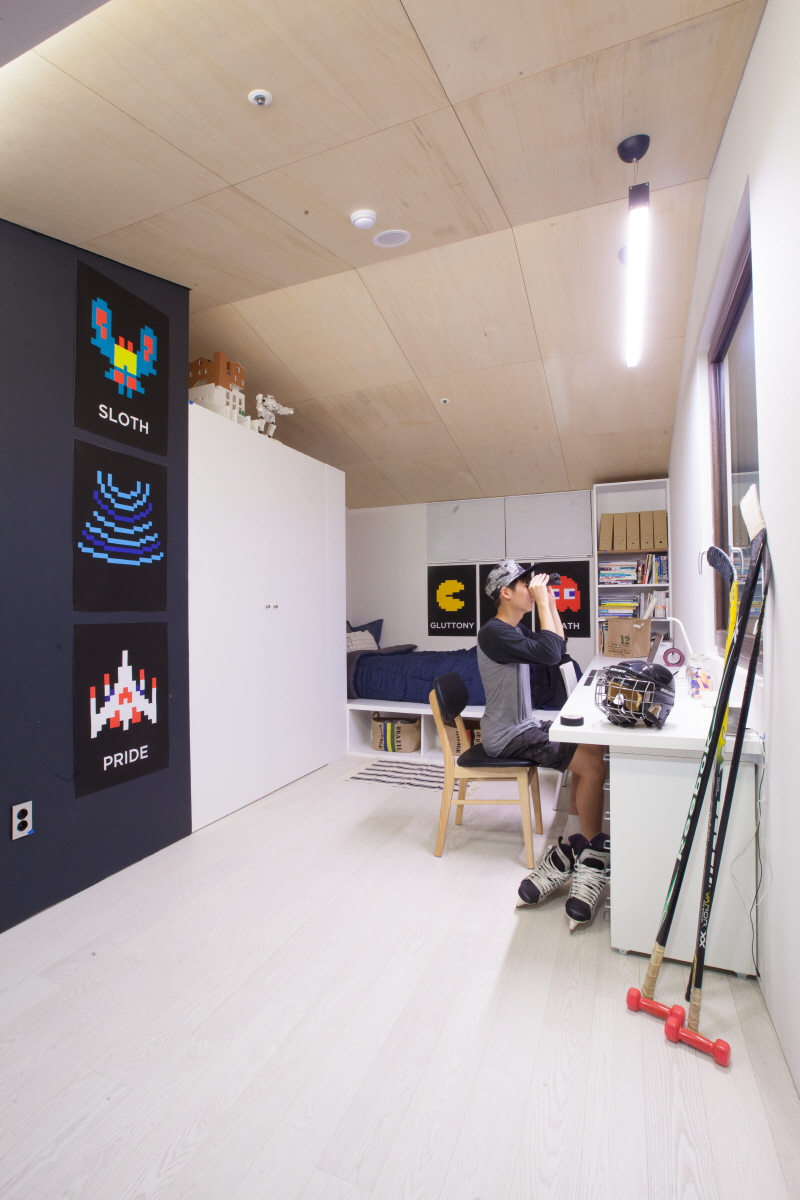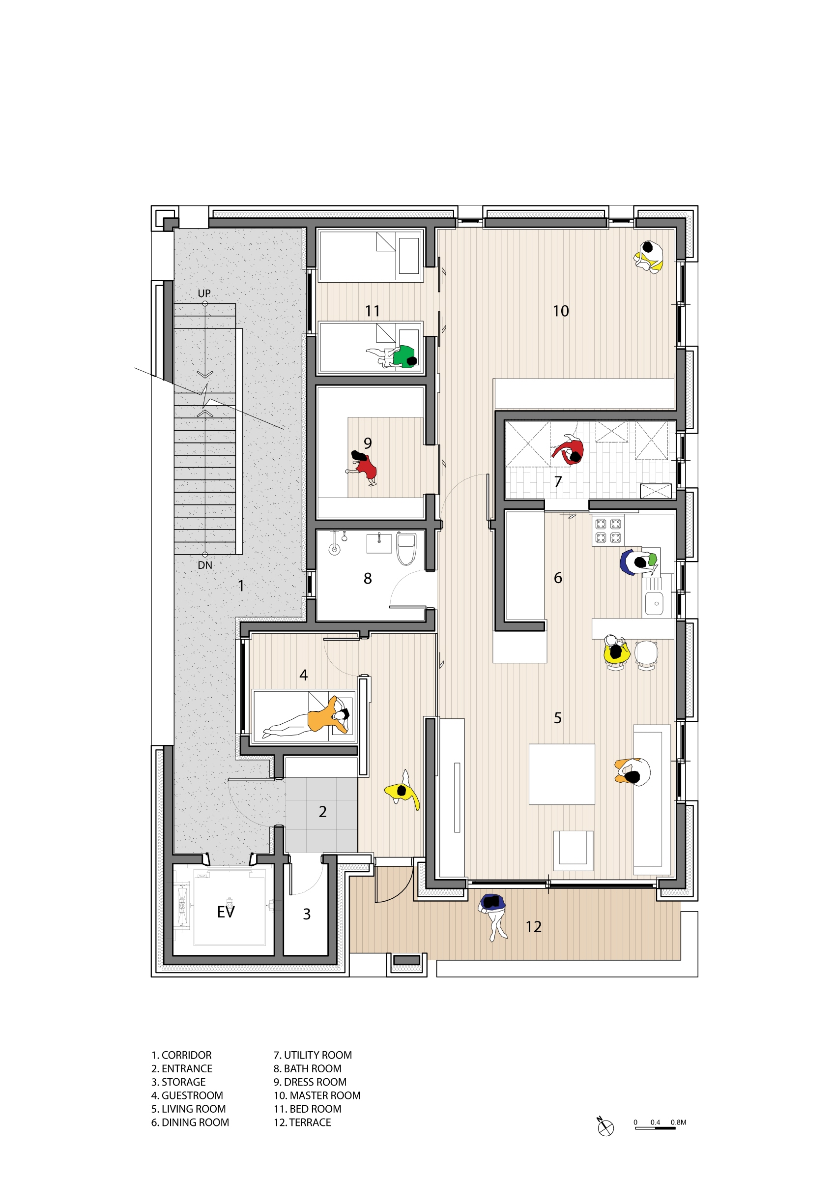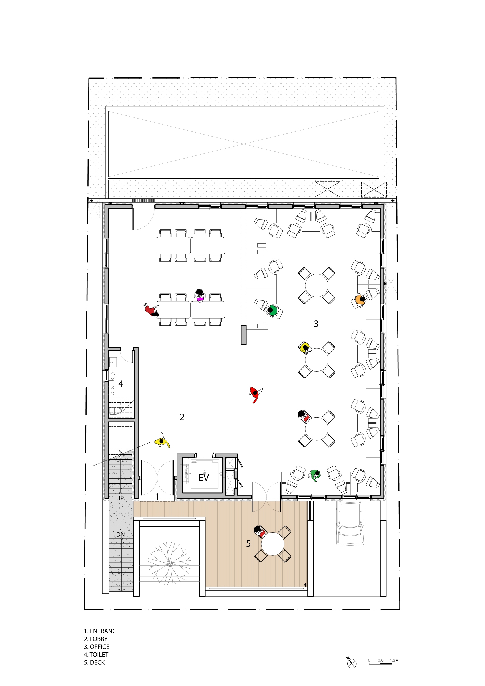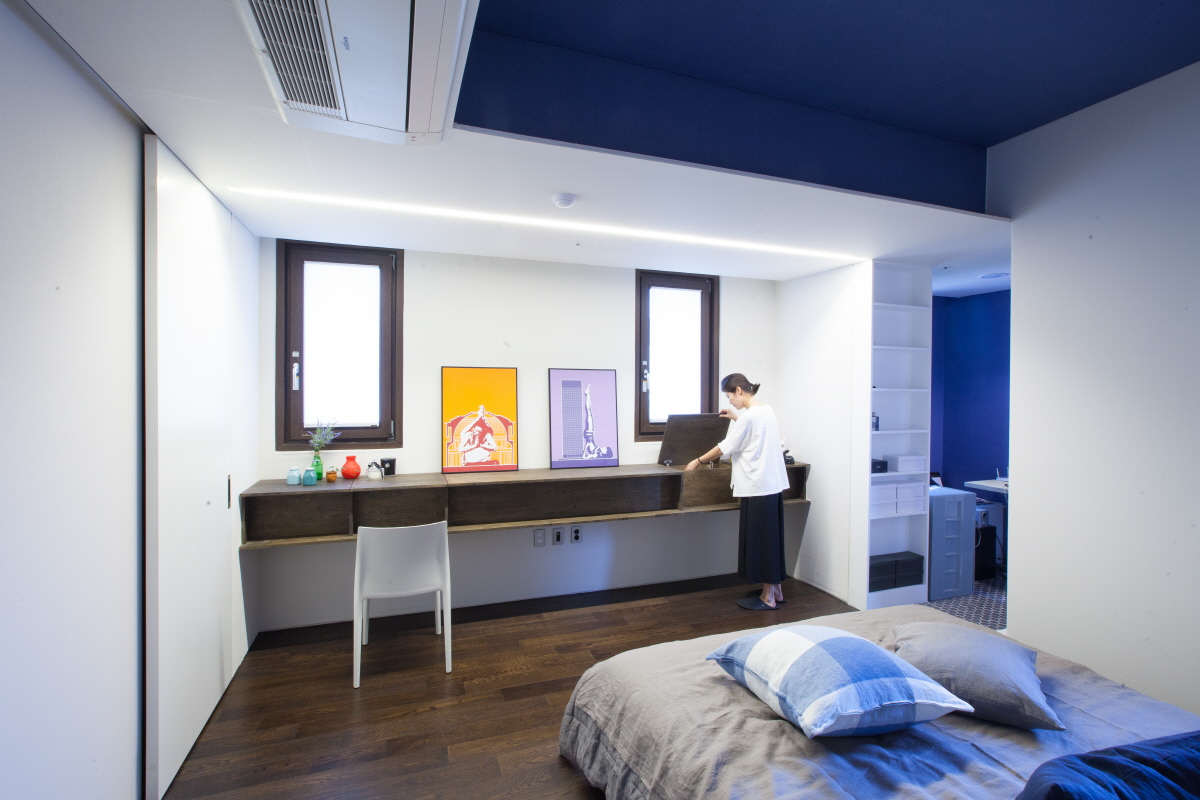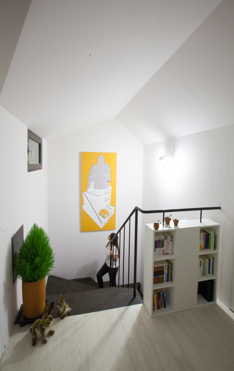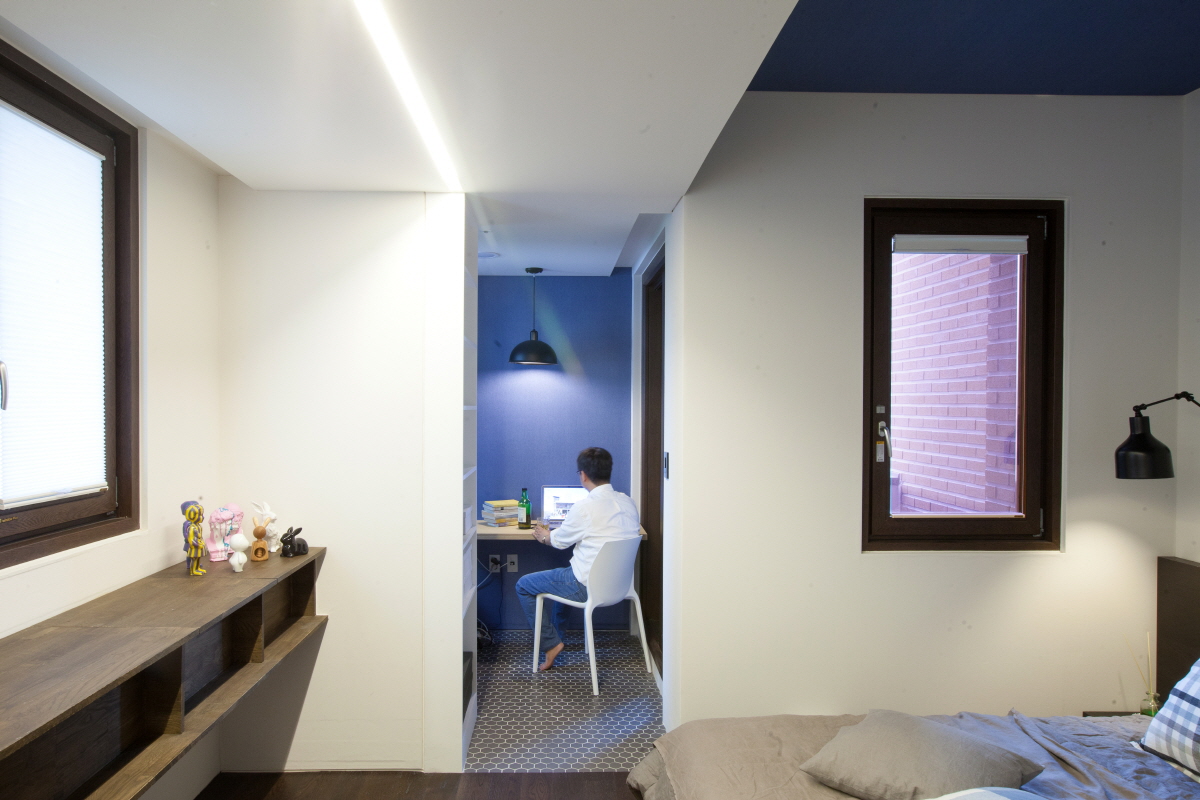 거주자와 임대인들이 서로 만나는 로비, 외부계단, 주차장은 잠깐이라도 서로 인사하고 안부를 물을 수 있는 공간이지만, 임대 효율을 위해 좁고 어두운 공간으로 계획되곤 한다. 우리는 건물의 후면 공간에 오프닝을 두어 자연채광이 들어오는 밝은 주차장이 되도록 계획했으며, 주출입구 계단에는 부모님이 마당에 키우시던 모과나무를 옮겨 심어, 마당을 거쳐서 들어가는 단독주택의 이미지를 재현했다. 우편물을 가져갈 수 있는 로비 공간에는 유쾌한 색채로 실내를 꾸며, 입주자들이 하나의 건물을 나누어 쓰고 있다는 일체감을 느끼도록 했다.