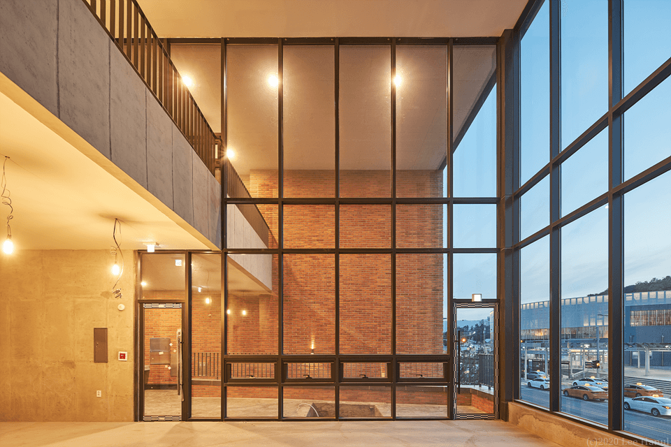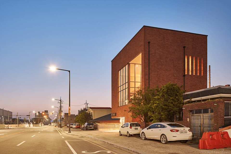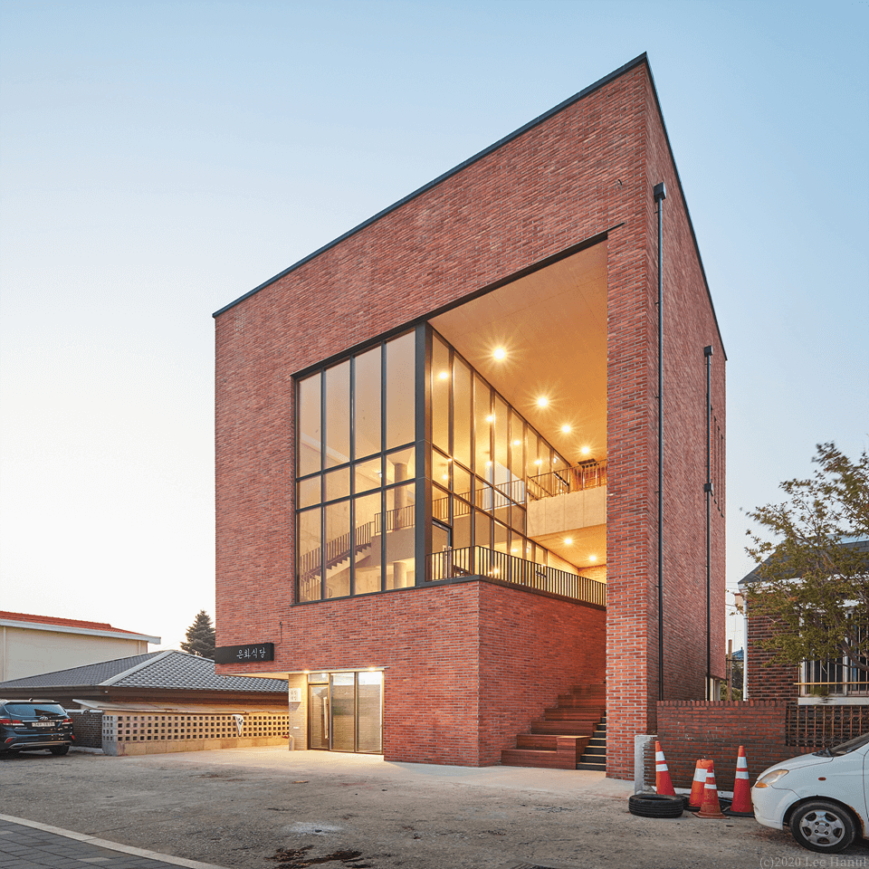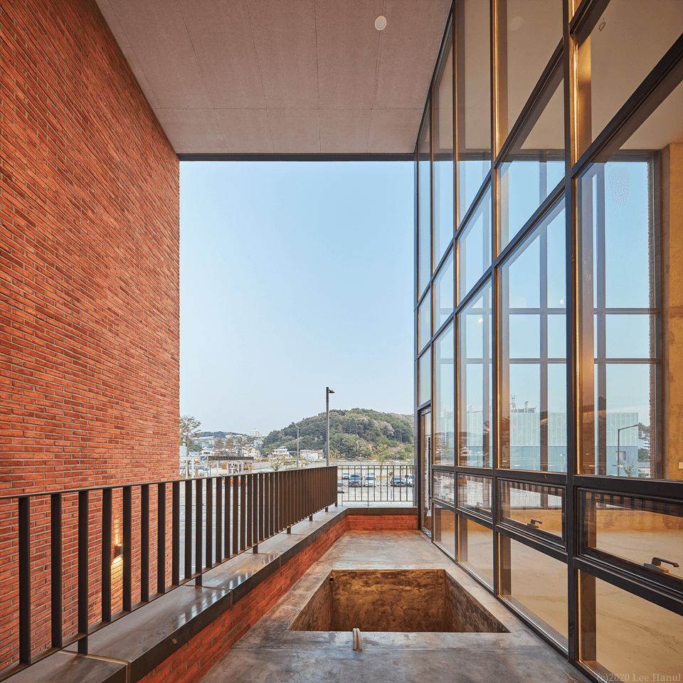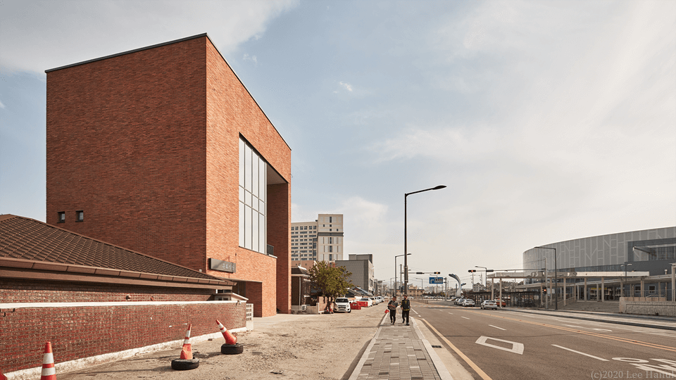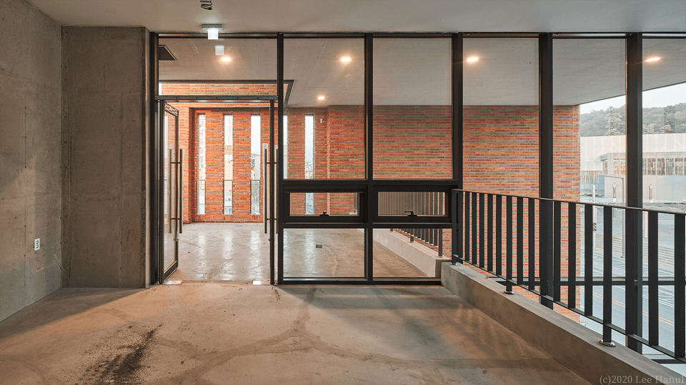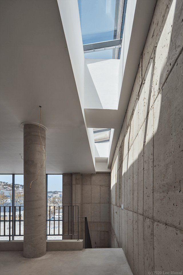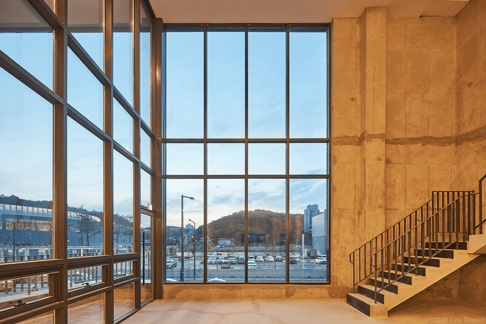 필지의 모양은 그대로 용적을 채워 3개 층의 기하학이 형성된다. 여기서 기하학은 행위를 규정짓는 추상적 기하학이 아니라 상업적 행위의 유동성과 변화를 담으면서, 계속해서 도시풍경과 관계에서 조직되어 대지 내에 느슨한 기하학적 장소를 생성하고 있다. 앞뒤의 두 길에 접한 필지지만 풍경을 경험하는 도시 스케일에 차이가 있다. 1층은 뒷 골목길의 풍경을 그대로 경험되는 방식으로 골목길 쪽으로 개방되어 있다. 넓은 전면도로에서는 좁은 진입을 하지만 좁은 뒤 골목길에서는 넓은 개방의 실을 만나게 되는 것이다. 2,3층은 강릉역 풍경과 주변 도시풍경을 건물 안에서 바라볼 수 있다. 여기서 기존의 창의 개념은 도시적 스케일로 확장된다. 건물 전체가 도시풍경을 담아내는 창이자 큰 액자가 되는 것이다. 강릉역쪽 풍경 뿐 아니라 뒤쪽 도시풍경까지 담아내는 큰 렌즈 같은 역할을 한다.