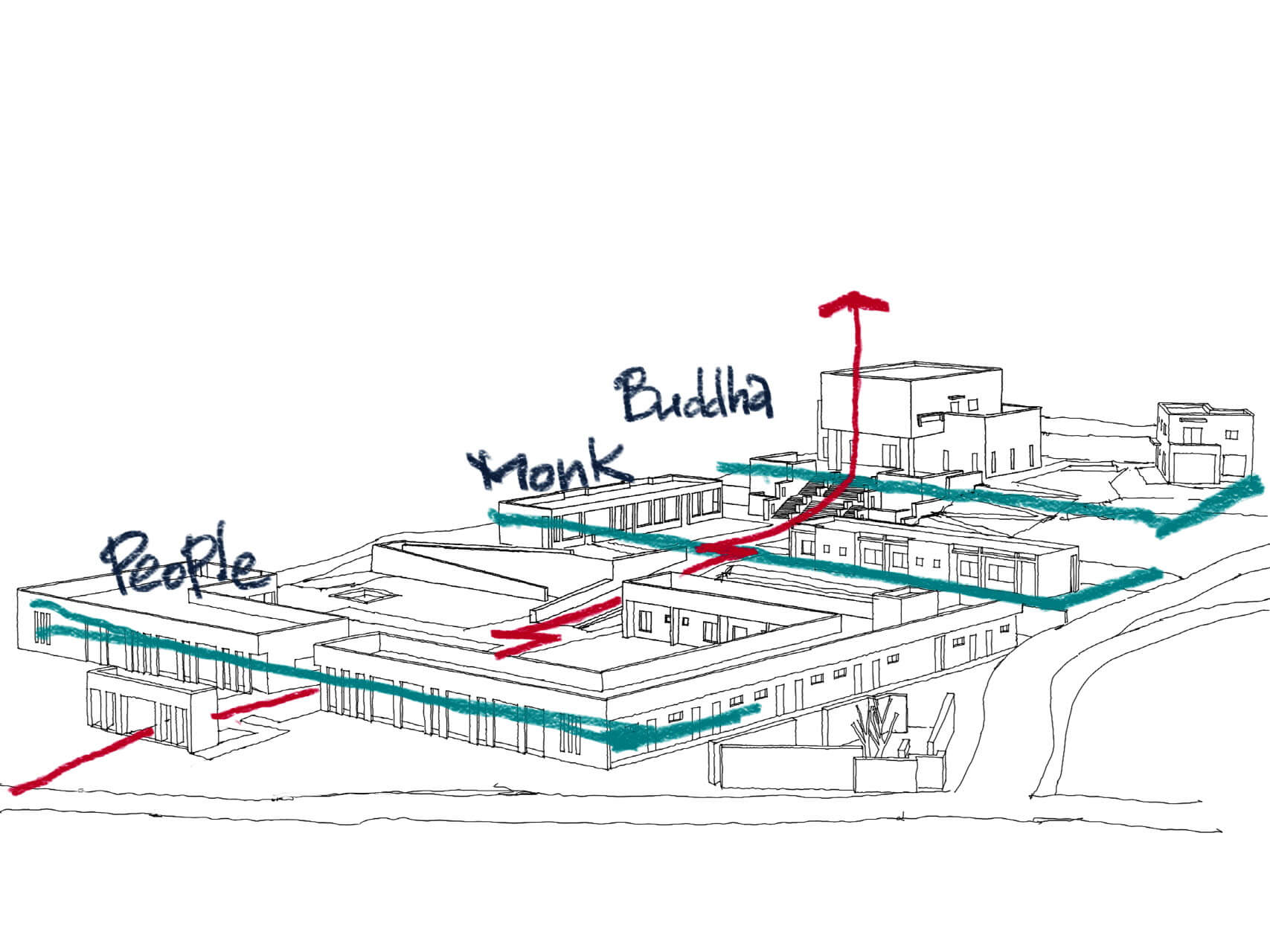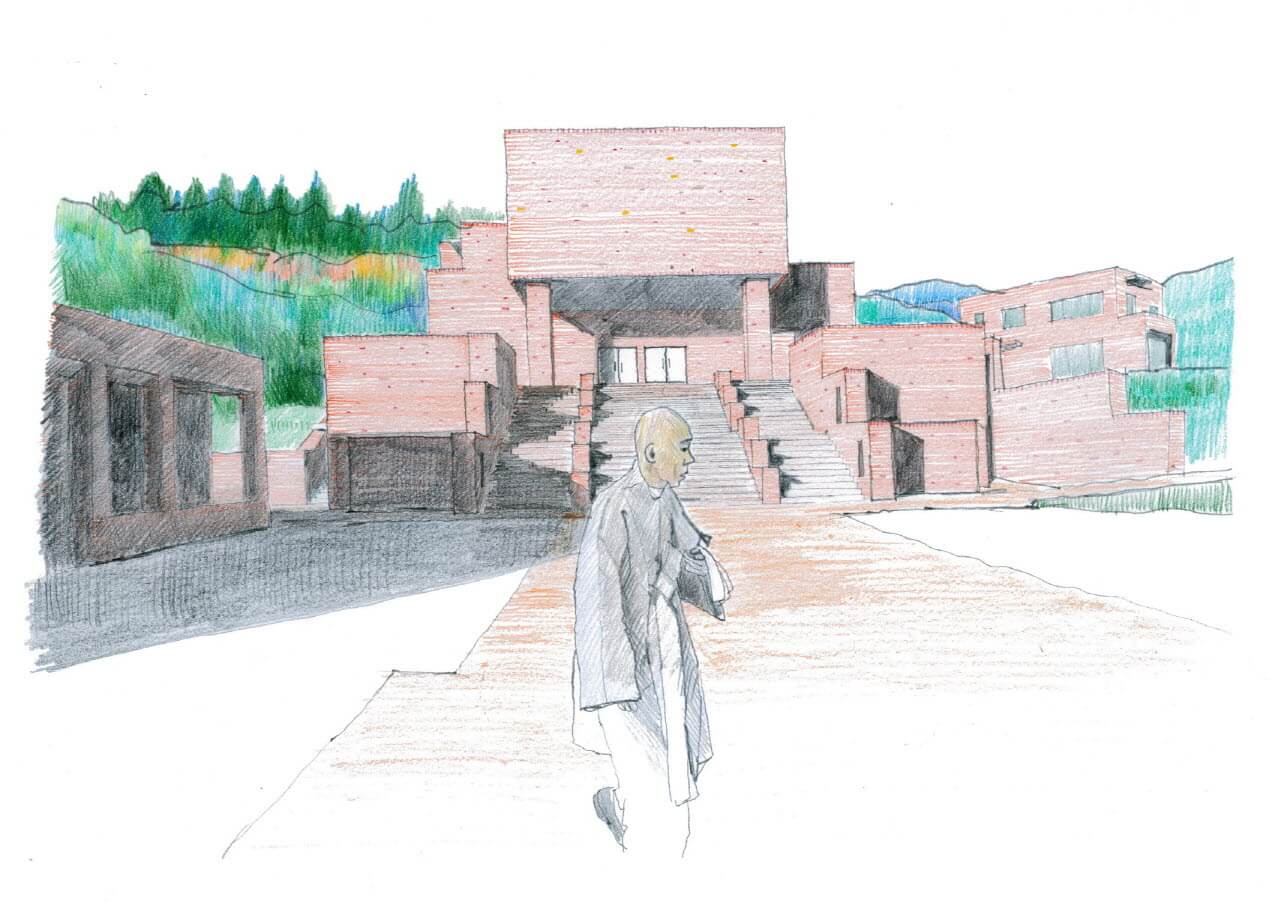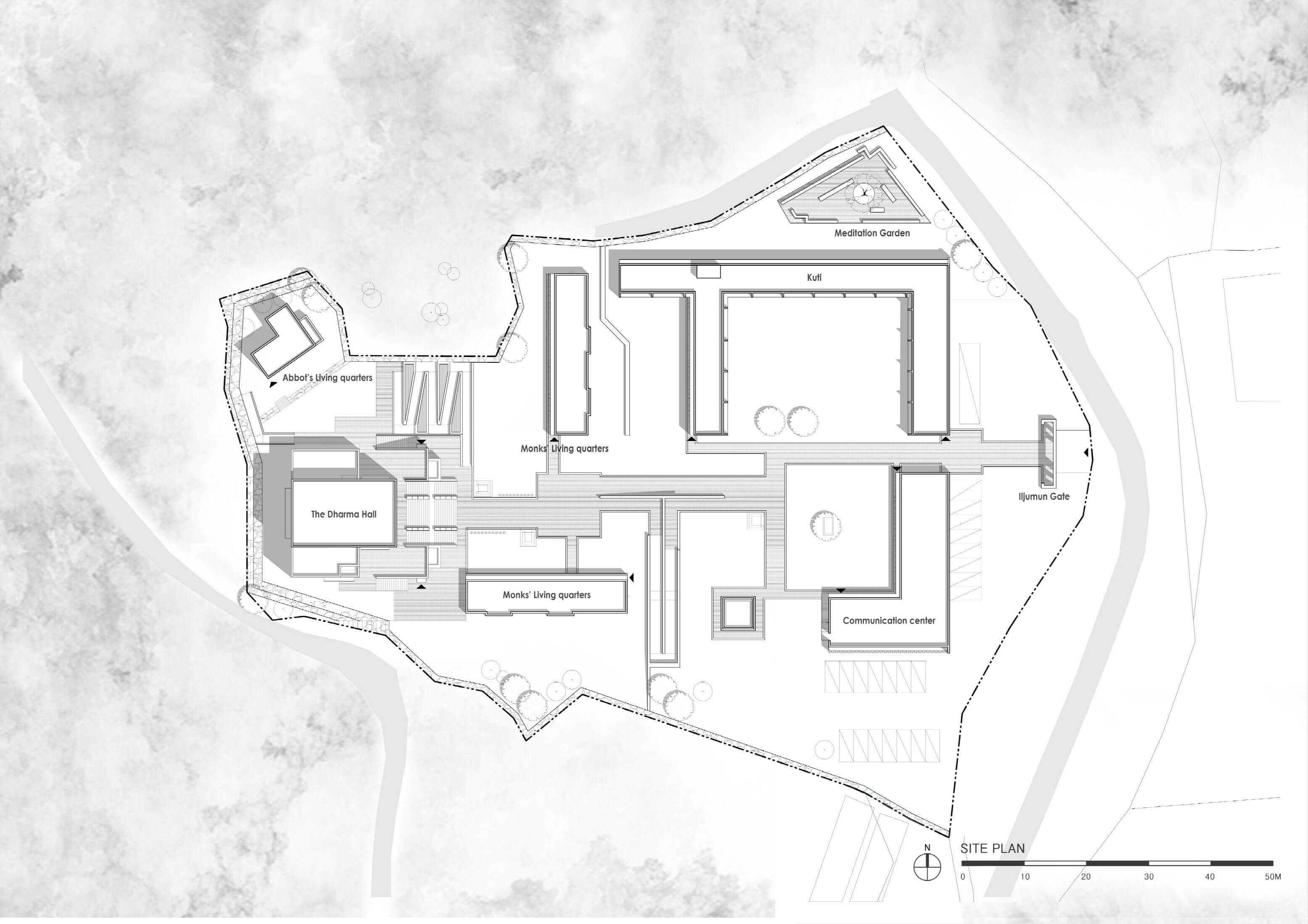 설계가 진행되며 선원장 스님께 불교에 대한 많은 이야기를 듣게 되었다. 스님이 제시하는 설계의 가이드라인 중, 사성제는 ‘고집멸도(苦集滅道)’, 괴로움과 괴로움의 원인과 소멸하는 방법에 대한 고찰이다. 집착을 통한 괴로움에서 벗어나기 위한 수행 공간이므로 사성제가 기본적인 개념이 되어야한다 것이었다. 또한 그중 가장 인상 깊었던 이야기가 ‘중도(中道)’라는 개념이었다. “처음부터 끝까지 즐겁다”. 얼마나 통쾌한 이야기인가. 우리는 이상한 강박 속에서 살고 있다. 즐겁게 산다는 것은 마치 인생을 낭비하는 자세라는, 그런 강박 속에서 사람들은 점점 시들어가는 것이다. 그럴 때 “즐겁게 살아도 돼.”라고 누군가 이야기해준다면 그 얼마나 자유로워질까.