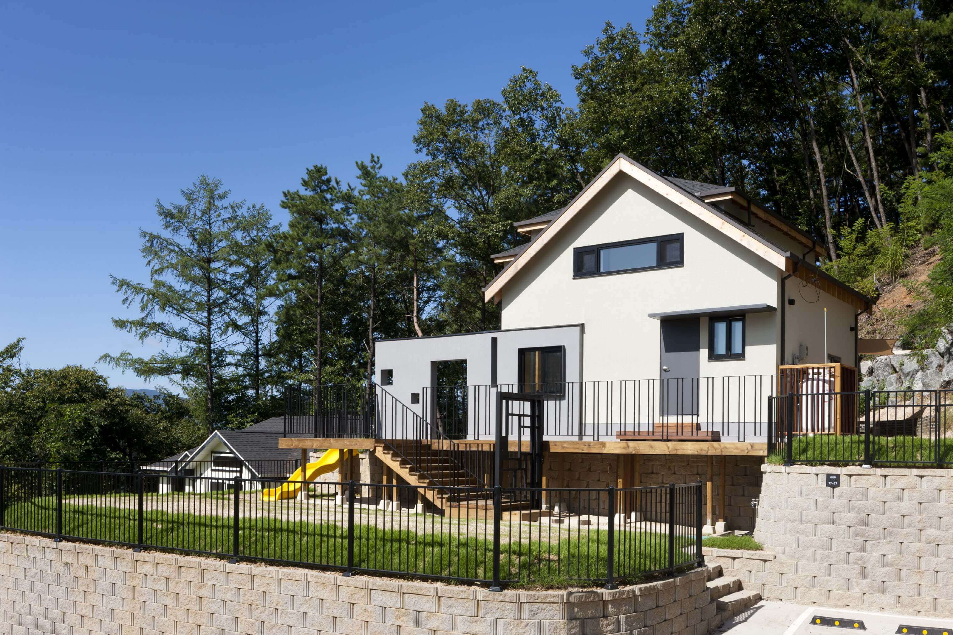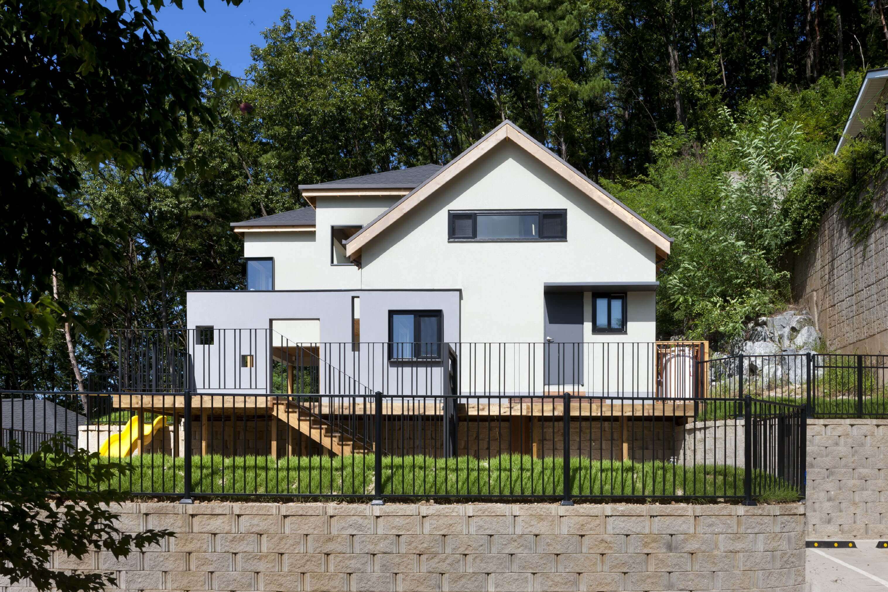 <하온이의 집>이 있는 경기도 양평은, 거주민들이 서울로 출퇴근하기도 가깝고 여가시간과 주말에는 온전히 자연을 즐길 수 있는 지역이다. 하온의 가족은 경치가 좋은 양평의 전원주택지역에 땅을 샀다. 그들은 육아를 위해 재택근무를 하게 된 엄마의 작업공간과 상상력이 풍부한 4살 아이를 위한 놀이공간이 포함된 집을 원했다.
