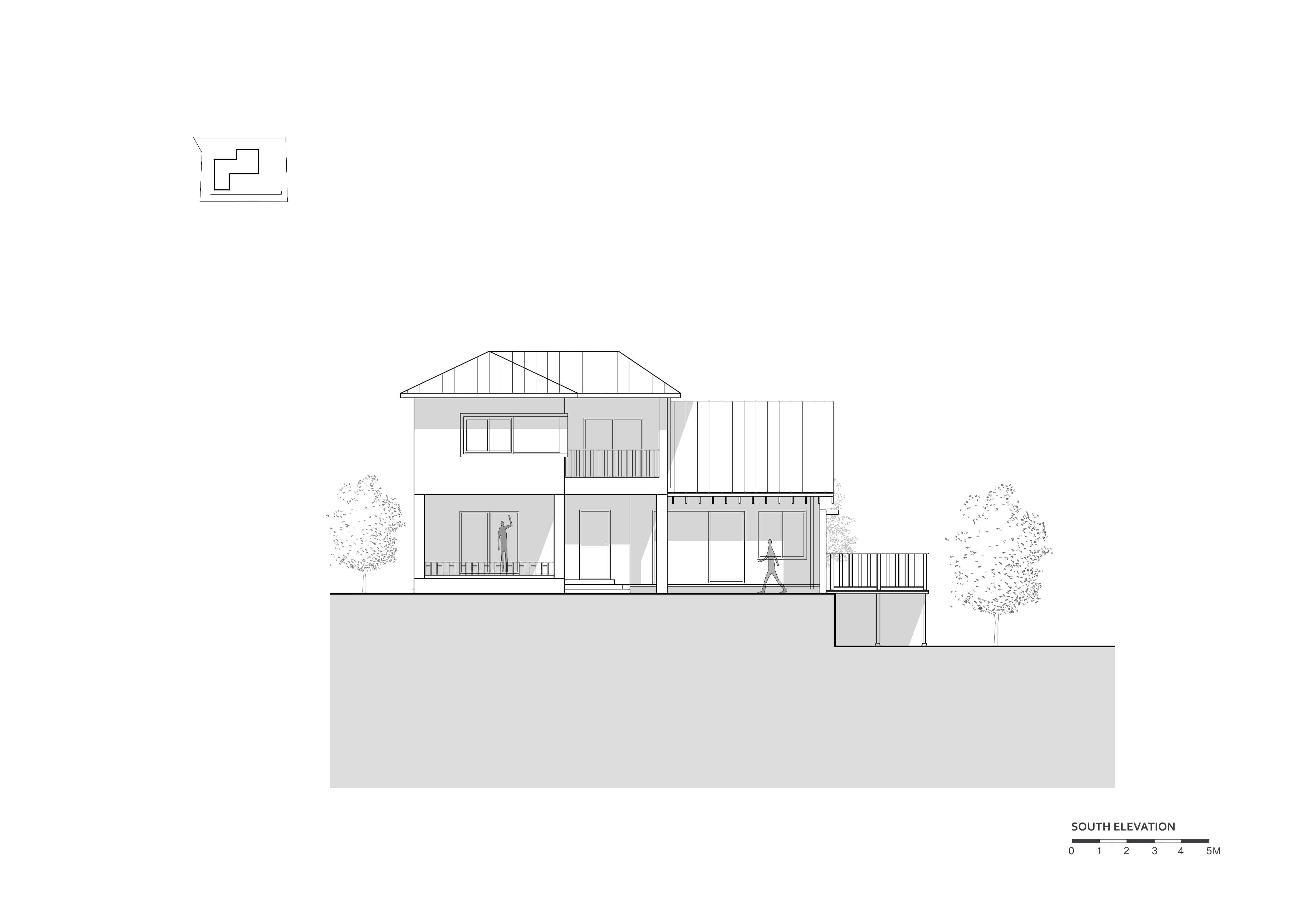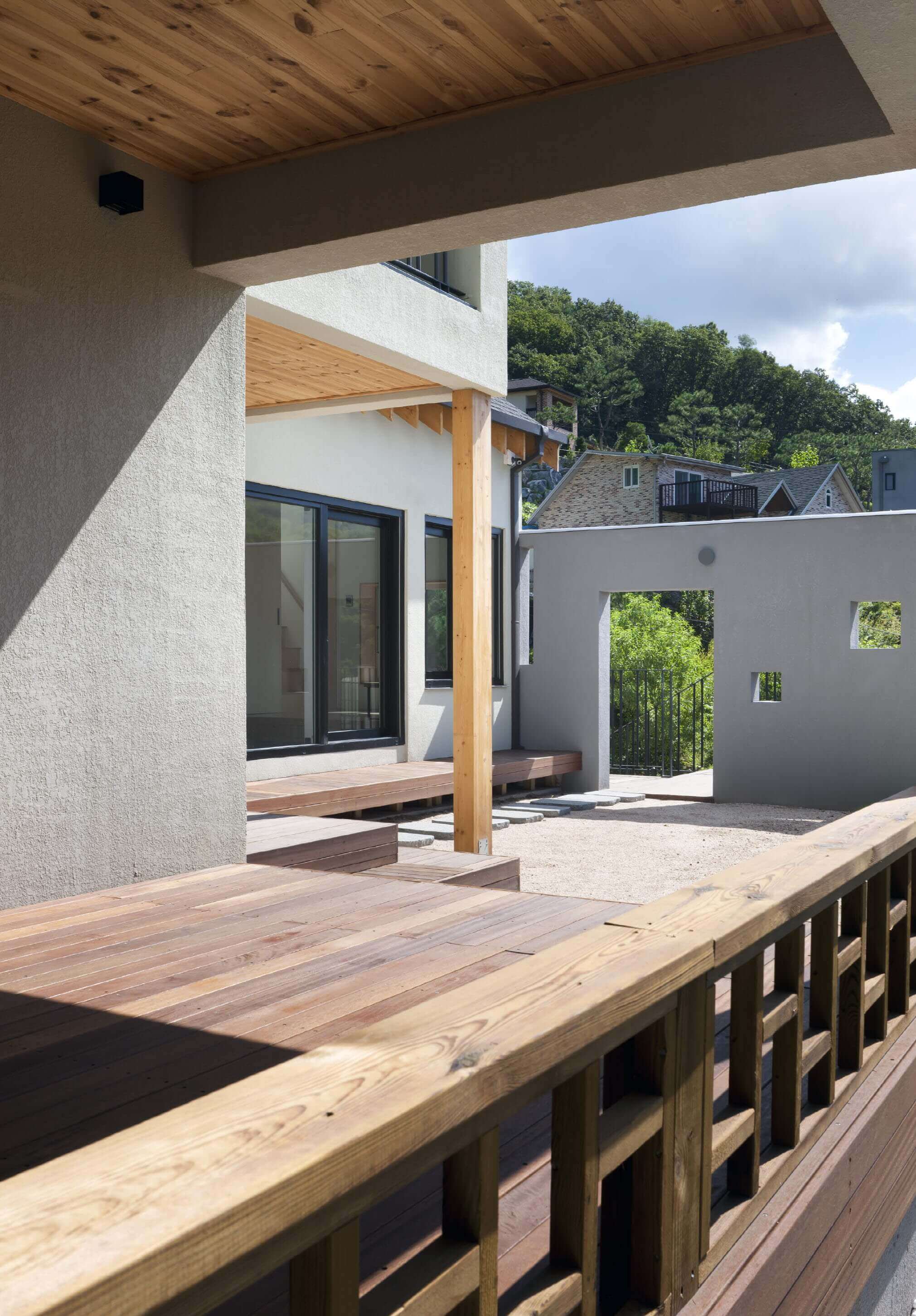 집 지을 땅은 두 개의 레벨로 나뉘어 있었다. 주차장과 집 사이에 걸쳐진 마당에 대문을 두어 외부에서의 접근을 한번 걸러주었다. 집의 외벽에 이어진 날개벽을 지나 들어오면 안마당이 나온다. 손님방과 연결된 아늑한 대청마루가 있어 안마당과 뒷마당을 자연스럽게 연결해준다. 손님들은 집 안으로 깊숙이 들어오지 않고도 외부공간과 마루 등에서 머물 수 있다.