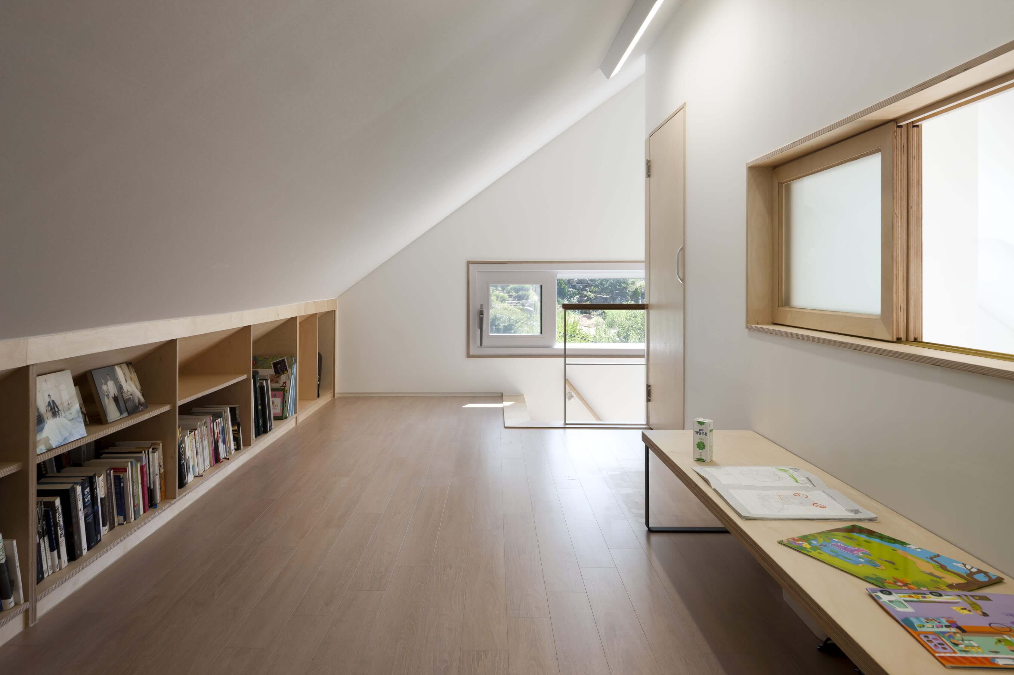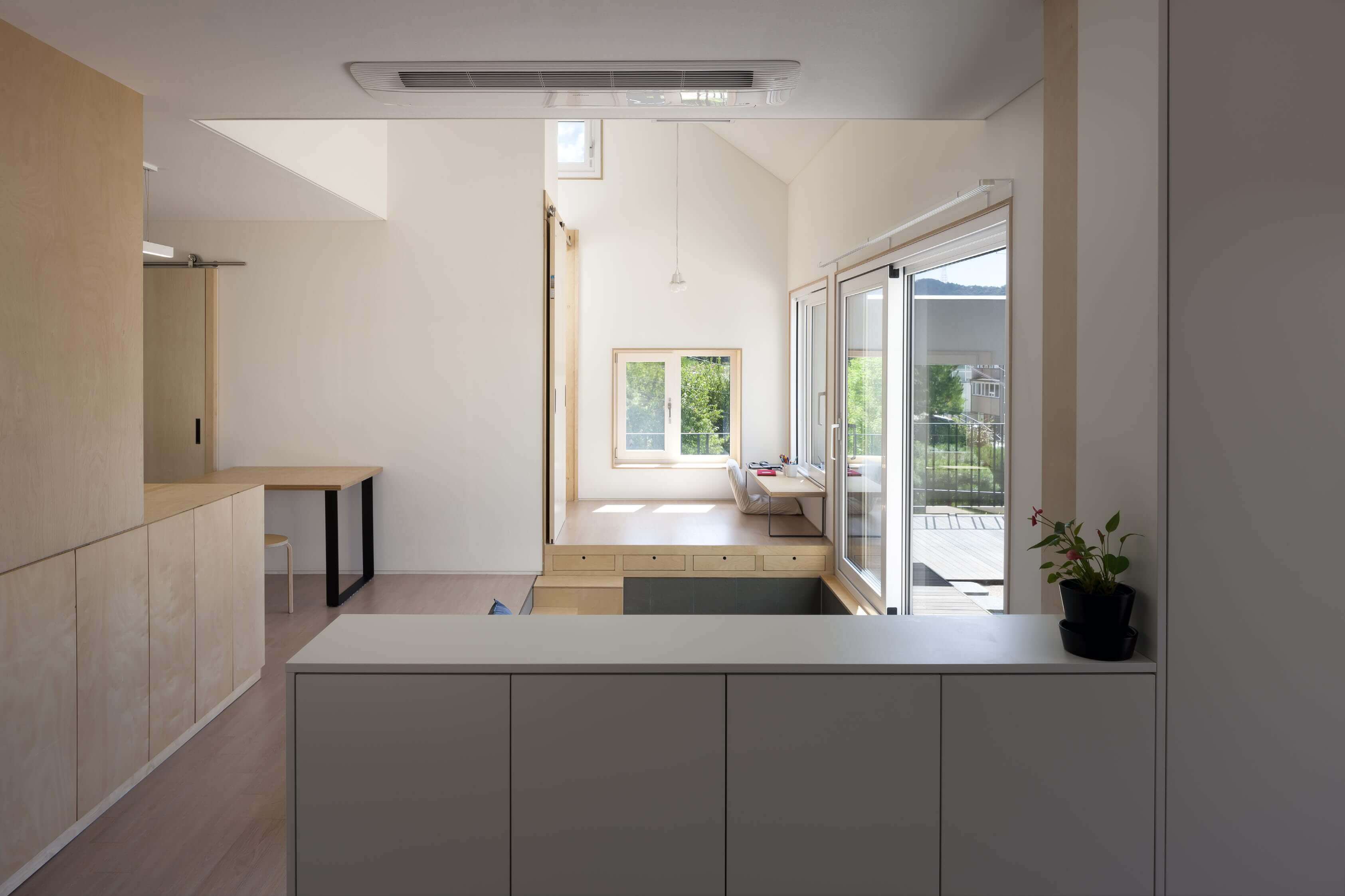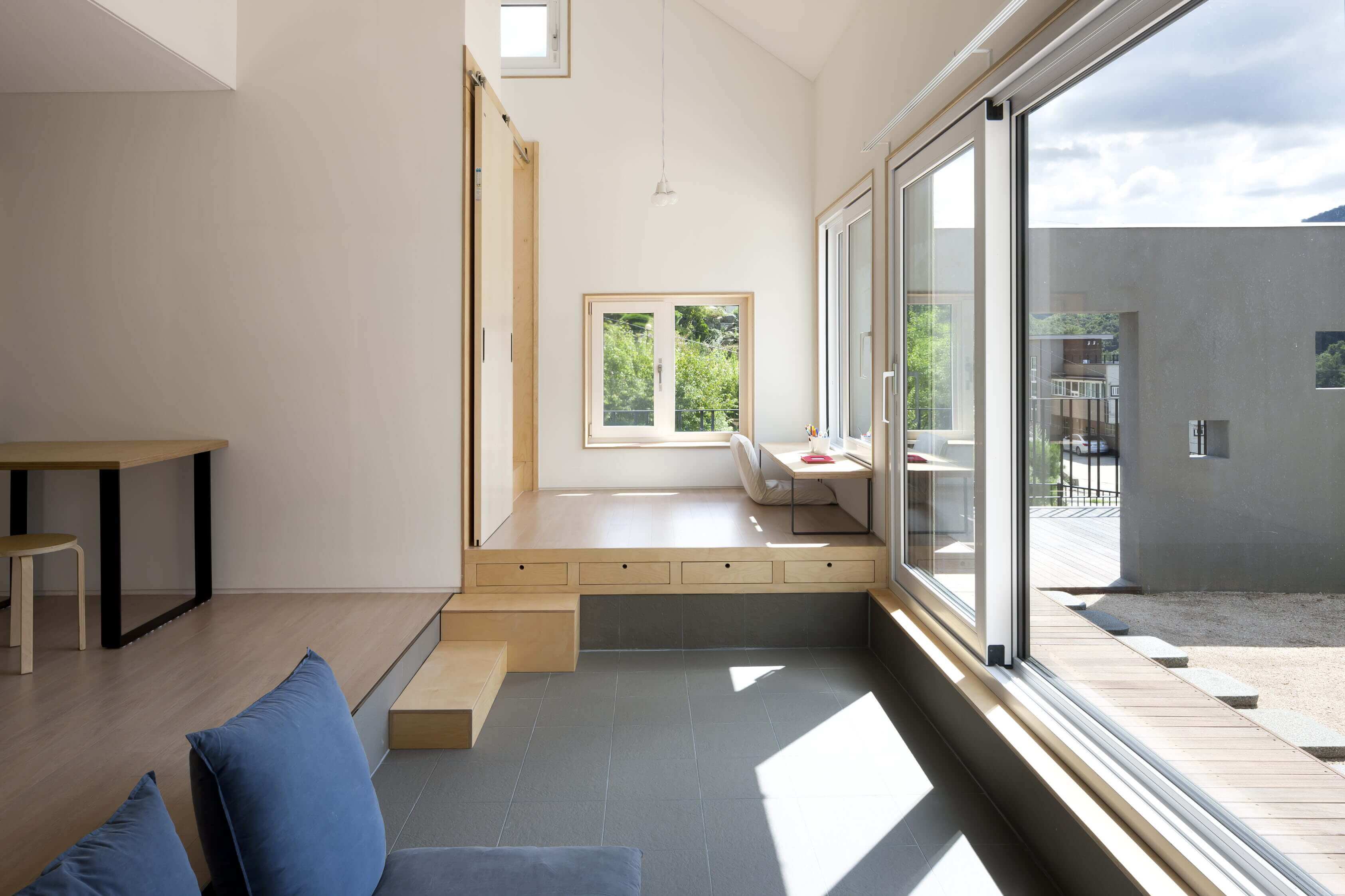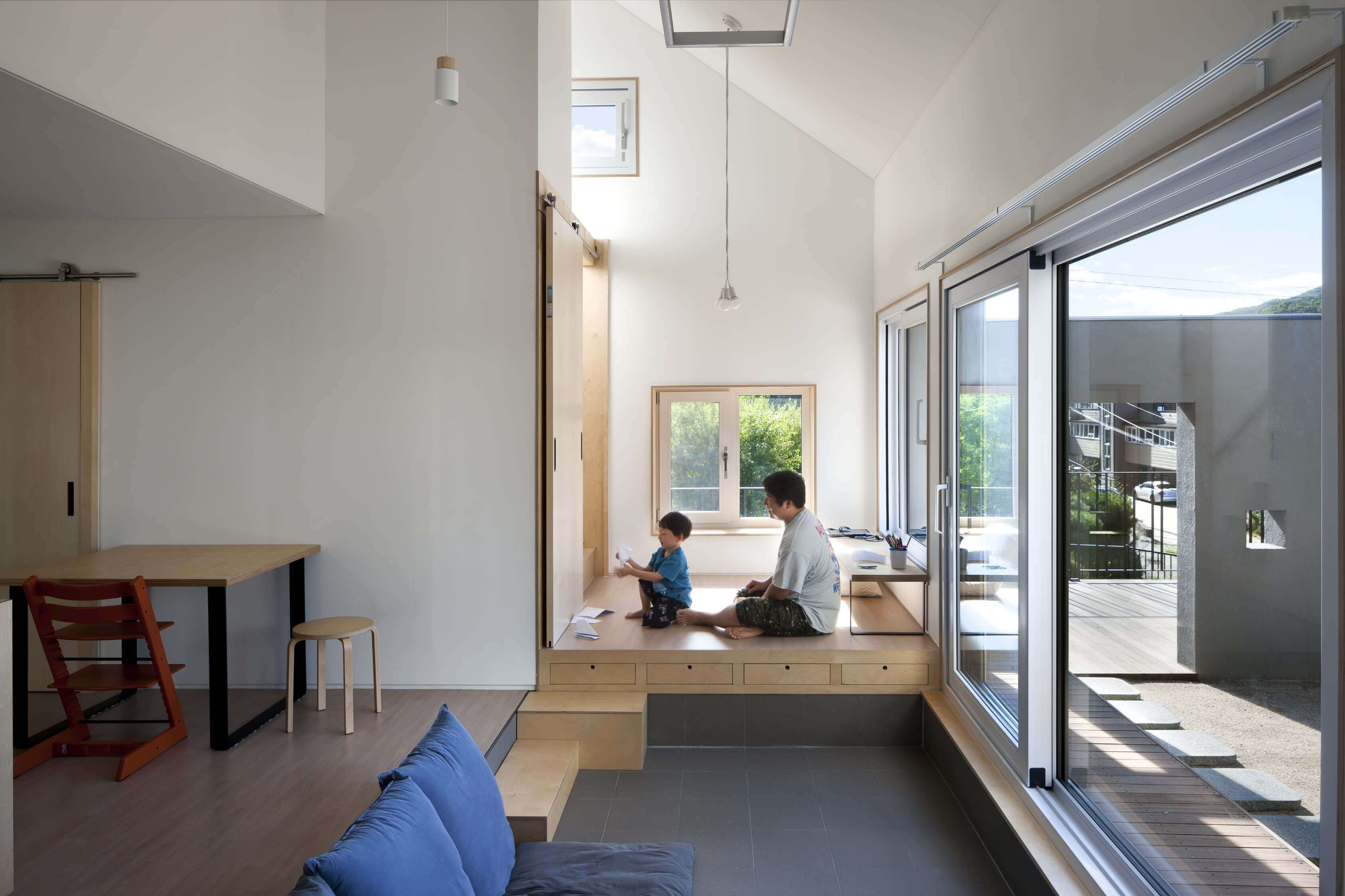 내부의 각 공간들은 서로 단절된 듯 하면서도 통해 있다. 1층에는 거실과, 손님방, 그리고 주방이 있으며 한 단 아래 바닥 높이에 변화를 준 거실이 있다. 2층으로 갈 때 사용하는 보이는 계단과 숨겨진 계단 두 개가 있다. 숨겨진 계단은 다실 뒤에 있는데, 다실은 엄마와 하온이가 가장 좋아하는 공간이다. 숨겨진 계단을 오르면 2층 아들 방으로 통하는 다락방이 나오고, 아들 방을 통하면 집은 다시 부부의 방과 욕실 등 집의 주요 공간으로 이어진다. 마치 에셔의 계단 그림처럼 숨겨지면서도 유기적으로 이어지는 공간은 복잡하지맊 안도감을 준다. 단젃과 연결이 공졲하는 이 집에서, 가족들의 유대감은 독립적이면서도 끊임없이 만날 수 있는 동선을 통해 더욱 깊어진다. ■