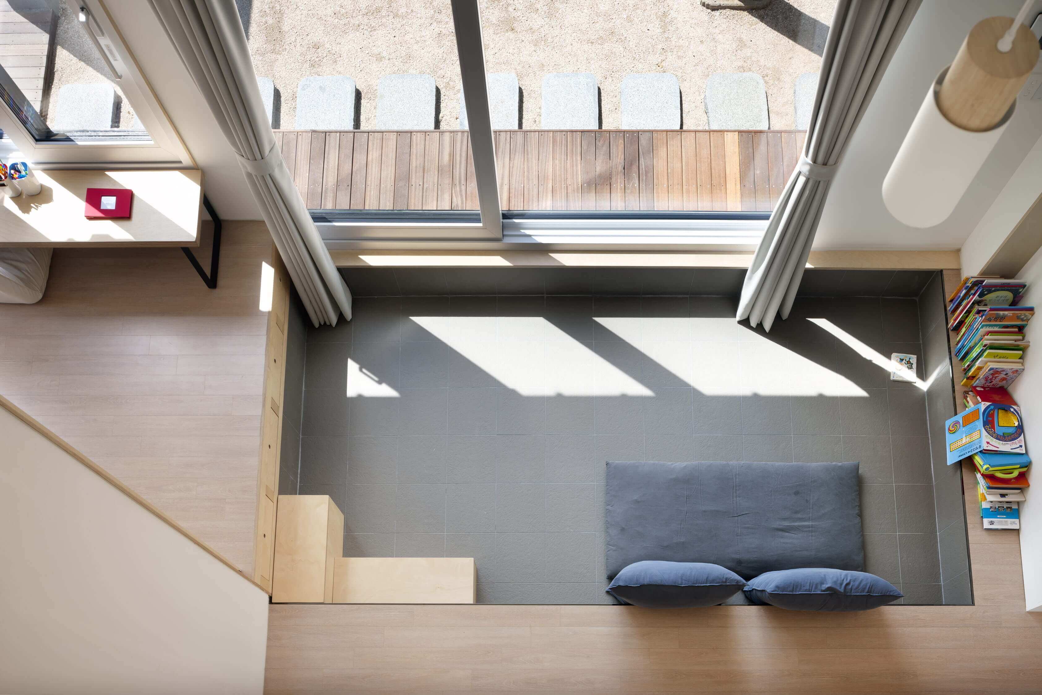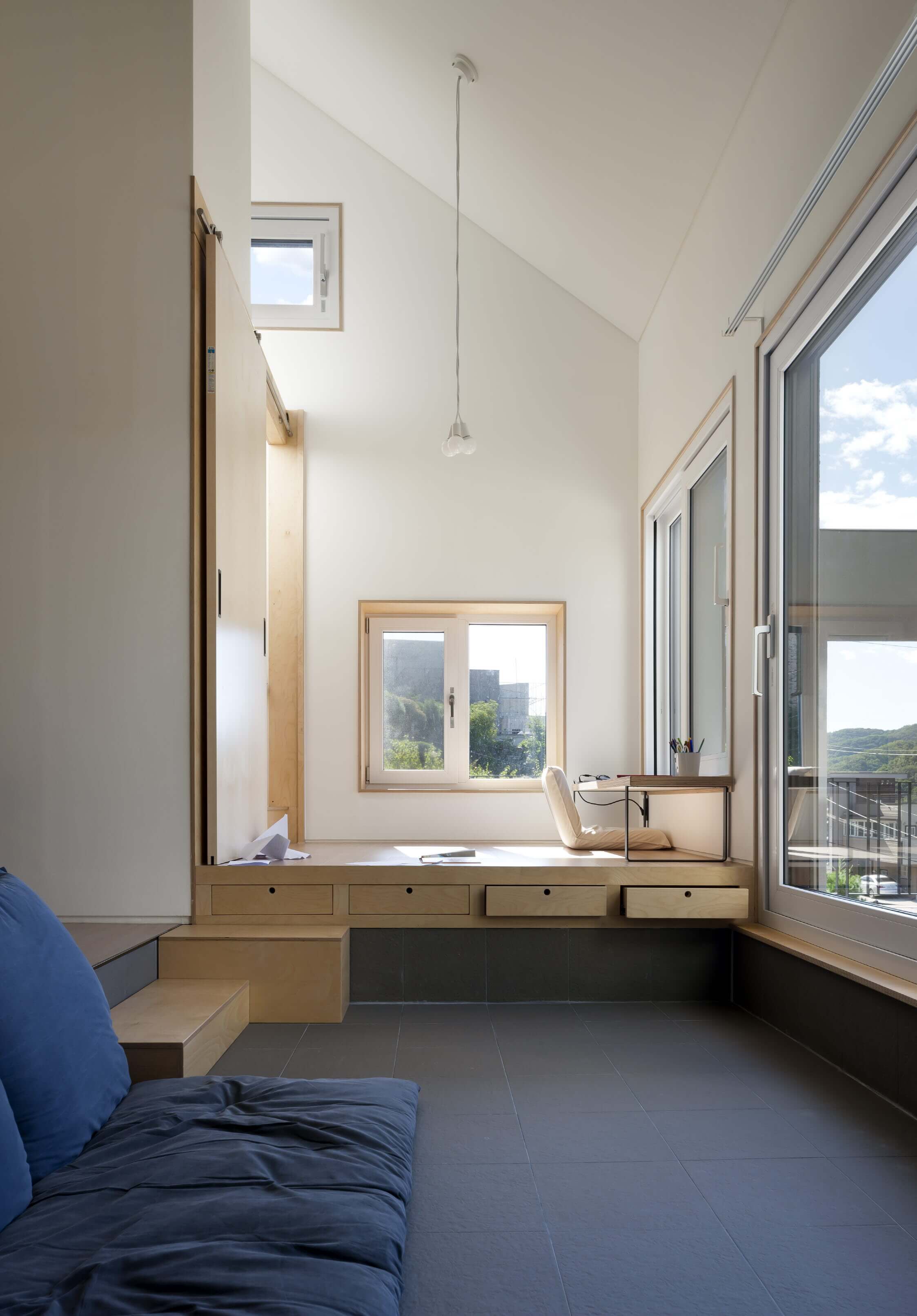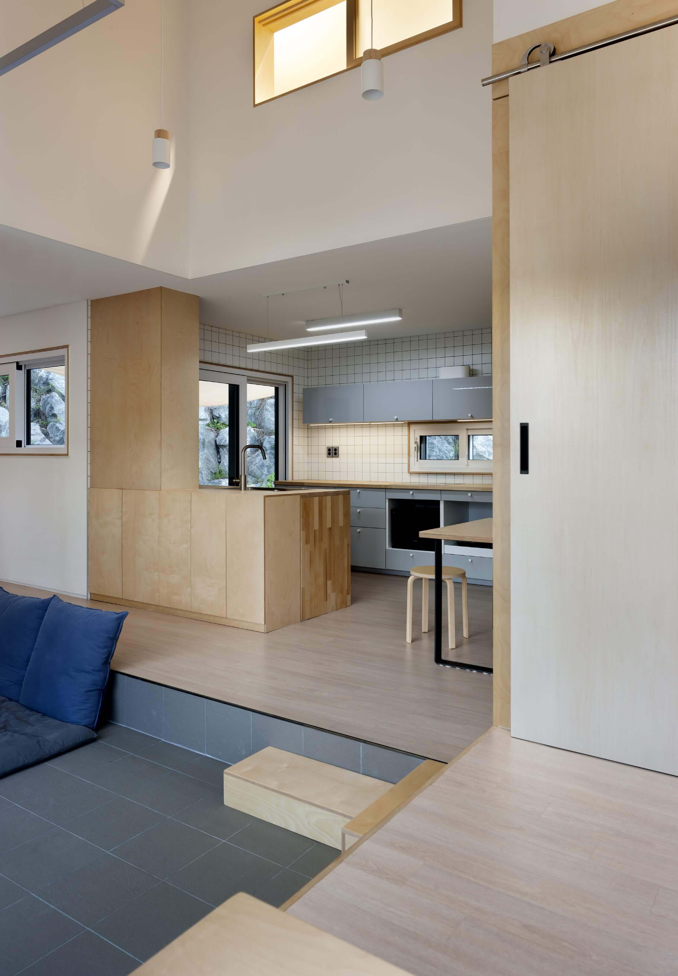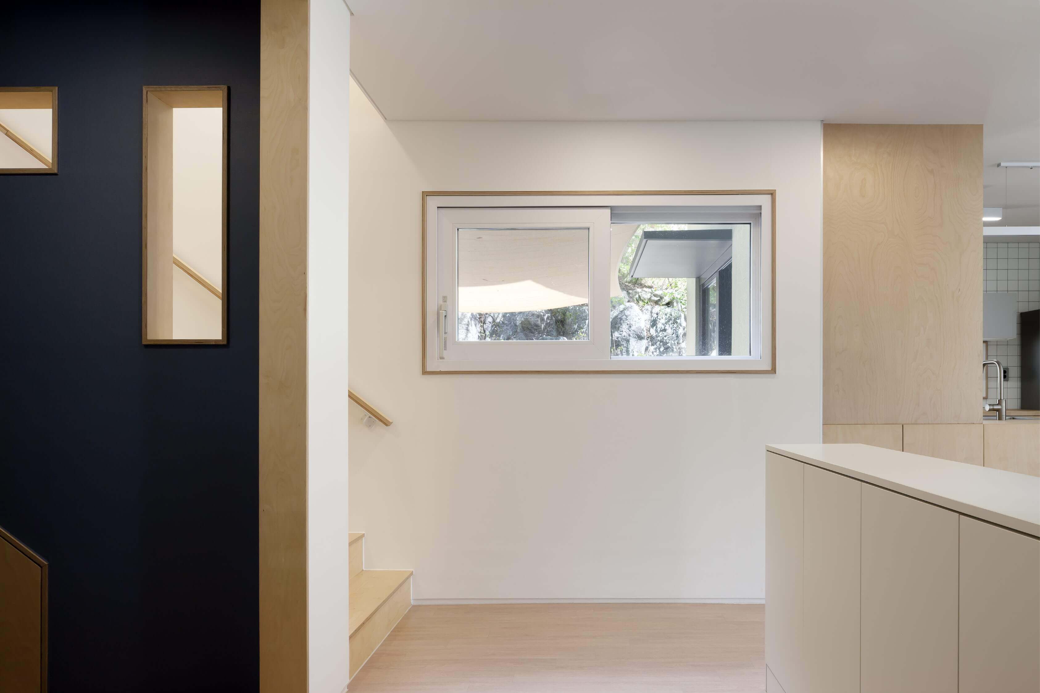 내부의 각 공간들은 서로 단절된 듯 하면서도 통해 있다. 1층에는 거실과, 손님방, 그리고 주방이 있으며 한 단 아래 바닥 높이에 변화를 준 거실이 있다. 2층으로 갈 때 사용하는 보이는 계단과 숨겨진 계단 두 개가 있다. 숨겨진 계단은 다실 뒤에 있는데, 다실은 엄마와 하온이가 가장 좋아하는 공간이다. 숨겨진 계단을 오르면 2층 아들 방으로 통하는 다락방이 나오고, 아들 방을 통하면 집은 다시 부부의 방과 욕실 등 집의 주요 공간으로 이어진다. 마치 에셔의 계단 그림처럼 숨겨지면서도 유기적으로 이어지는 공간은 복잡하지맊 안도감을 준다. 단젃과 연결이 공졲하는 이 집에서, 가족들의 유대감은 독립적이면서도 끊임없이 만날 수 있는 동선을 통해 더욱 깊어진다. ■