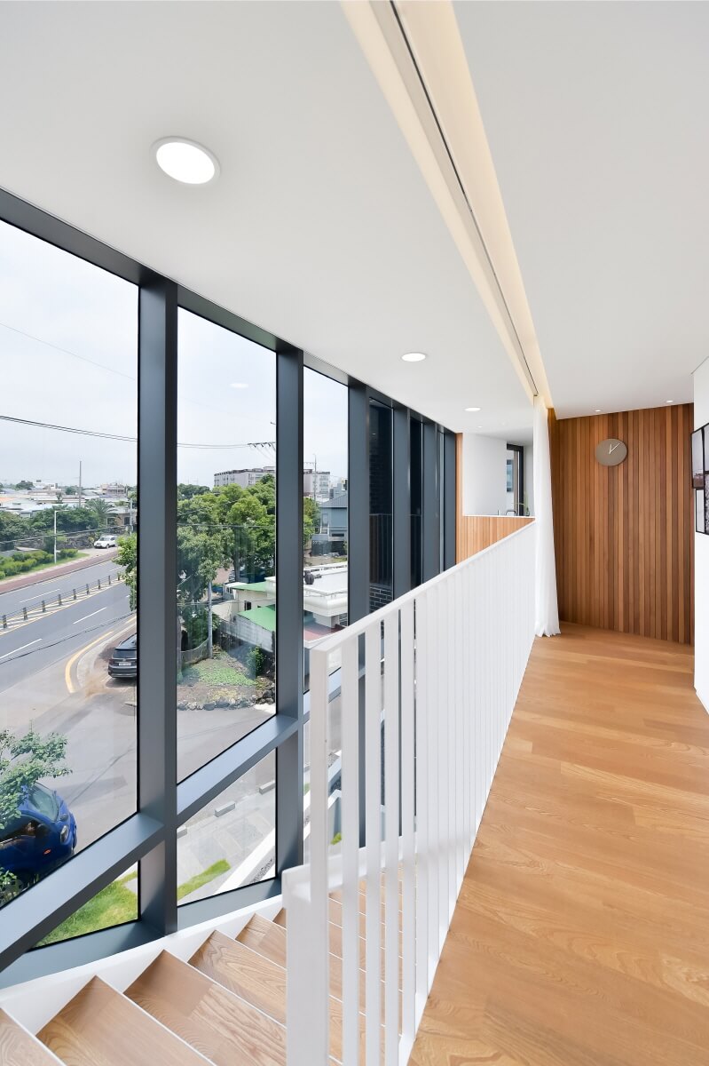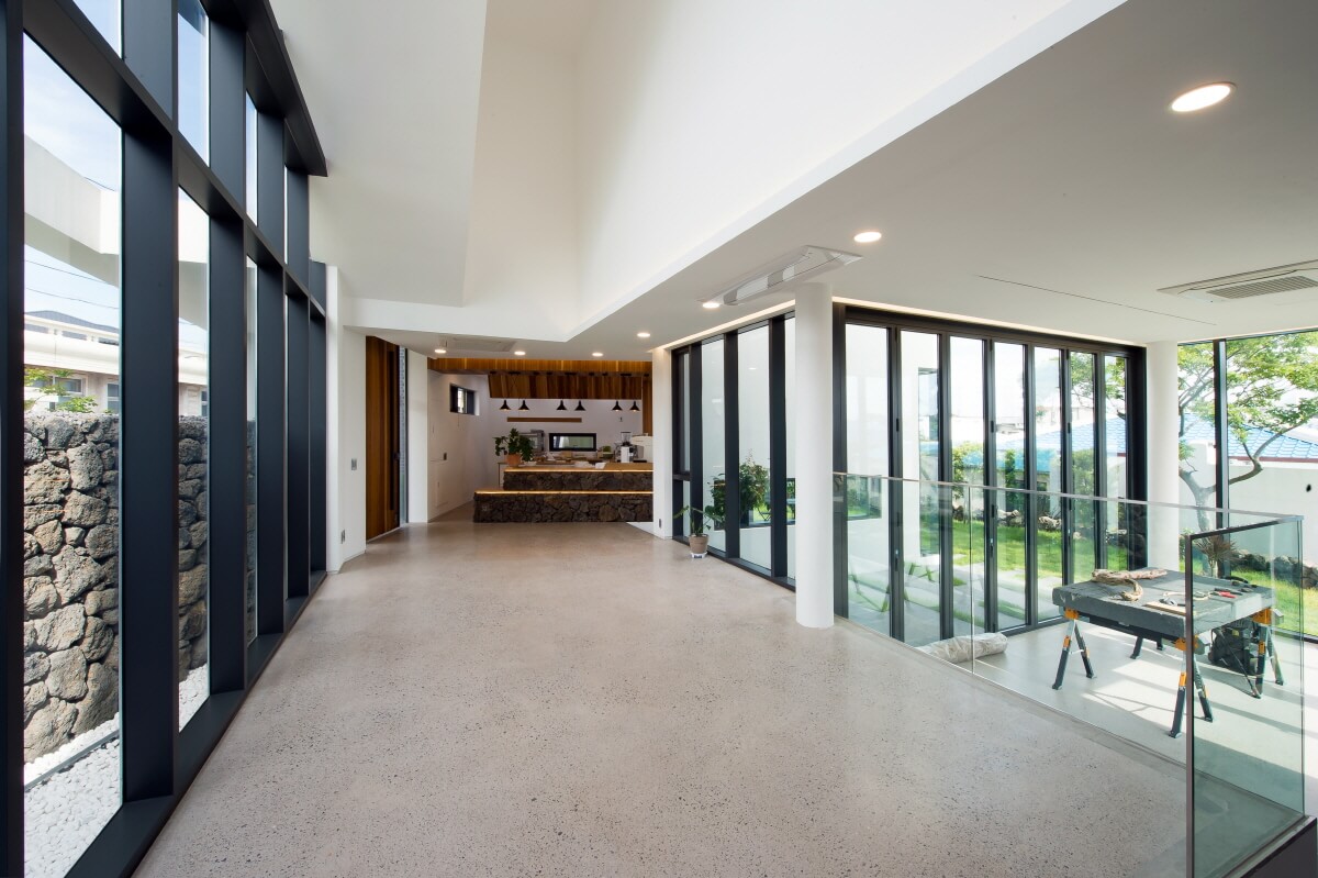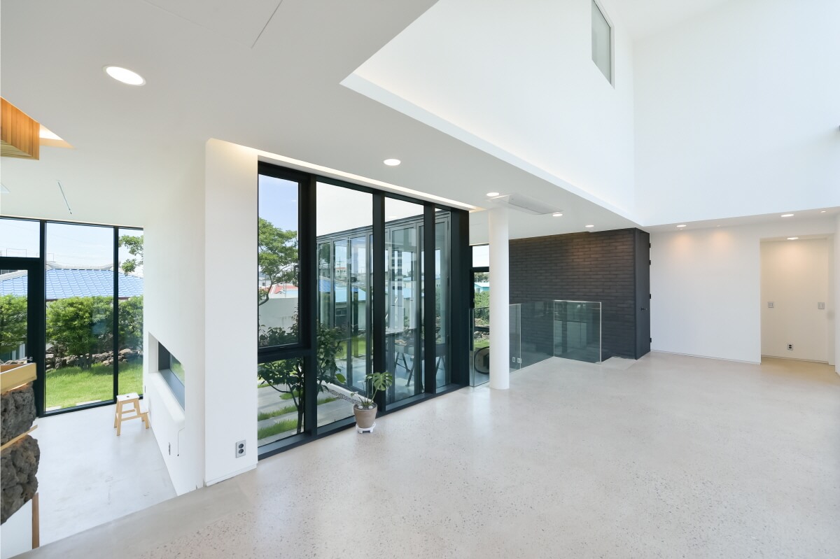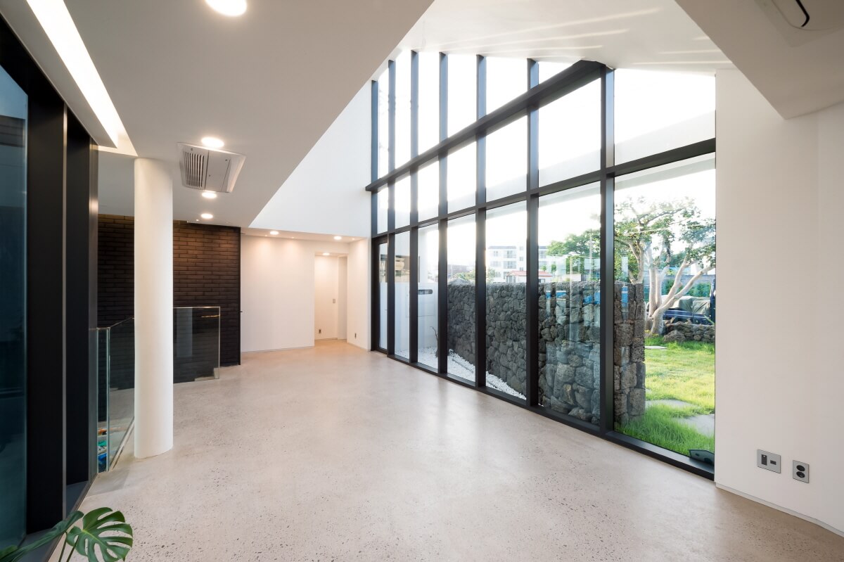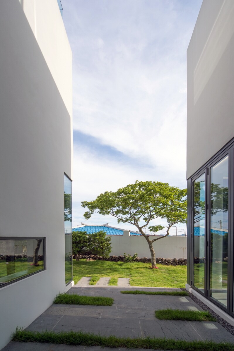 계단과 복도에서 한라산 조망을 할 수 있도록 하였다. 이 부분에 커튼을 설치하여 커튼의 열리고 닫힘에 따라 영역의 변화에 따른 외부와의 관계가 다양하게 이루어지며, 프라이버시를 확보하고 40M도로의 소음과 좋지 않은 환경을 차단하는 역할을 한다.