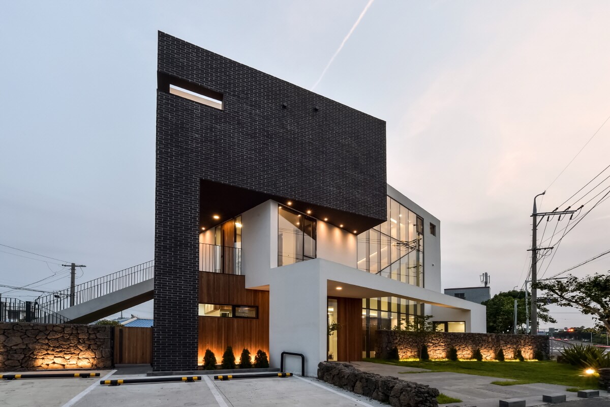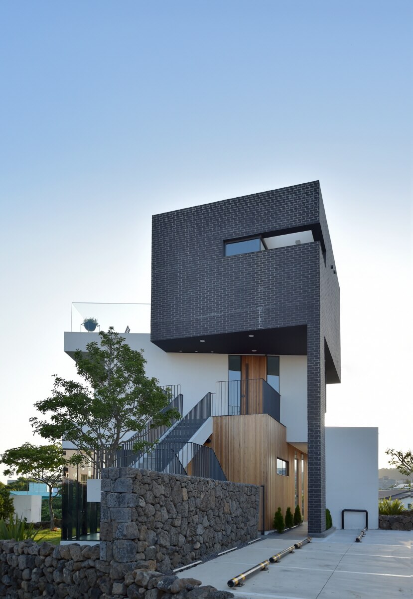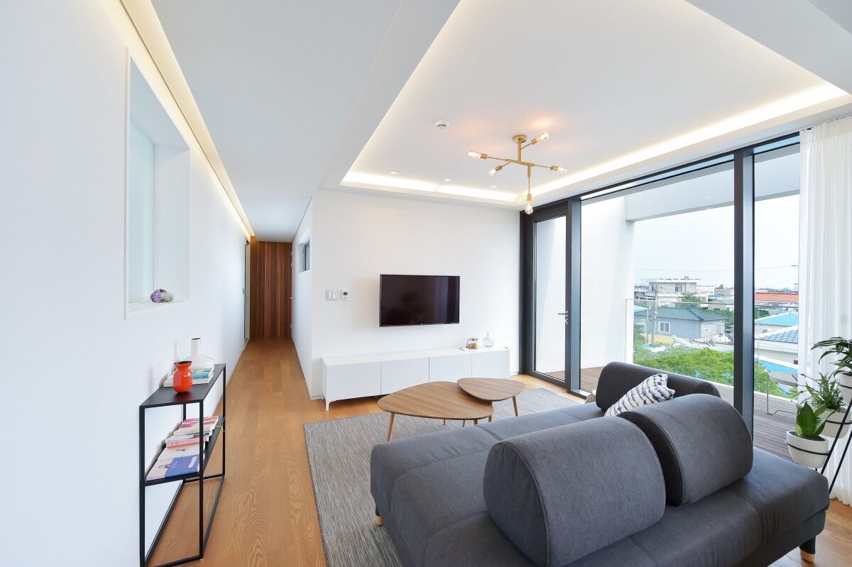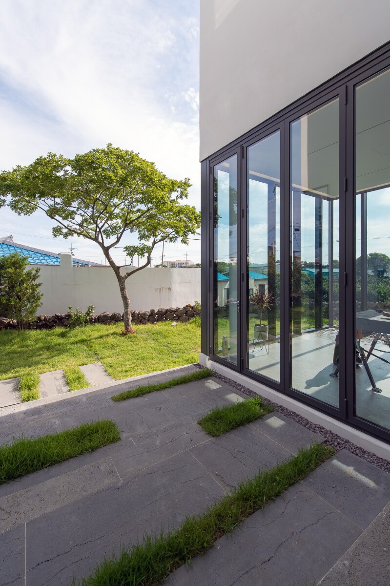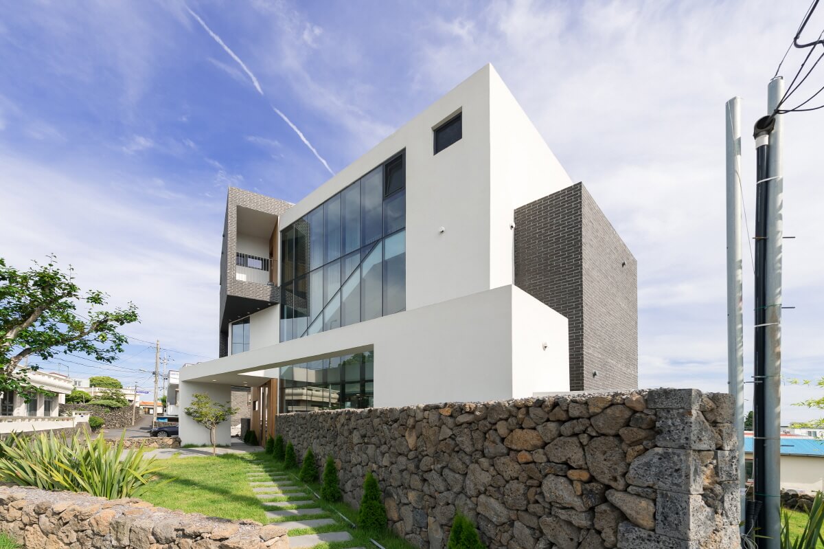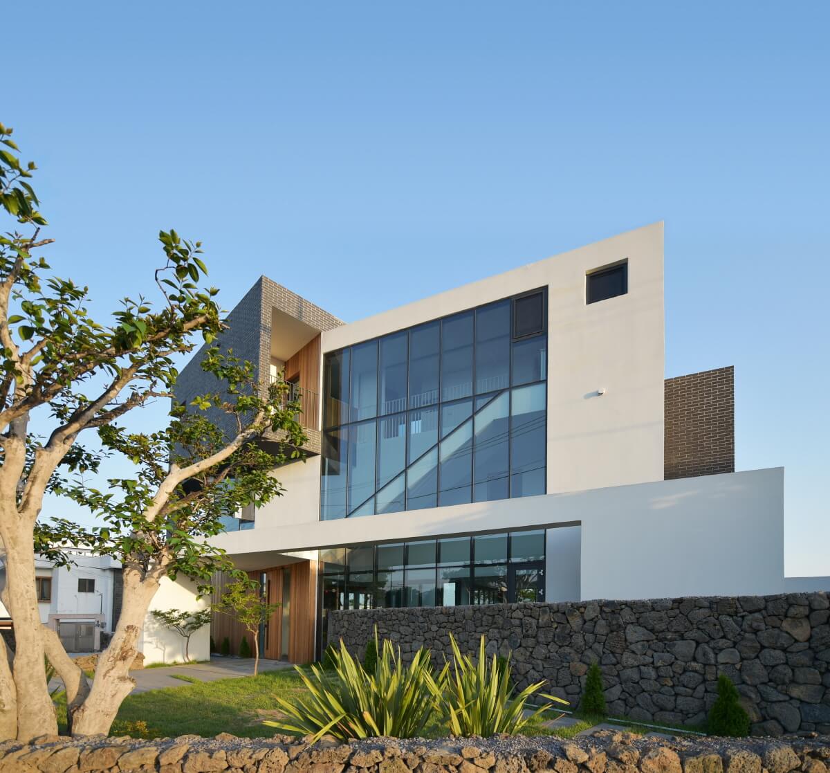 계단과 복도에서 한라산 조망을 할 수 있도록 하였다. 이 부분에 커튼을 설치하여 커튼의 열리고 닫힘에 따라 영역의 변화에 따른 외부와의 관계가 다양하게 이루어지며, 프라이버시를 확보하고 40M도로의 소음과 좋지 않은 환경을 차단하는 역할을 한다.