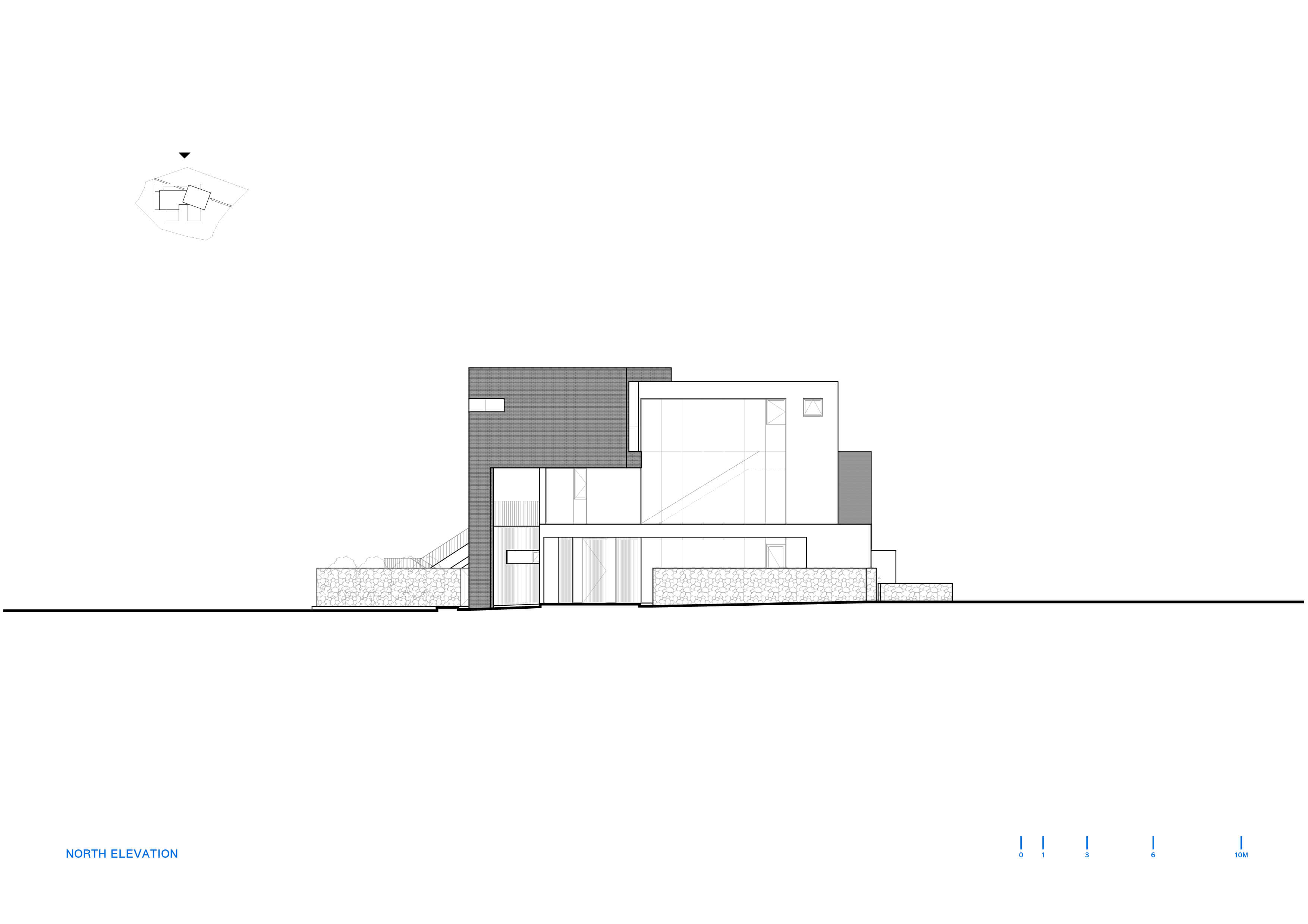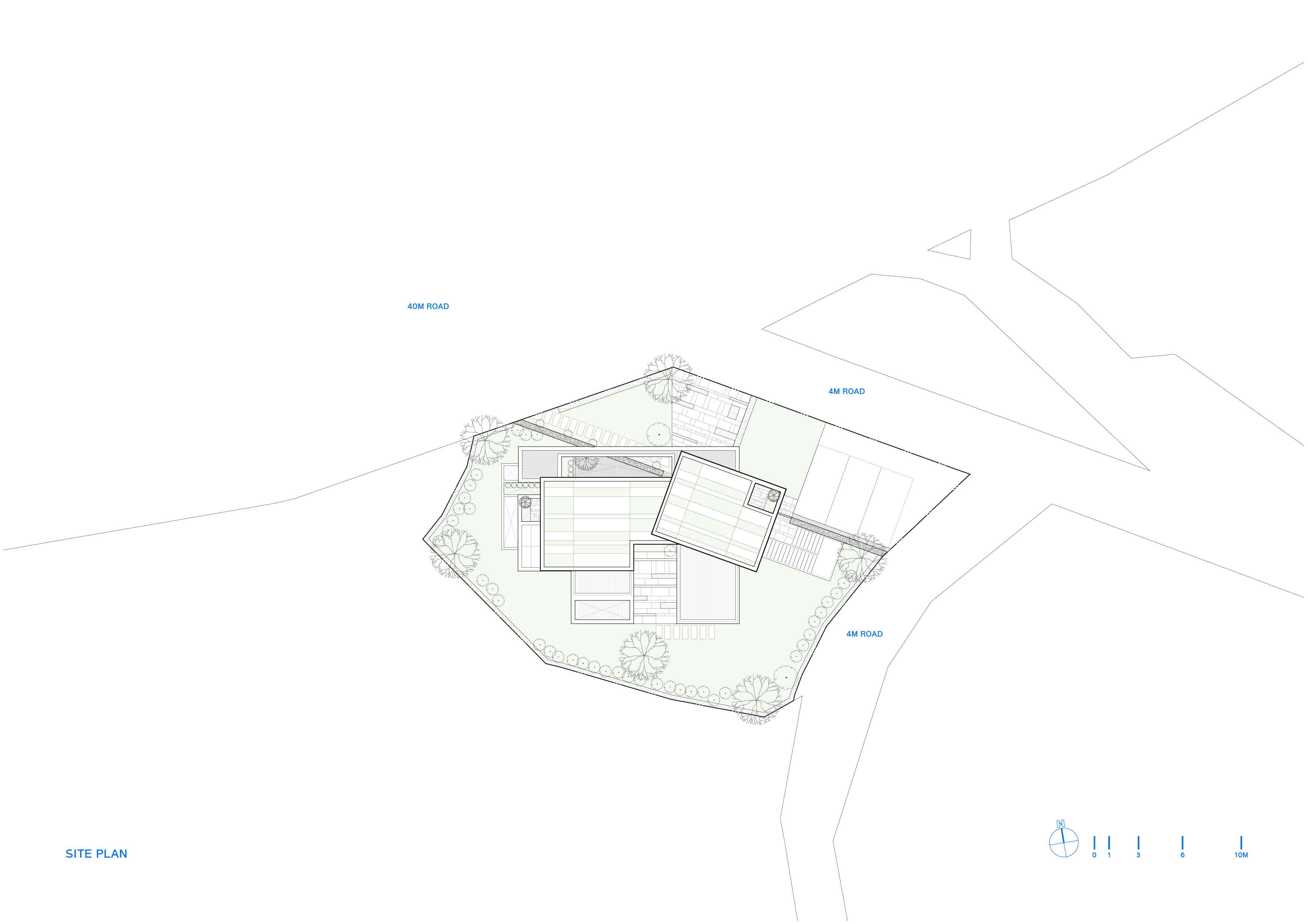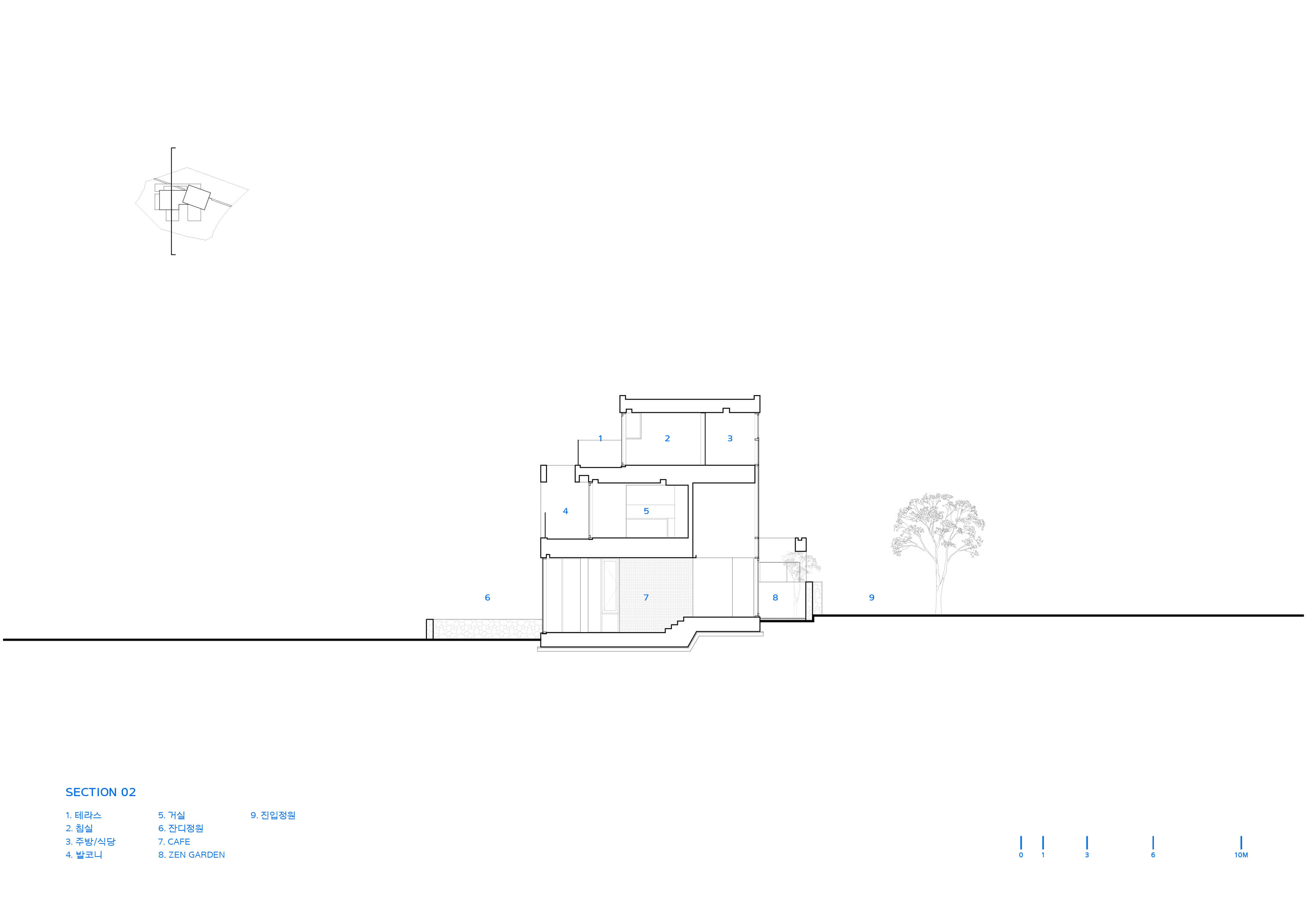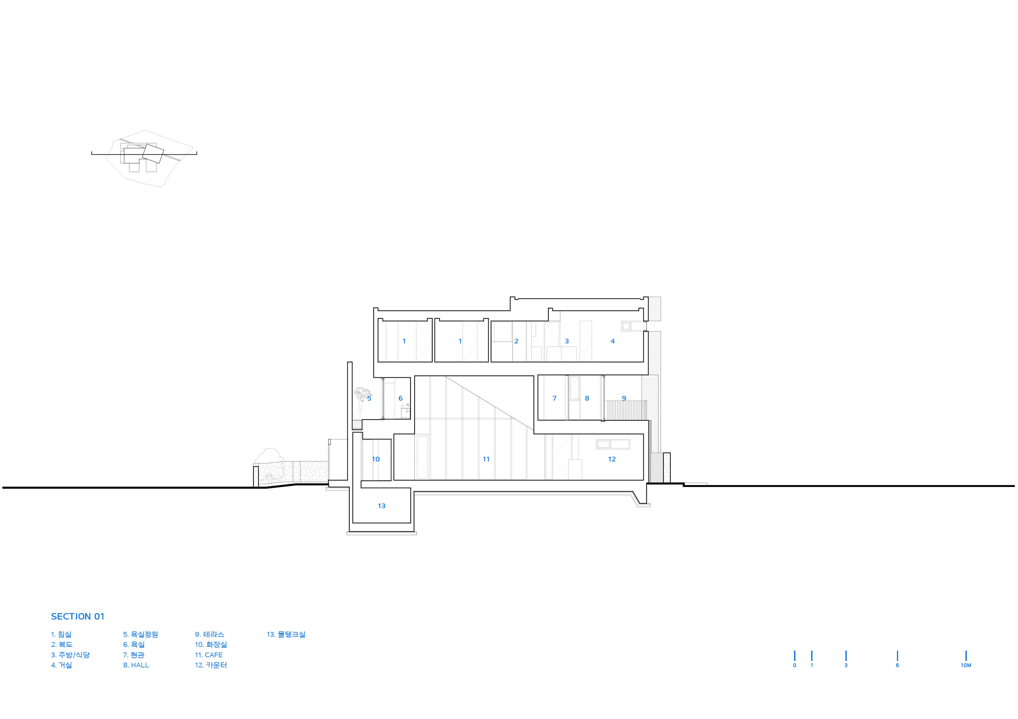 이 대지는 남북으로 1M정도 레벨차가 존재한다. 이러한 지형을 이용한 공간구성과 건물의 각 부분에 비워둠으로서 생겨나는 공간들 그리고 돌담은 높이와 위치를 달리하는 각각의 내/외부 공간이 되고 이러한 내/외부공간들은 연속적인 시퀀스와 하효 마을의 일상적인 모습과 공간을 담아낸다.