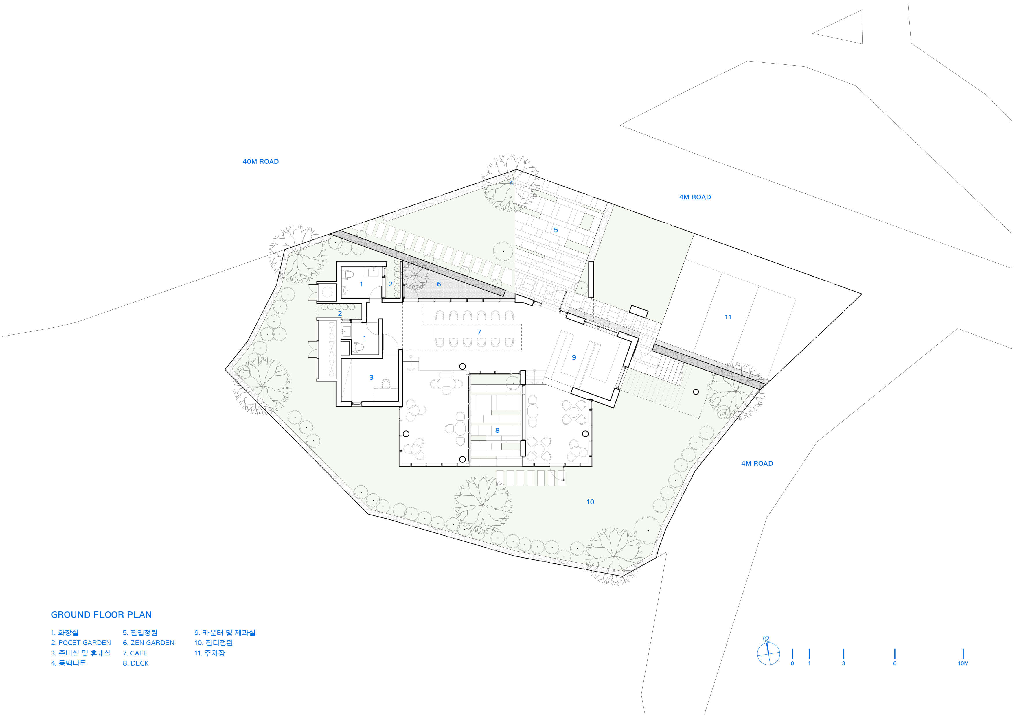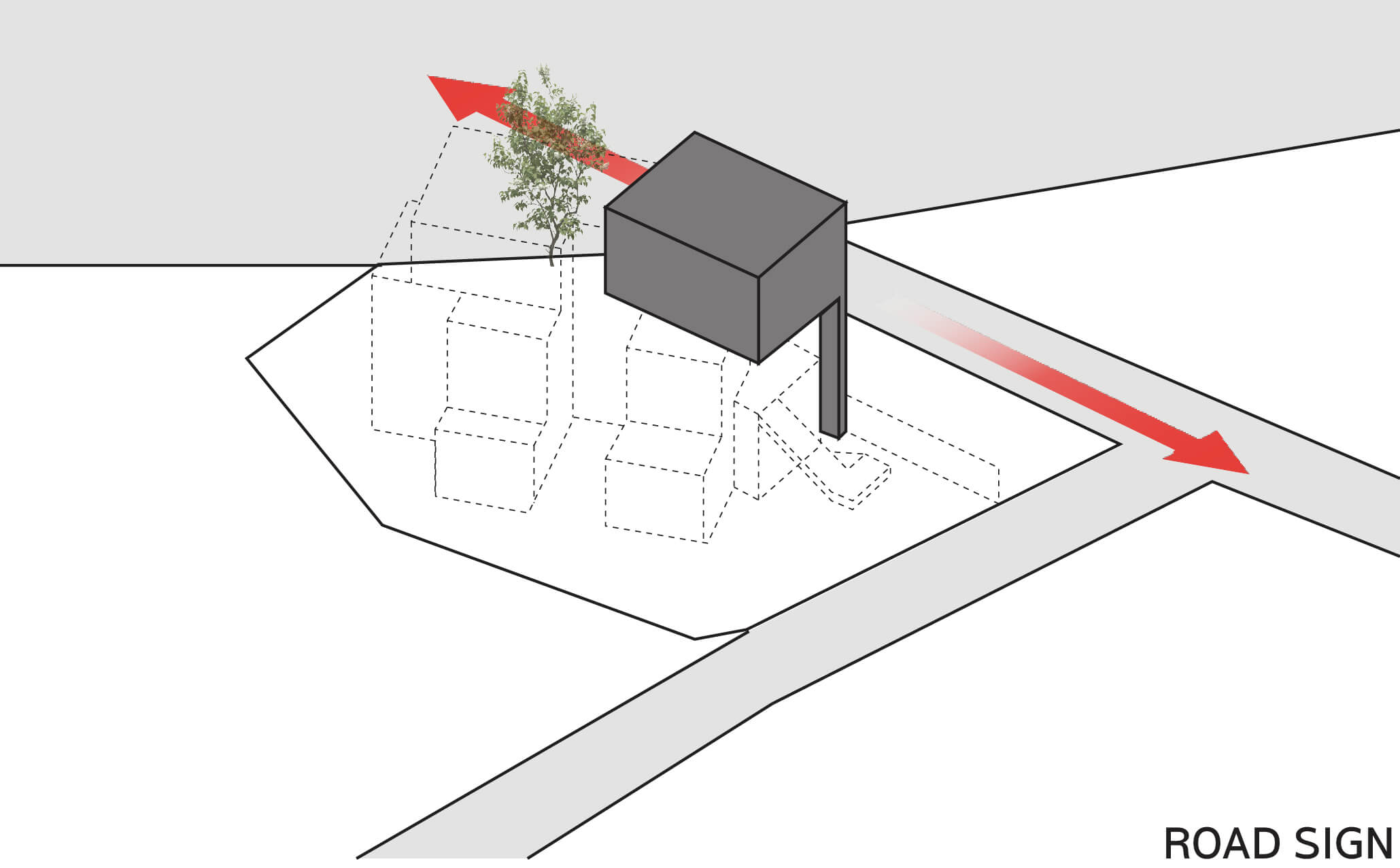 건물의 축을 4M도로와 평행하게 형성된 매스는 동백나무, 돌담과 함께 방향성을 강조하였으며, 하효 마을의 이정표가 될 수 있을 것이다.