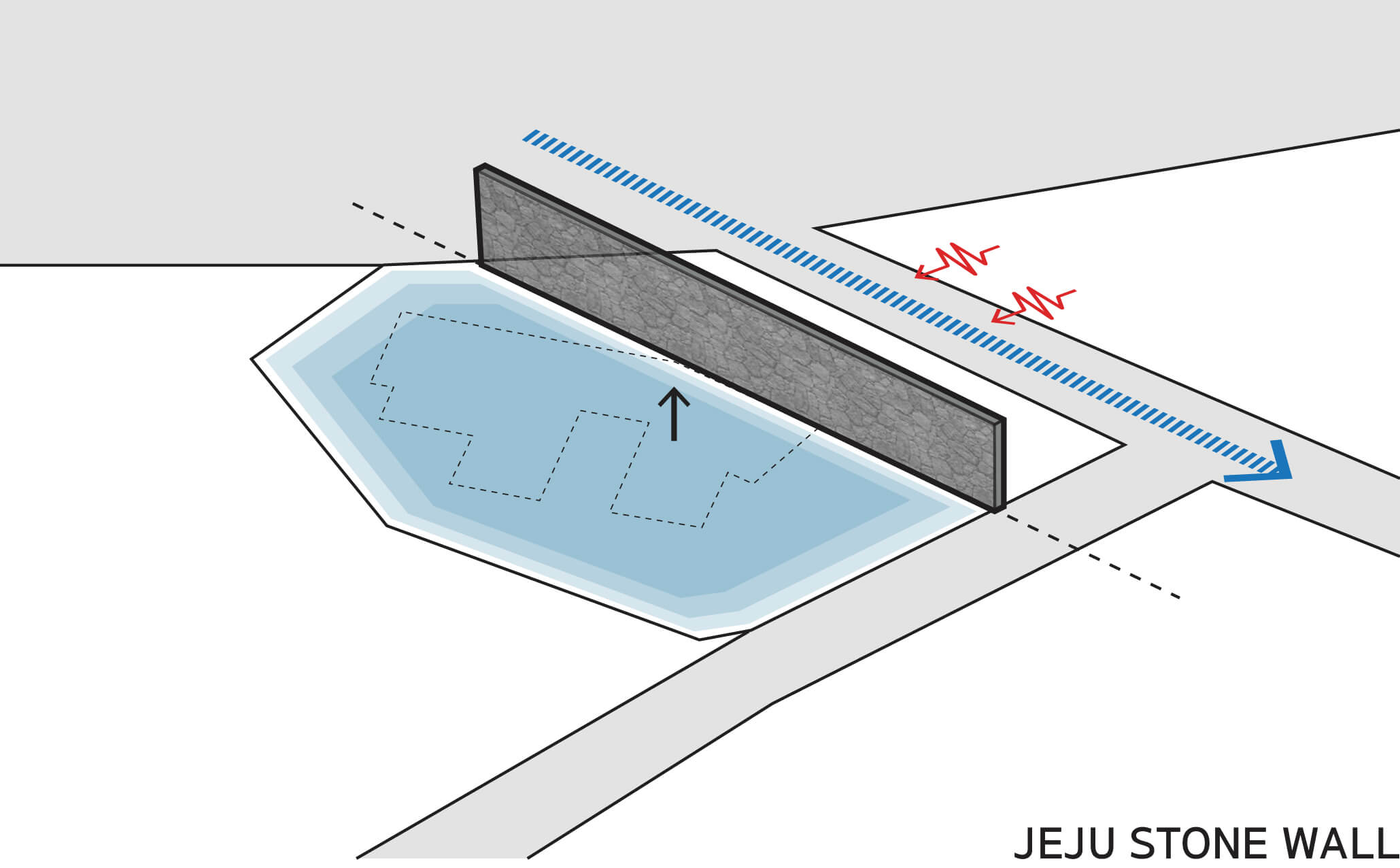 1.8M 높이의 돌담은 오래된 4M도로와 평행하게 배치하여 마을주민 및 관광객들을 끌어들이며, 40M도로의 소음과 위험성 등을 차단하는 기능을 갖고 있다. 또한 이 돌담의 안쪽은 하효 마을의 일상의 모습을 그대로 보여줄 수 있으며, 돌담이 배치되면서 생겨나는 공간들은 각각의 역할에 맞게 정원을 형성하게 된다. 이러한 돌담은 벽이 아닌 이곳의 일상을 유지할 수 있는 하나의 구심점이며 새로운 장소를 만들게 된다.