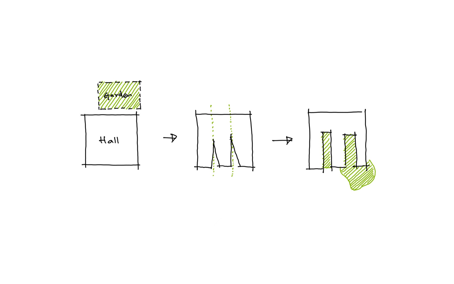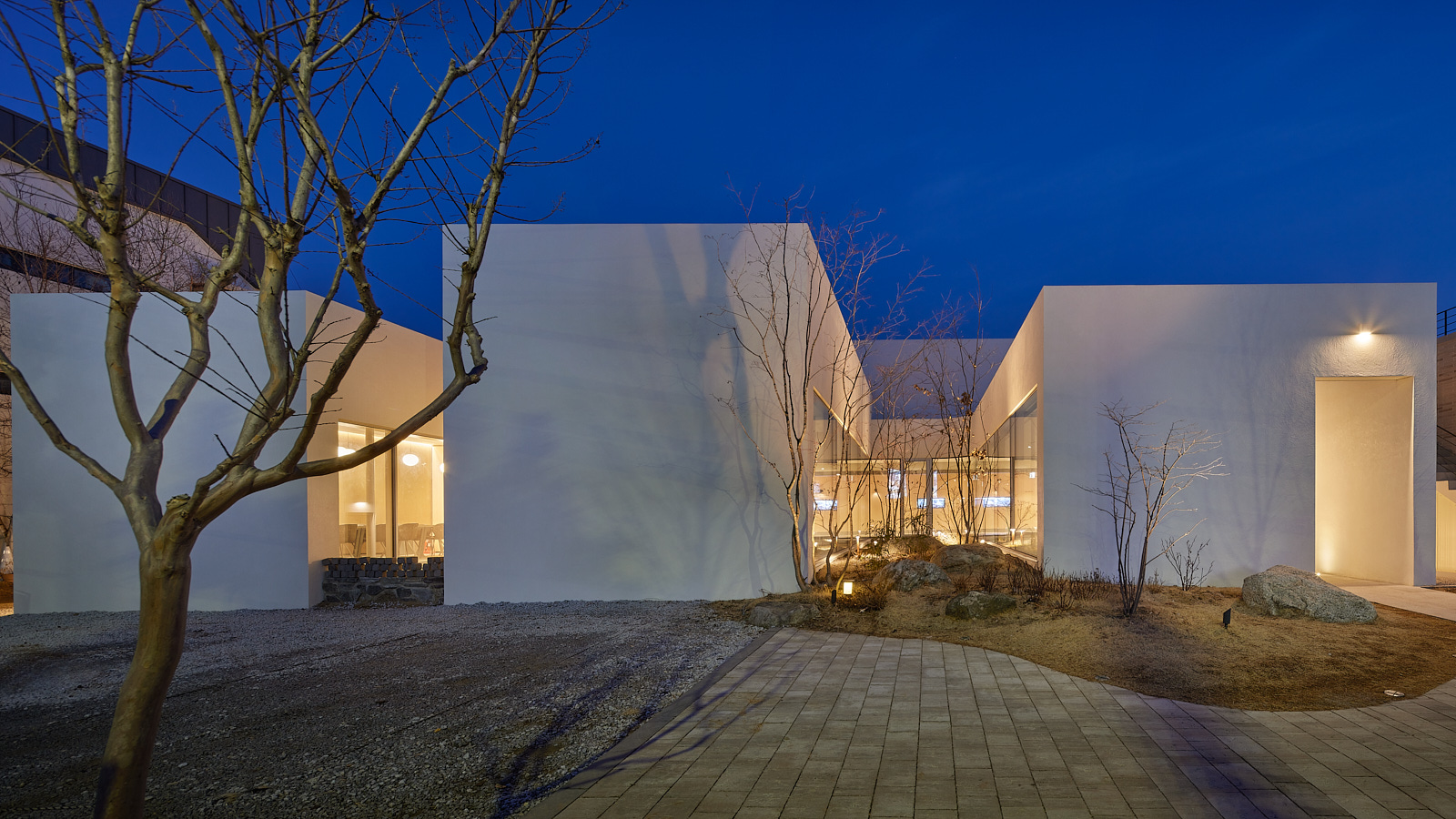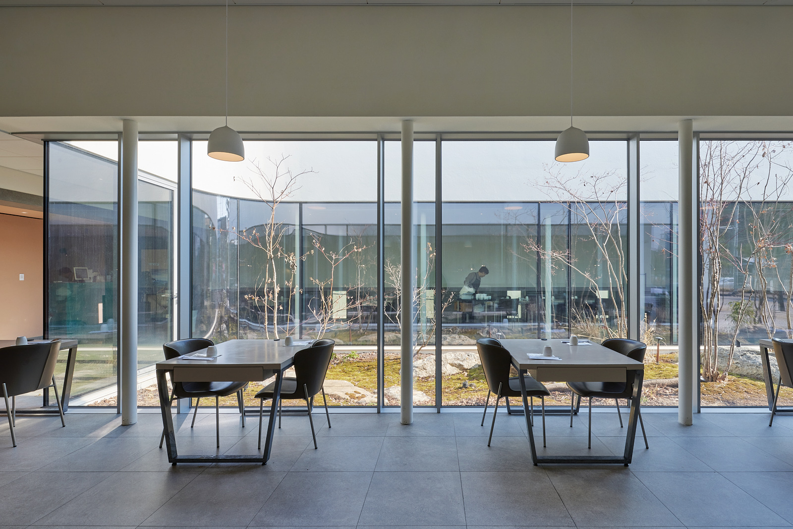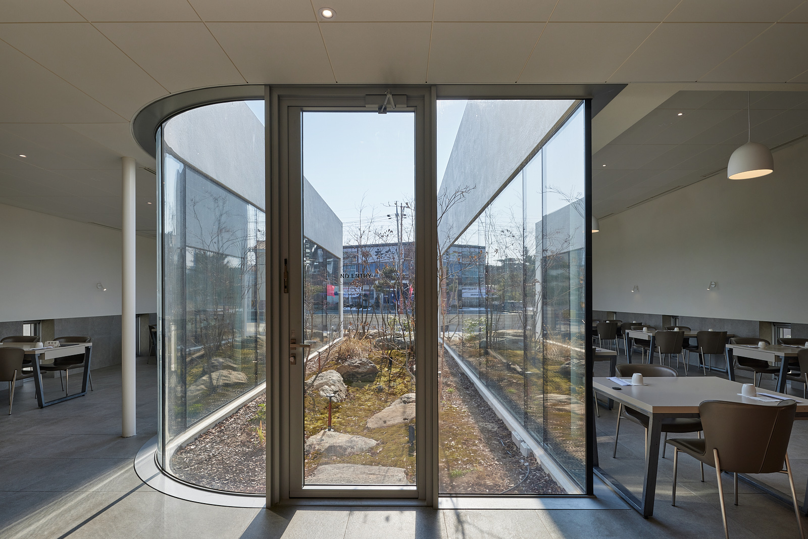 식사의 배경이 되는 조경요소들은 건물의 외부에서는 다소 다르게 인지된다. 바깥에서 바라본 건물의 정면에는 창이 없기 때문에 방문객은 각기 다른 크기의 세 개의 하얀 덩어리를 먼저 마주한다. 그 사이로 보이는 정원으로 방문객은 바로 들어설 수 없다. 정원들은 건축의 사이공간을 채워주는 부속요소처럼 느껴진다. 한켠에 만들어진 긴 입구를 거쳐 내부에 들어선 후 안에서부터 바깥으로 시선을 돌린 후에야 비로소 정원의 역할을 느낄 수 있다. 자리에 앉으면 건너편의 흰 매스를 배경으로 정원을 바라보게 된다. 건축물 외부에서 봤던 흰 매스와 조경요소들이 하나의 화폭에 겹쳐지며 한폭의 회화처럼, 식사의 배경이 된다. ■