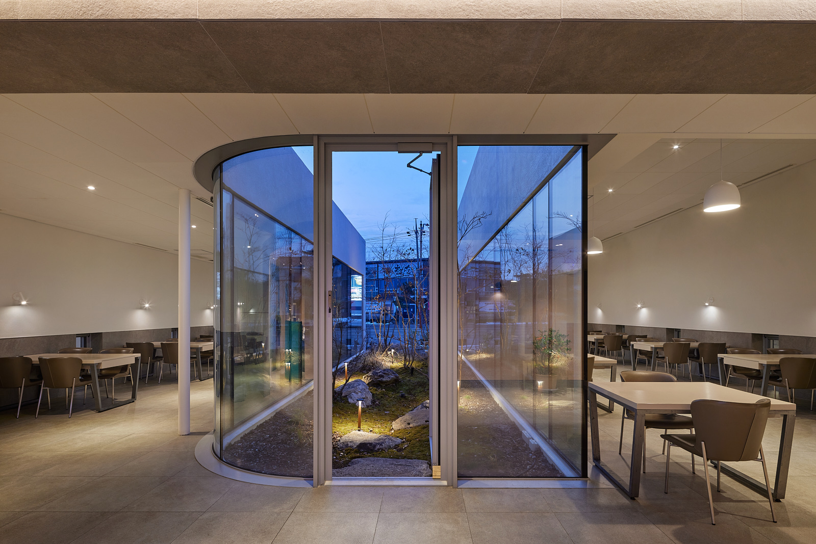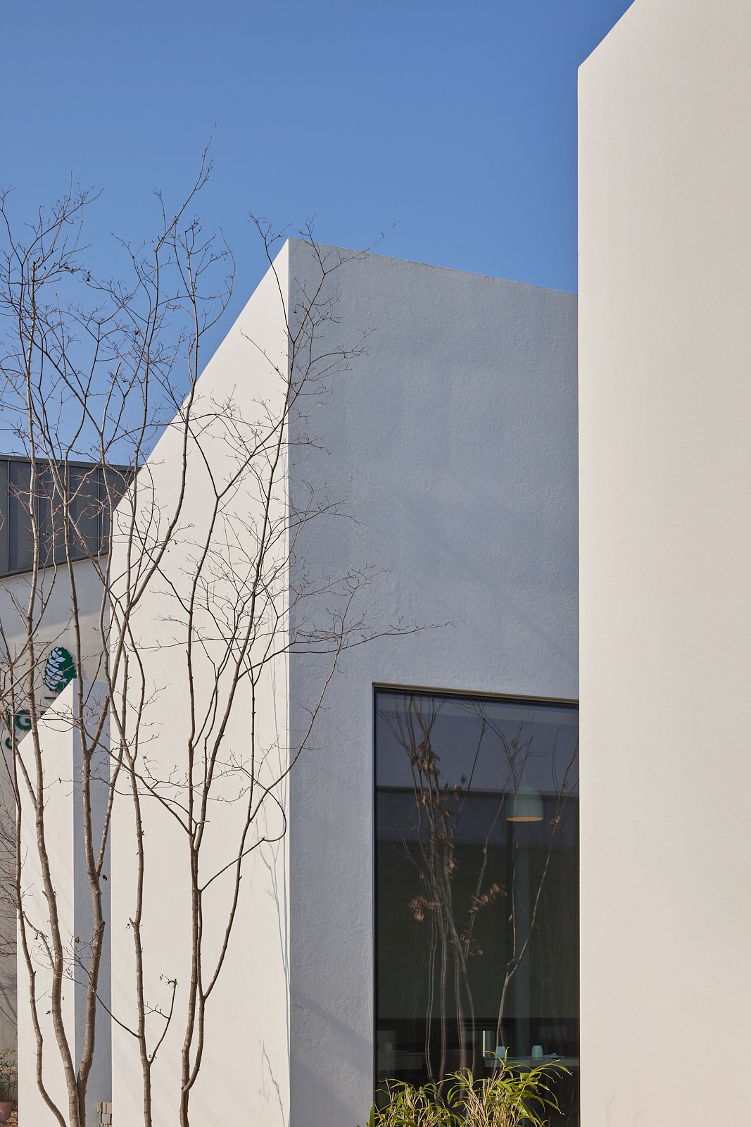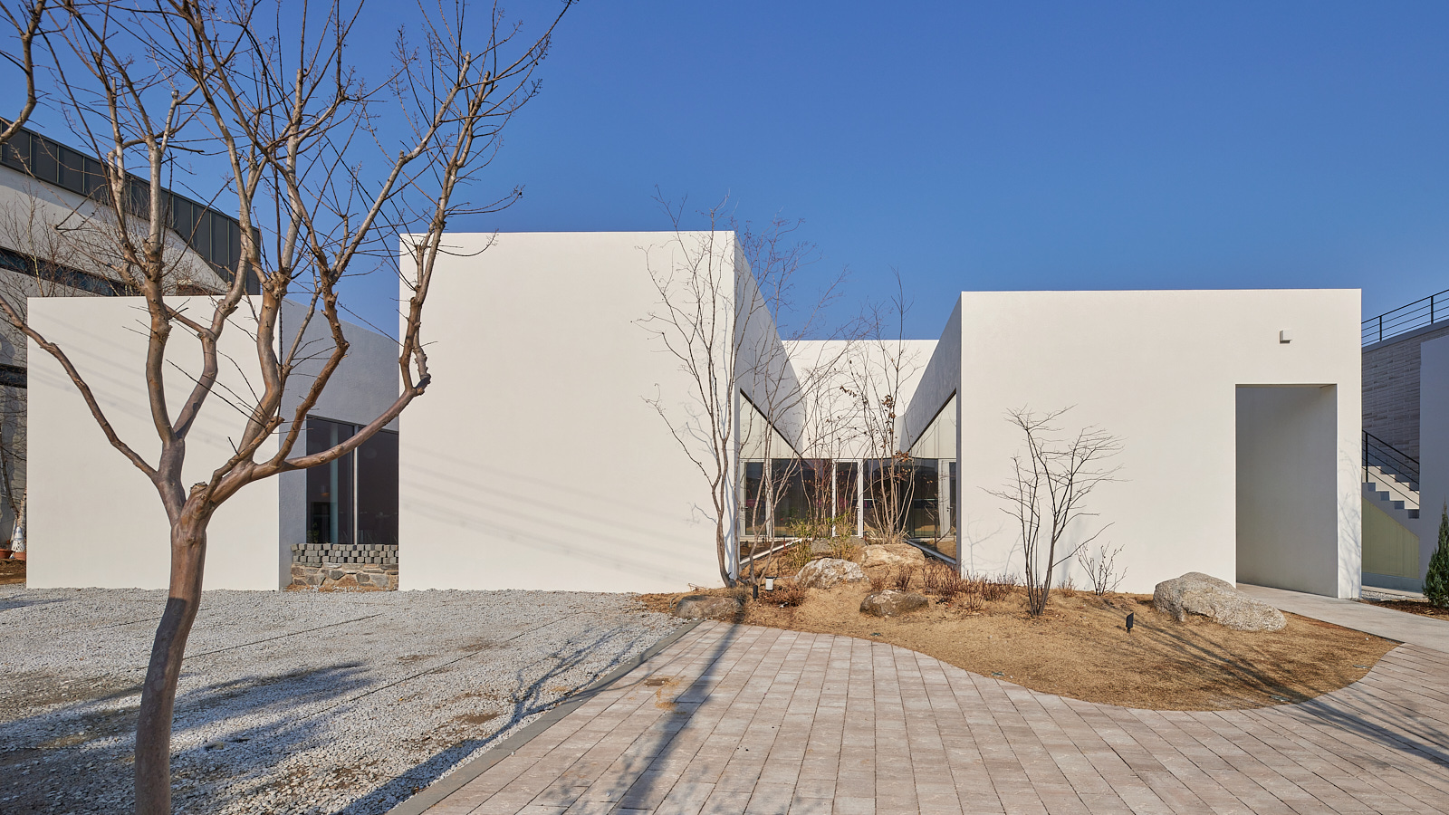 식사의 배경이 되는 조경요소들은 건물의 외부에서는 다소 다르게 인지된다. 바깥에서 바라본 건물의 정면에는 창이 없기 때문에 방문객은 각기 다른 크기의 세 개의 하얀 덩어리를 먼저 마주한다. 그 사이로 보이는 정원으로 방문객은 바로 들어설 수 없다. 정원들은 건축의 사이공간을 채워주는 부속요소처럼 느껴진다. 한켠에 만들어진 긴 입구를 거쳐 내부에 들어선 후 안에서부터 바깥으로 시선을 돌린 후에야 비로소 정원의 역할을 느낄 수 있다. 자리에 앉으면 건너편의 흰 매스를 배경으로 정원을 바라보게 된다. 건축물 외부에서 봤던 흰 매스와 조경요소들이 하나의 화폭에 겹쳐지며 한폭의 회화처럼, 식사의 배경이 된다. ■