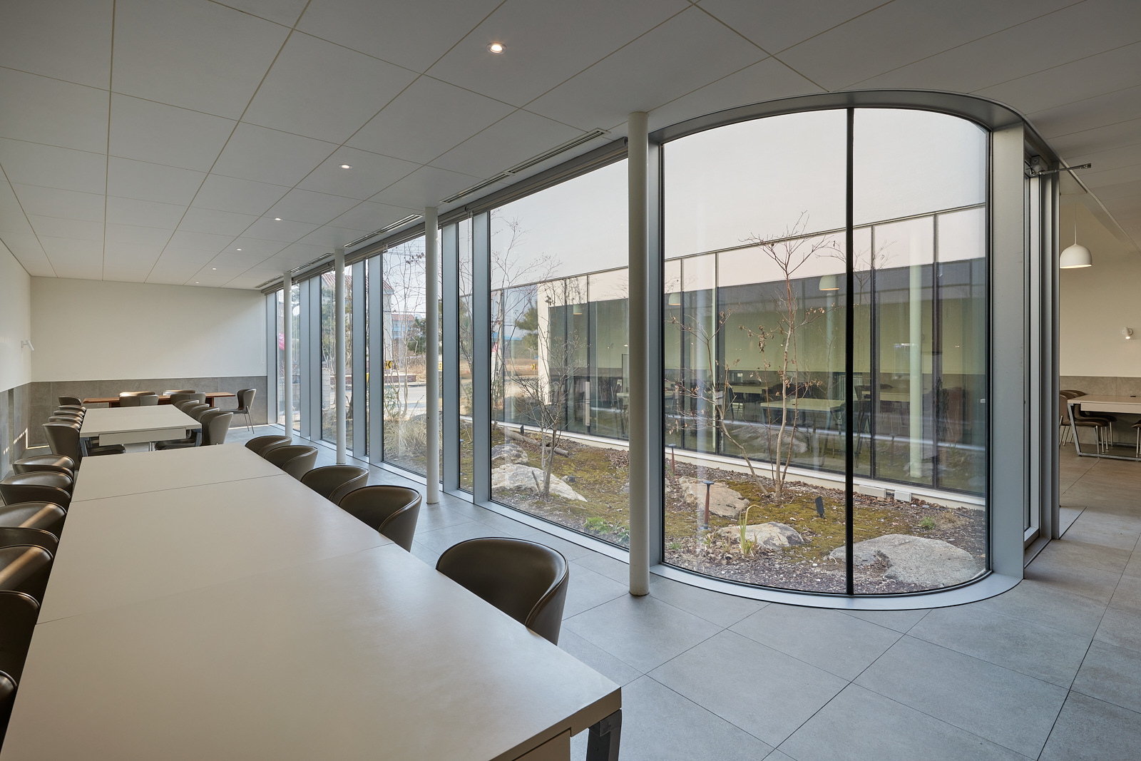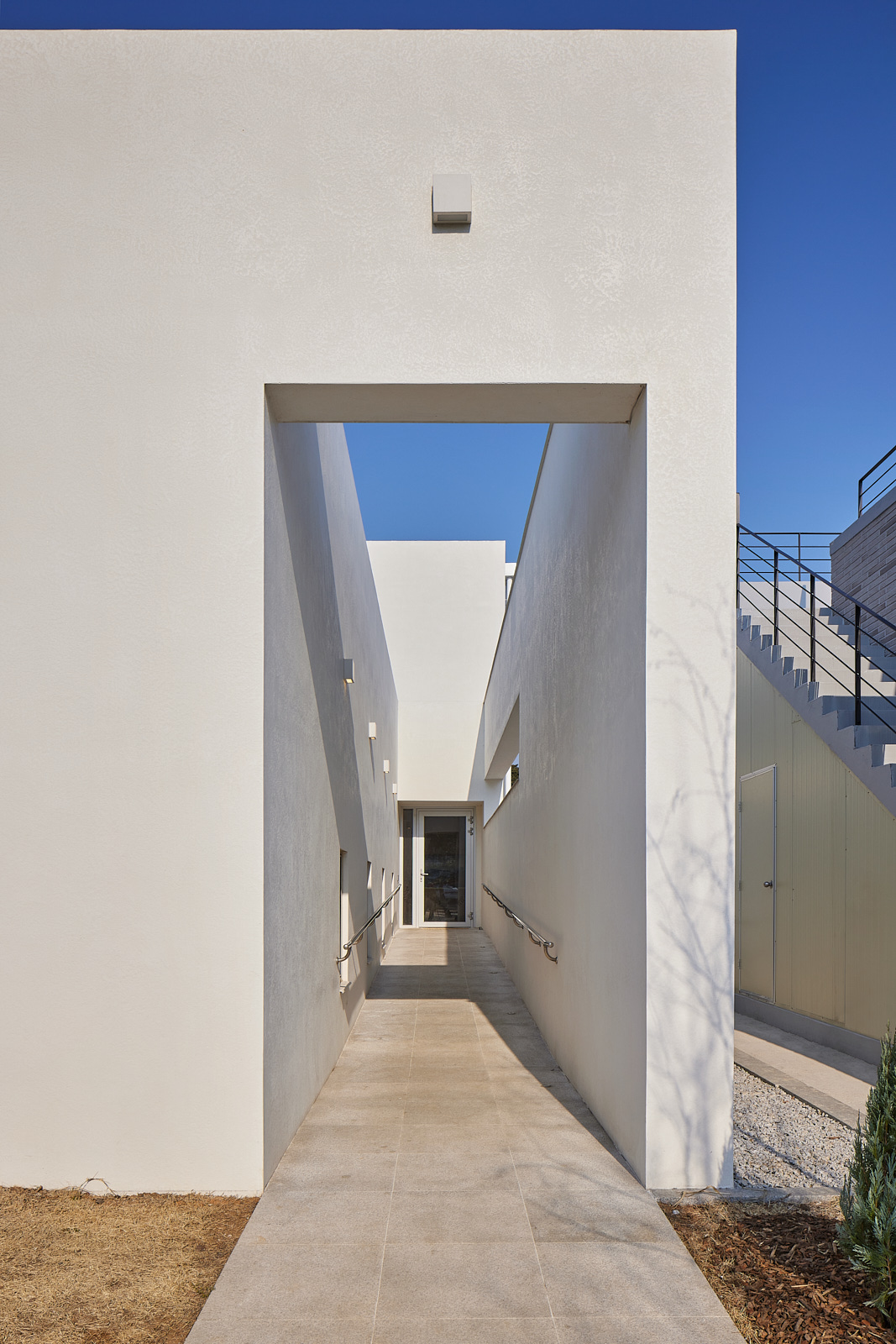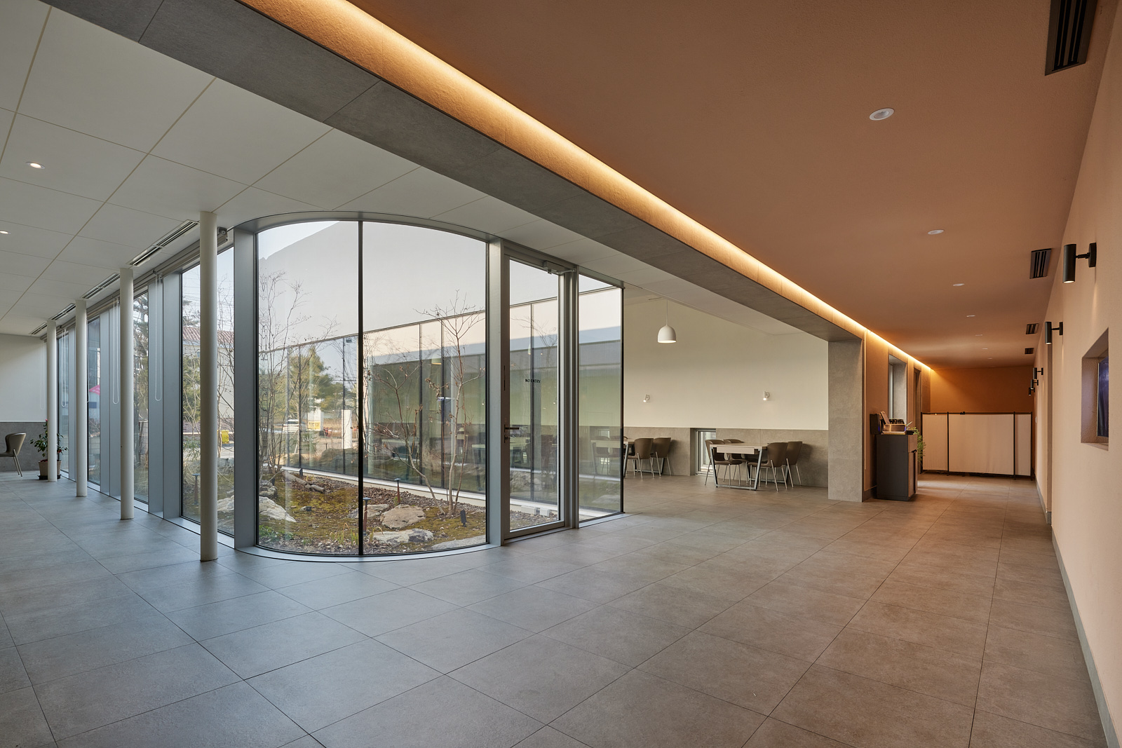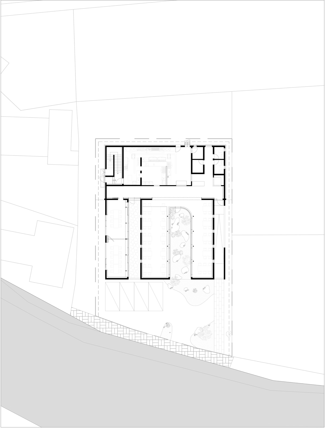 식사의 배경이 되는 조경요소들은 건물의 외부에서는 다소 다르게 인지된다. 바깥에서 바라본 건물의 정면에는 창이 없기 때문에 방문객은 각기 다른 크기의 세 개의 하얀 덩어리를 먼저 마주한다. 그 사이로 보이는 정원으로 방문객은 바로 들어설 수 없다. 정원들은 건축의 사이공간을 채워주는 부속요소처럼 느껴진다. 한켠에 만들어진 긴 입구를 거쳐 내부에 들어선 후 안에서부터 바깥으로 시선을 돌린 후에야 비로소 정원의 역할을 느낄 수 있다. 자리에 앉으면 건너편의 흰 매스를 배경으로 정원을 바라보게 된다. 건축물 외부에서 봤던 흰 매스와 조경요소들이 하나의 화폭에 겹쳐지며 한폭의 회화처럼, 식사의 배경이 된다. ■
