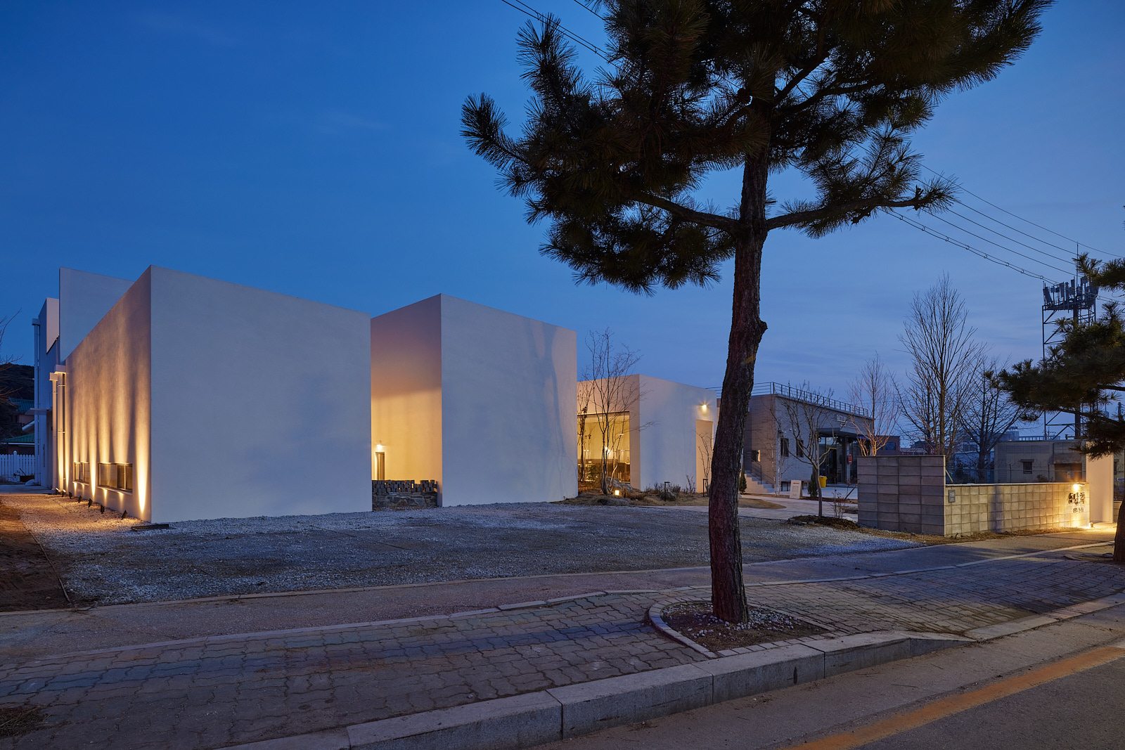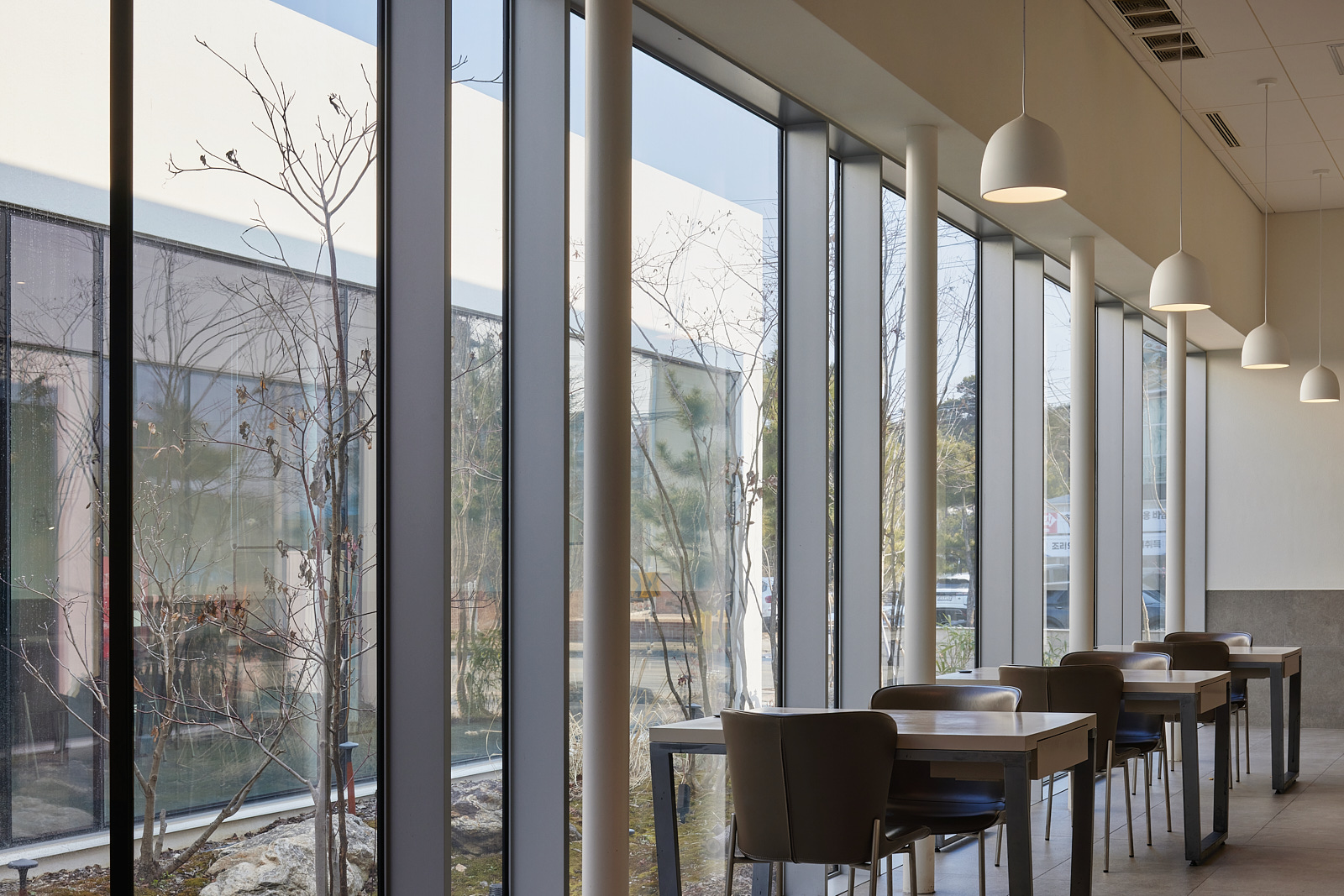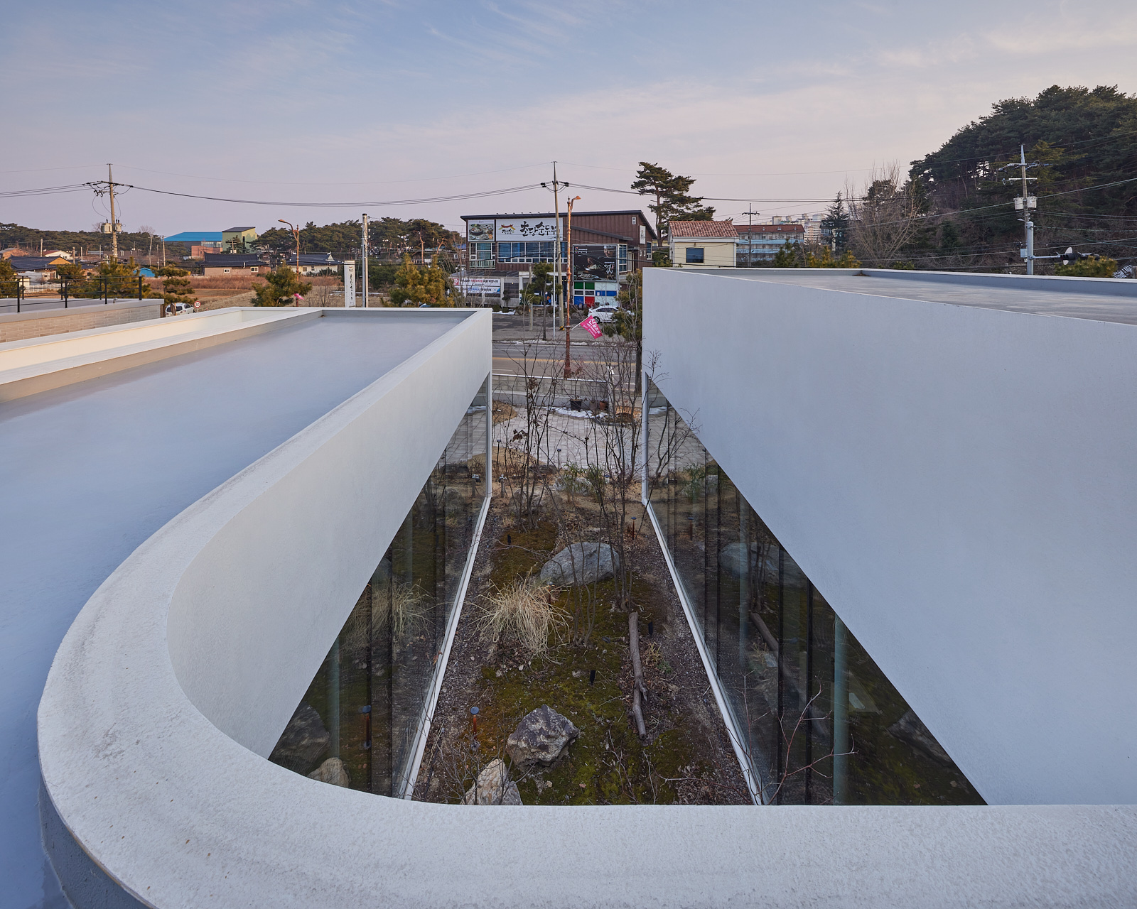대지 주변은 경포호와 해변 등 식사후 거닐 곳이 많다. 그렇다면 식당의 정원은 식사 후 보다는 식사 중에 즐길 수 있는 공간이어야 하지 않을까. 건축주가 권했던 다큐멘터리 ‘두 레스토랑 이야기’ 속 식당의 한쪽 벽엔 커다란 그림이 있는데, 이 그림이 홀의 분위기를 지배한다. 여기서는 정원이 그 역할을 해낼 수 있지 않을까. 필요한 홀을 얇고 긴 세 개의 공간으로 나눴다. 그리고 세 공간 사이에 두 개의 정원이 자리잡는다. 창, 기둥, 벽, 재료 등 나머지 계획은 이 정원을 온전히 담아내는 데에 집중되었다. 외부에서도 마찬가지다. 백색의 외단열마감재는 각 정원의 조경요소와 그 속의 활동을 담는 담담한 배경이 된다. 낮에는 푸른 나무들을 돋보이게 하고, 밤에는 그림자를 받아낸다.