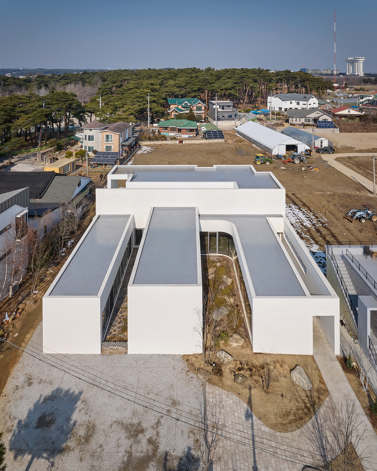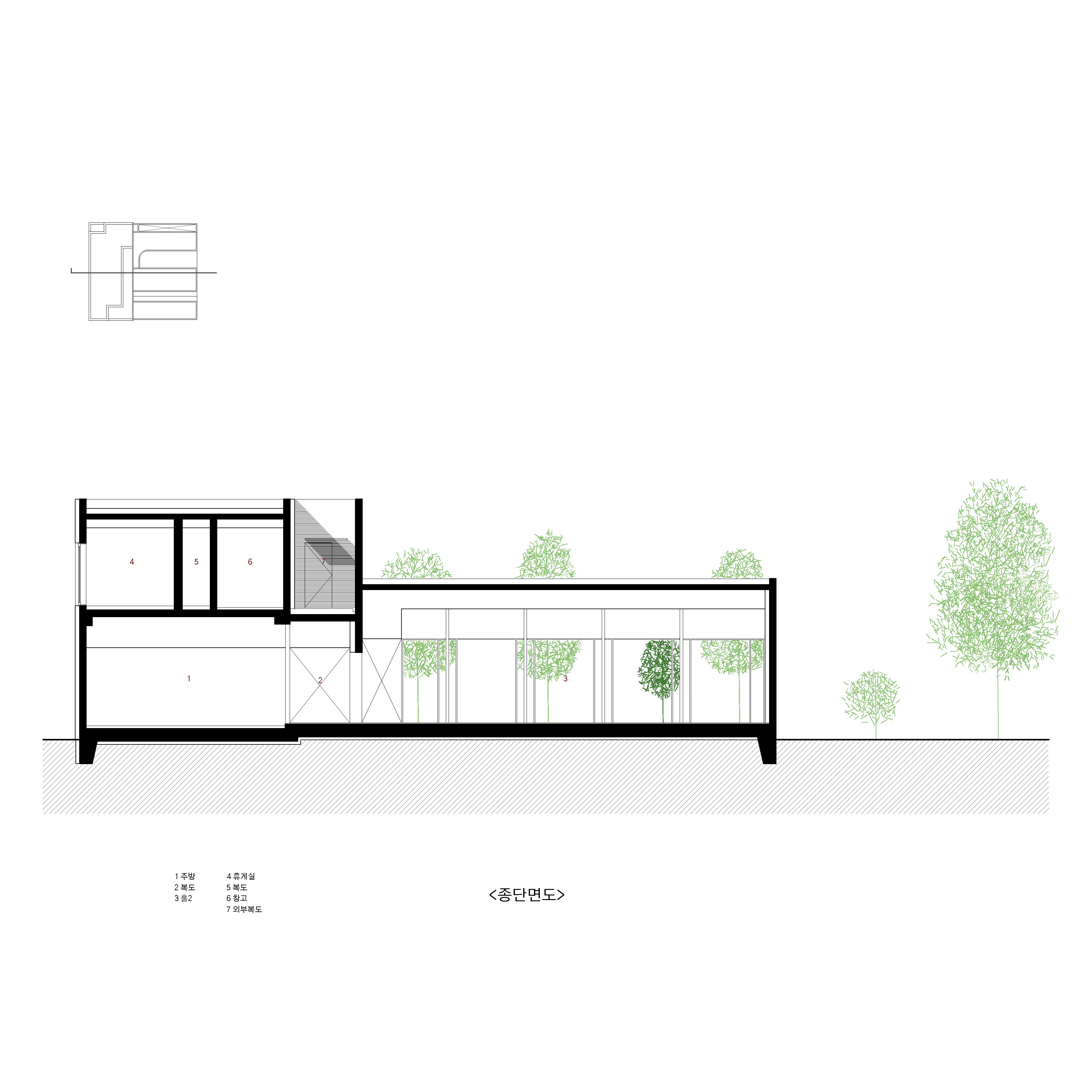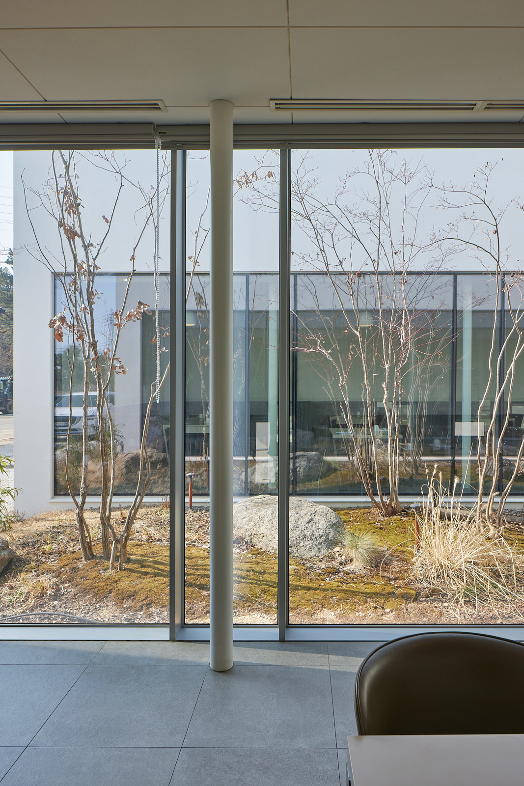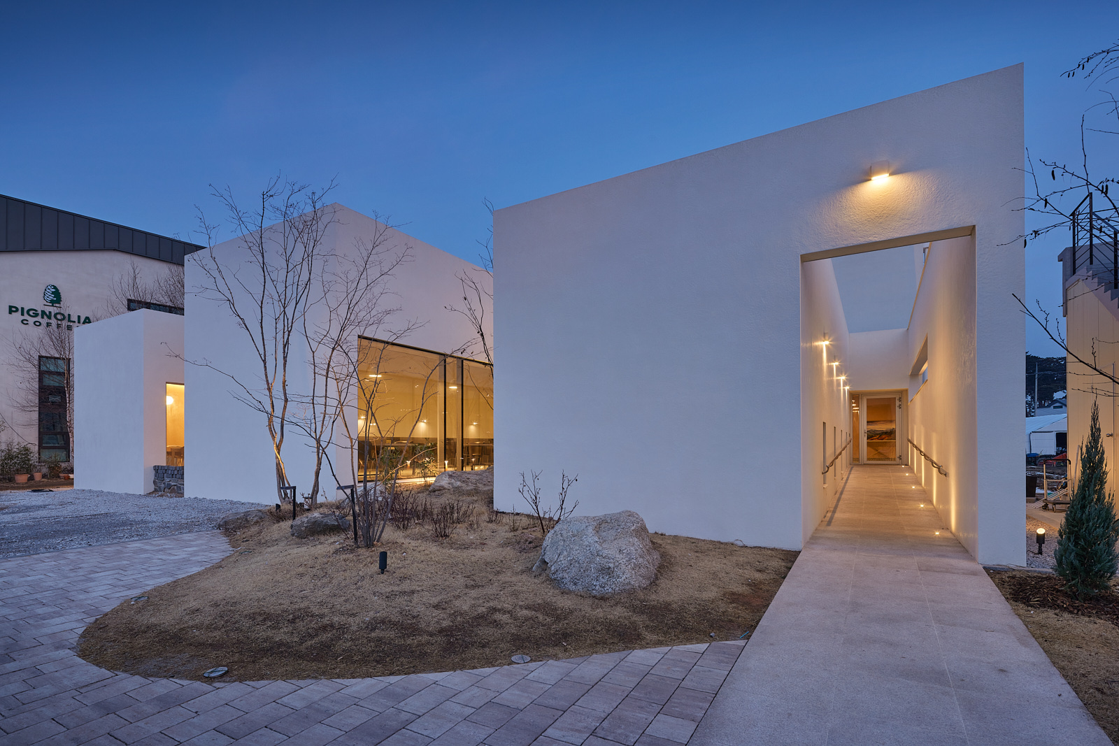 대지 주변은 경포호와 해변 등 식사후 거닐 곳이 많다. 그렇다면 식당의 정원은 식사 후 보다는 식사 중에 즐길 수 있는 공간이어야 하지 않을까. 건축주가 권했던 다큐멘터리 ‘두 레스토랑 이야기’ 속 식당의 한쪽 벽엔 커다란 그림이 있는데, 이 그림이 홀의 분위기를 지배한다. 여기서는 정원이 그 역할을 해낼 수 있지 않을까. 필요한 홀을 얇고 긴 세 개의 공간으로 나눴다. 그리고 세 공간 사이에 두 개의 정원이 자리잡는다. 창, 기둥, 벽, 재료 등 나머지 계획은 이 정원을 온전히 담아내는 데에 집중되었다. 외부에서도 마찬가지다. 백색의 외단열마감재는 각 정원의 조경요소와 그 속의 활동을 담는 담담한 배경이 된다. 낮에는 푸른 나무들을 돋보이게 하고, 밤에는 그림자를 받아낸다.