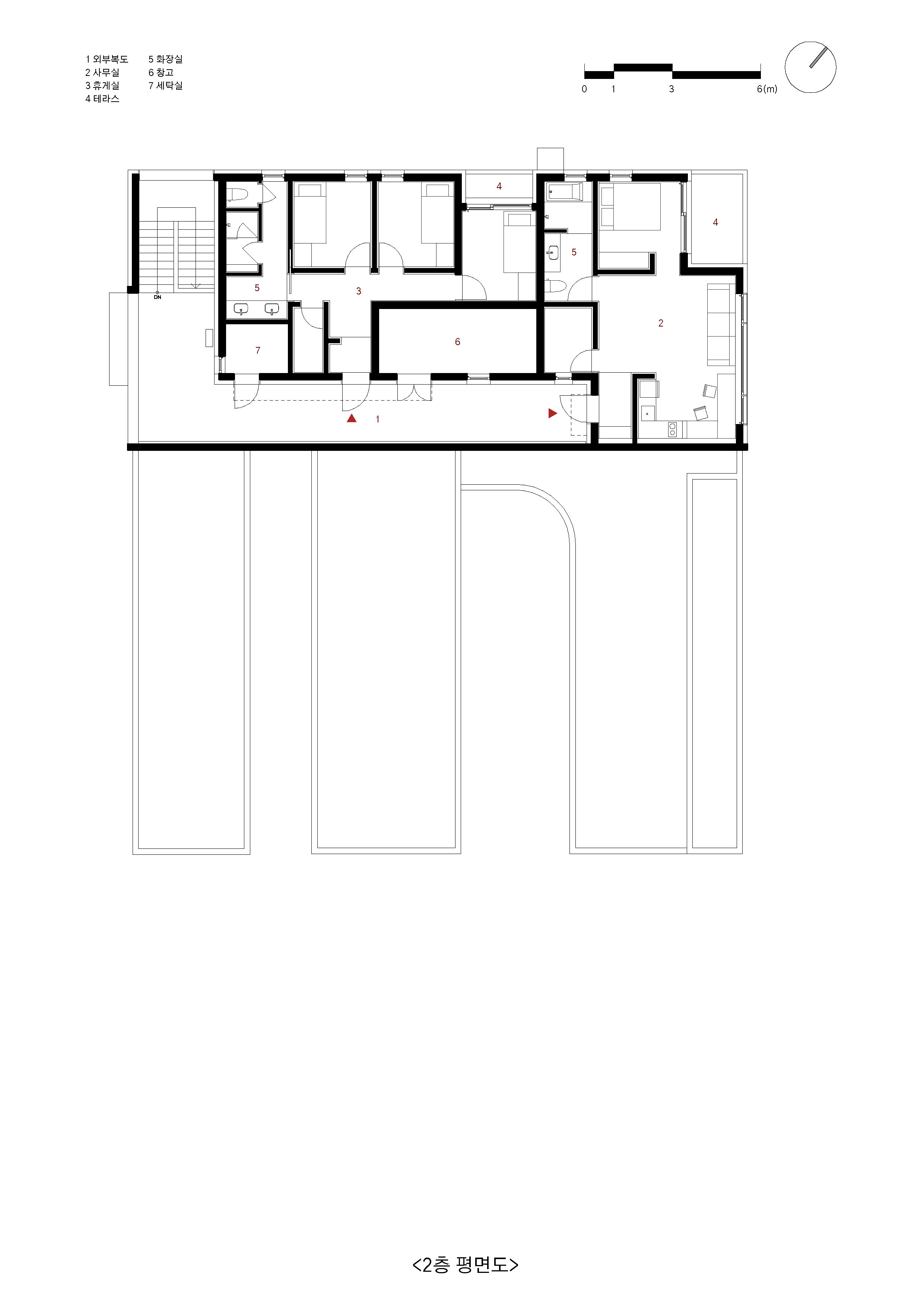 강릉 경포호 근처의 한식당 의뢰를 받았다. 서울에서 식당을 운영하는 건축주는 새로운 분위기의 식당을 구상하고 있었다. 건축주는 직접 그린 계획안을 보내왔다. 주방 구성, 서빙동선 등, 그간의 식당 운영 경험이 잘 반영되어 있었다. 홀 뒤편에 제안하는 후정은 도심 속 식당과의 차별화 포인트로 읽혔다. 하지만 정작 중심이 되는 홀은 일반적인 임대상가 속 공간처럼 보여 아쉬웠다. 새로 구상하는 공간에 대한 유연한 상상을 함께 해보고 싶었다. 식당의 시스템은 건축주의 의견을 반영하고, 우리는 음식과 공간의 경함 자체에 집중하기로 했다. 그때부터 건축주와의 대화는 구체적인 공간의 모습보다 음식의 종류나 식당의 분위기 등에 집중됐다. 새로 구상하는 음식, 영화 속 장면 등에 대해 이야기하며 건축주는 원하는 분위기를 전달했다. 우리는 이를 온전히 담아낼 방법을 고민했다.