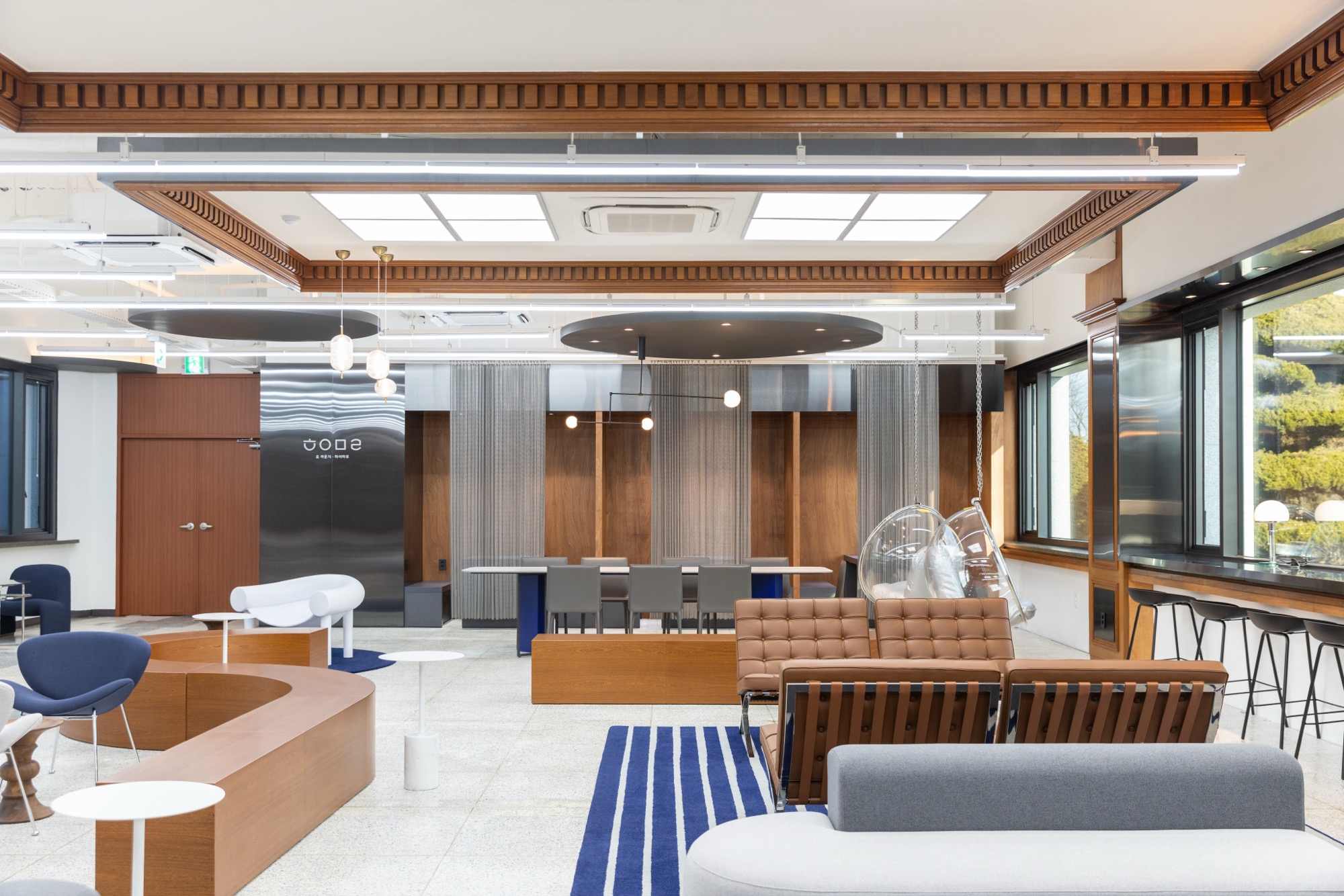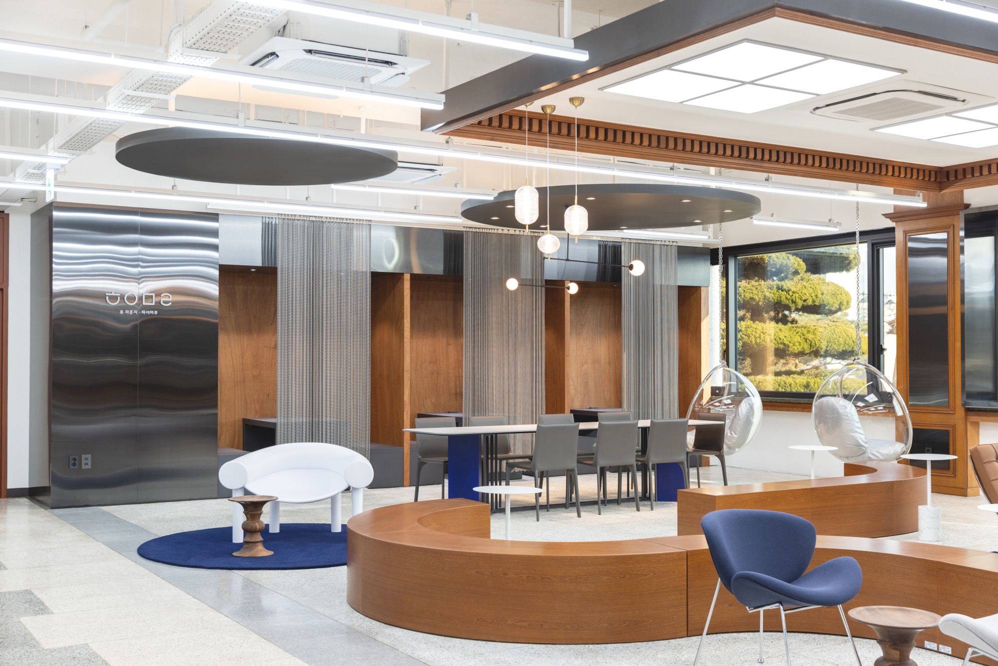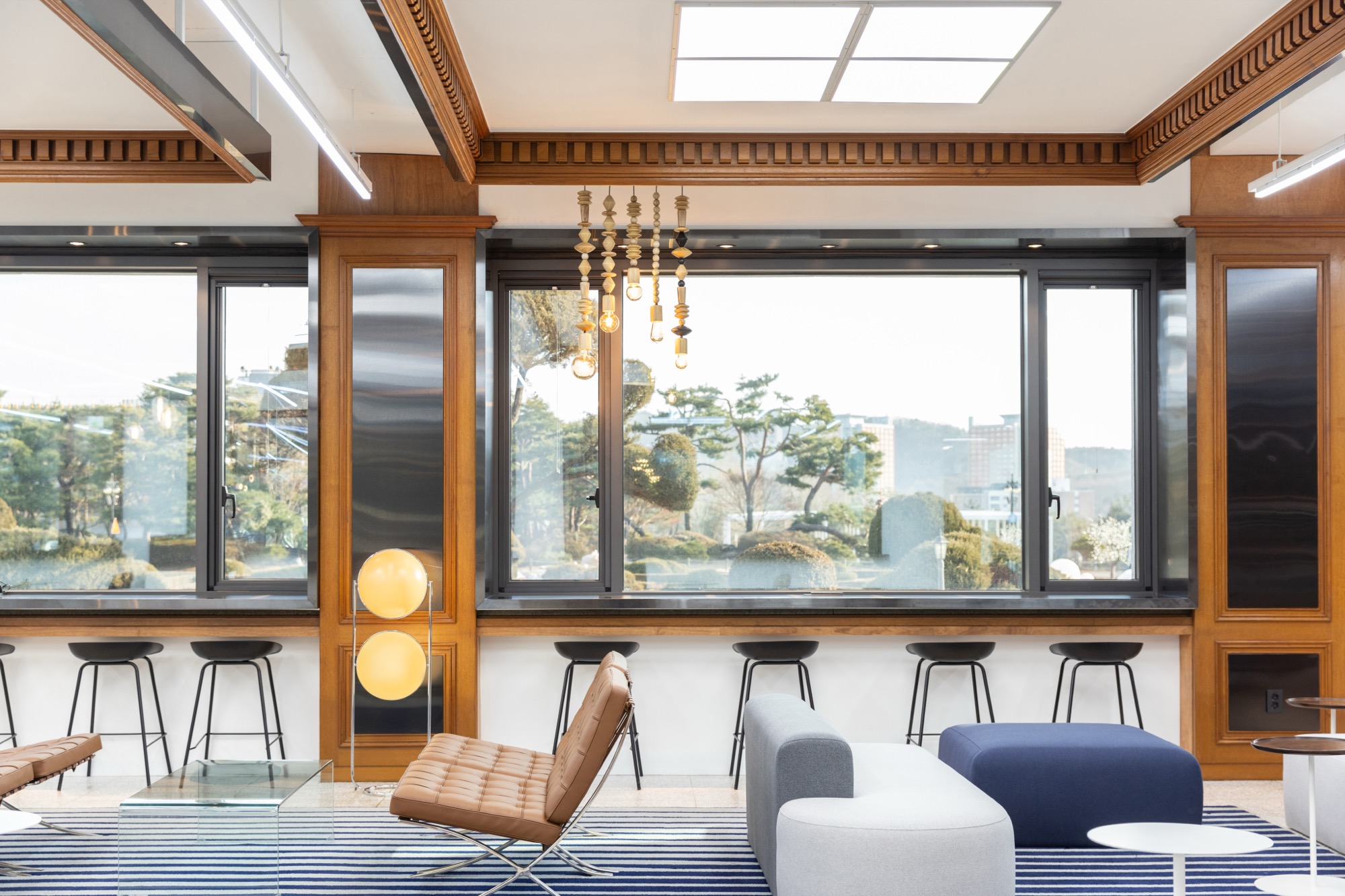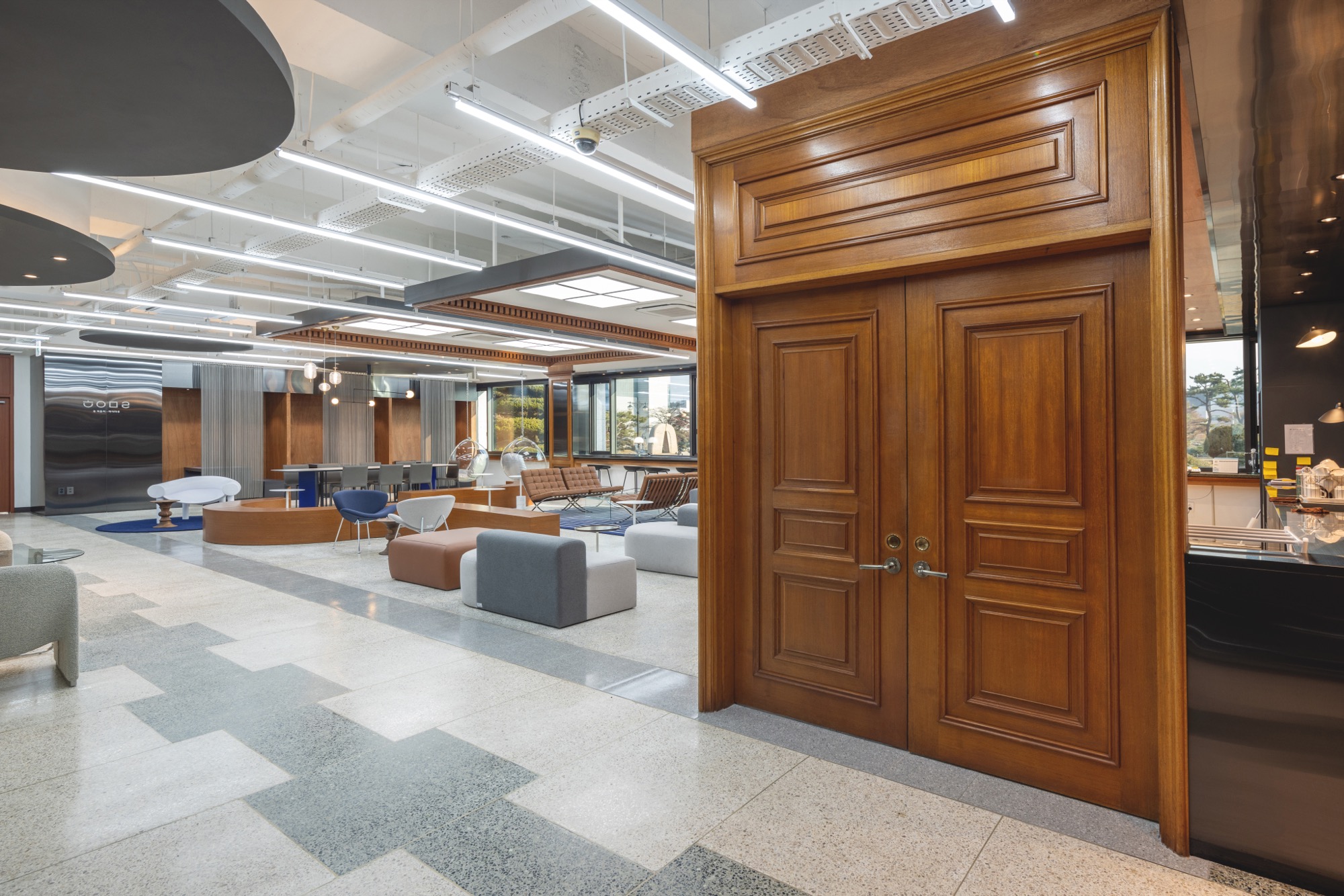 대회의실의 문은 마치 과거와 현재를 연결하는 의미로 공간과 공간 사이를 연결해주는 기능적인 문은 사라지고 시간과 사용자를 연결하는 문으로서 의미를 가진다. 대회의실을 복도와 맞닿은 벽을 철거해 개방감이 있는 열린 공간으로 계획했다. 하지만 기존 천정 일부와 우드 몰딩을 상징으로 남겨 전반적인 분위기의 통일성을 연출했다. 기존에 있던 우드 몰딩과 문을 존치하여 과거의 기억들을 지우지 않고 현대적인 것과 잘 섞어 과거와 현재가 동시에 존재하는 추억이 되는 공간을 기대했다.