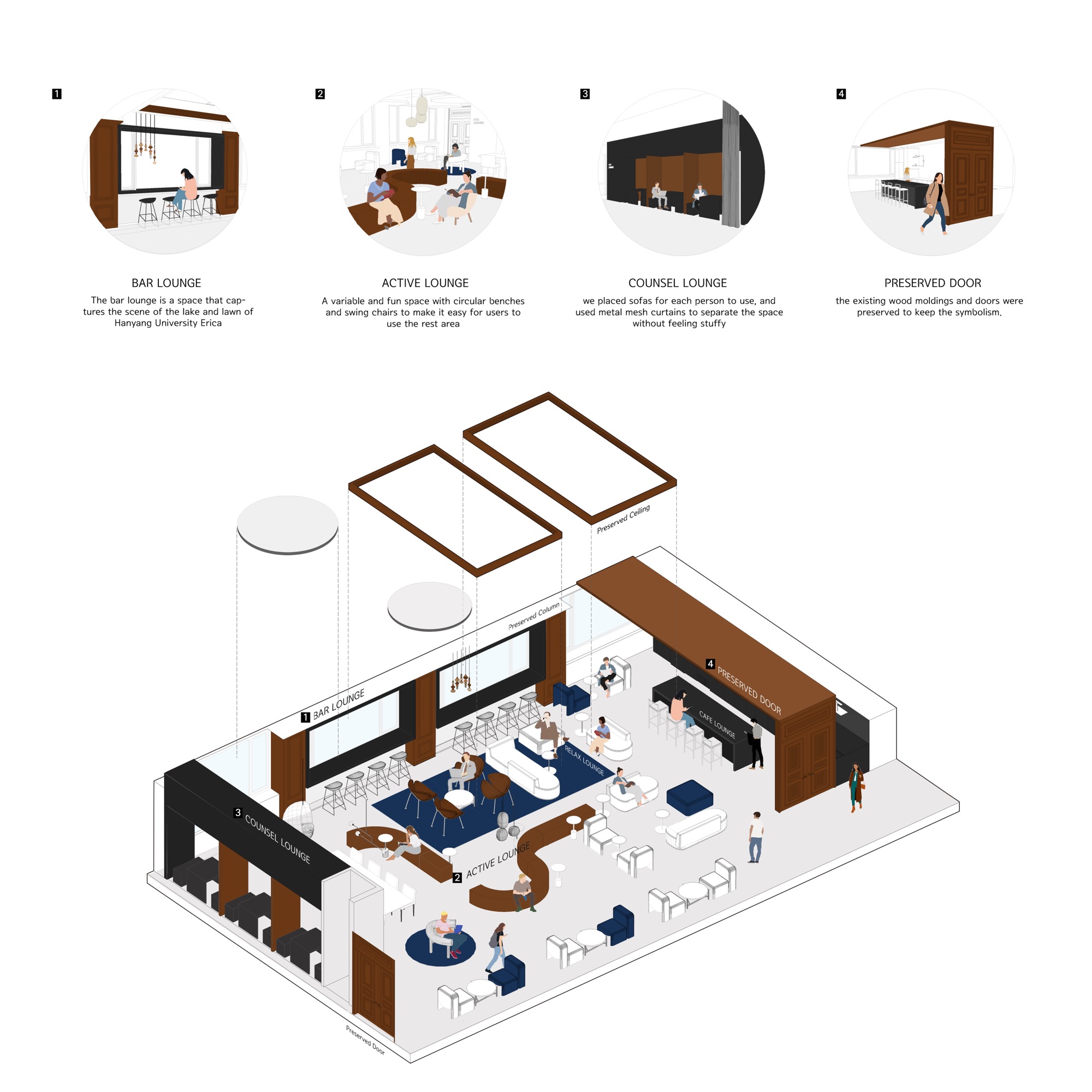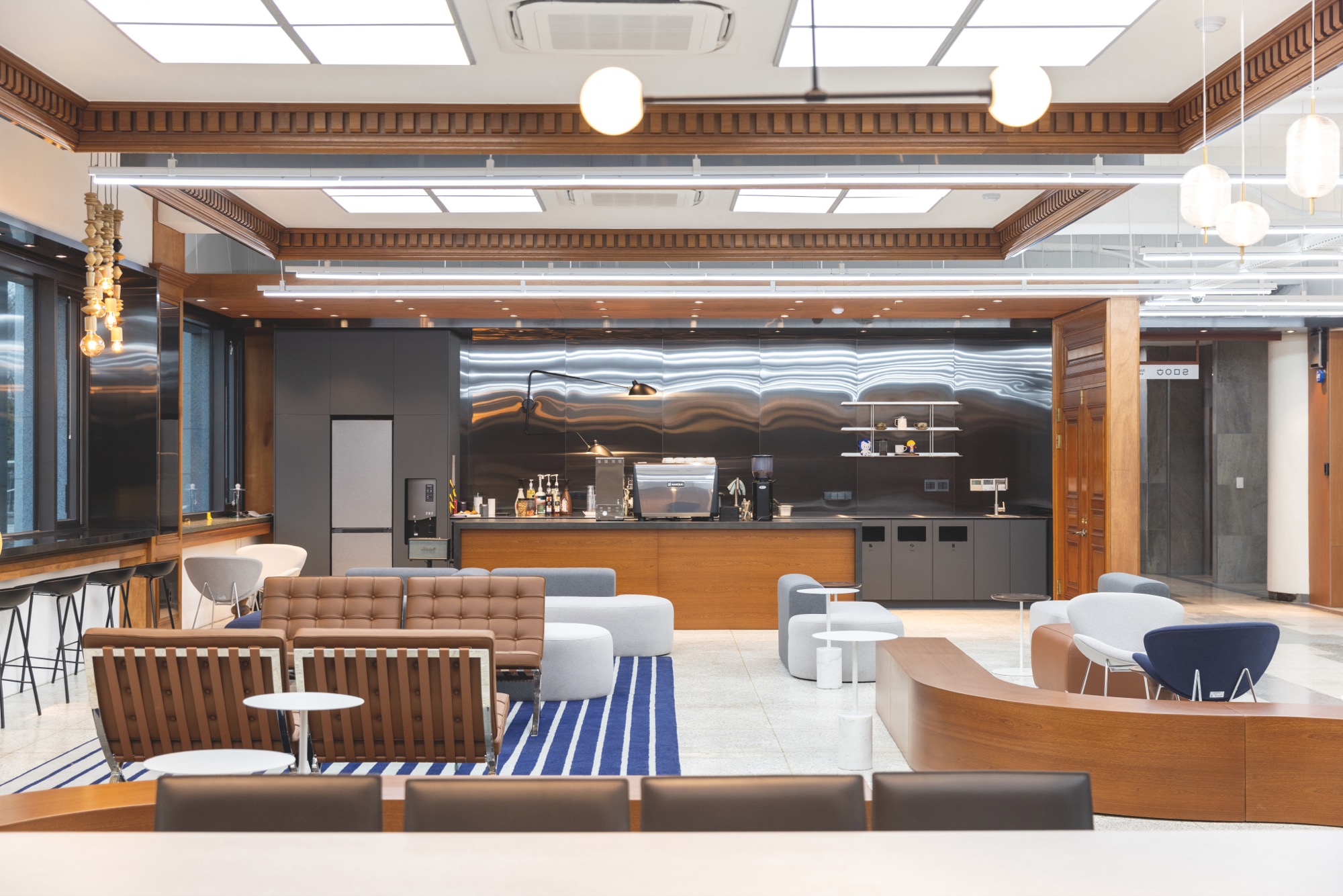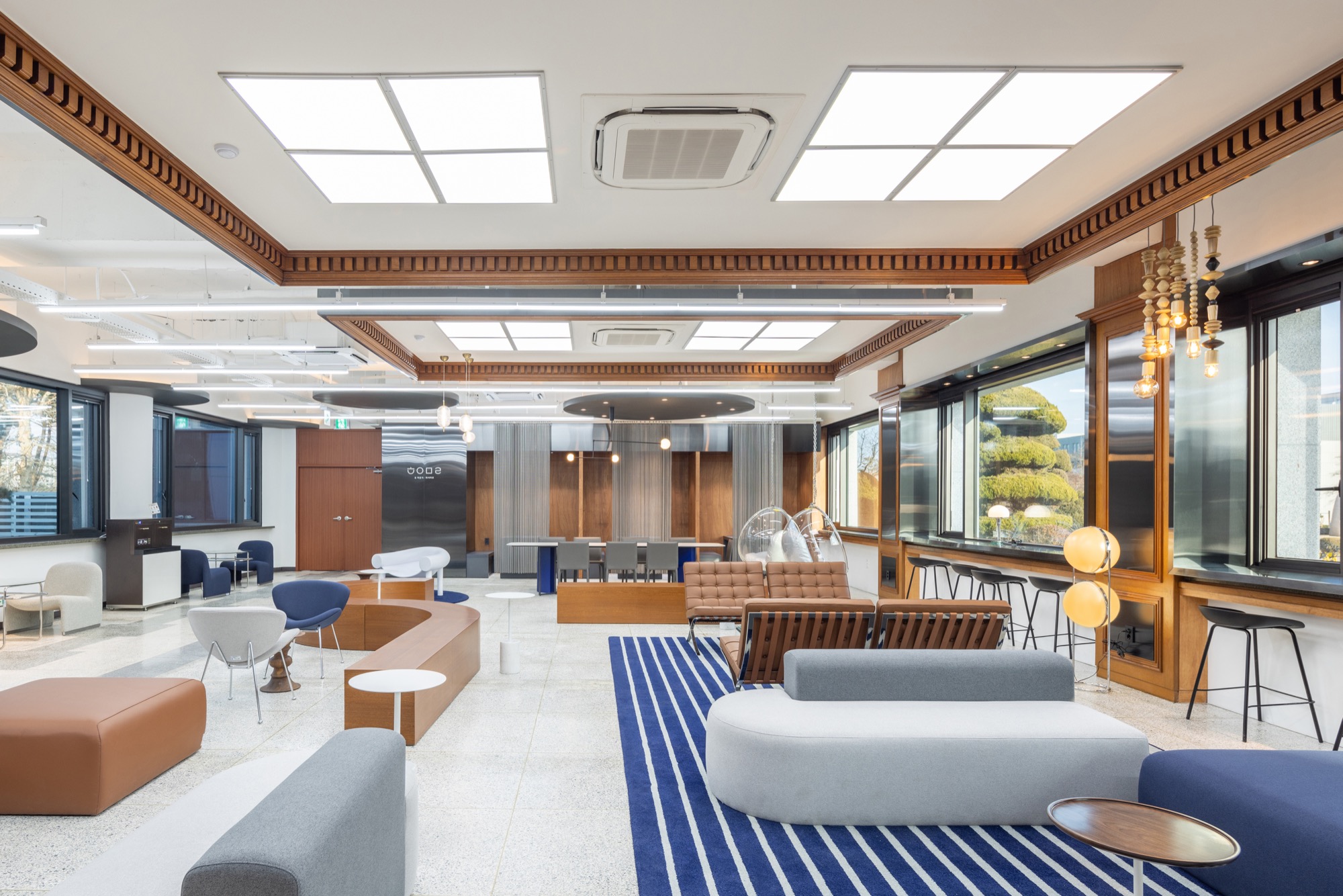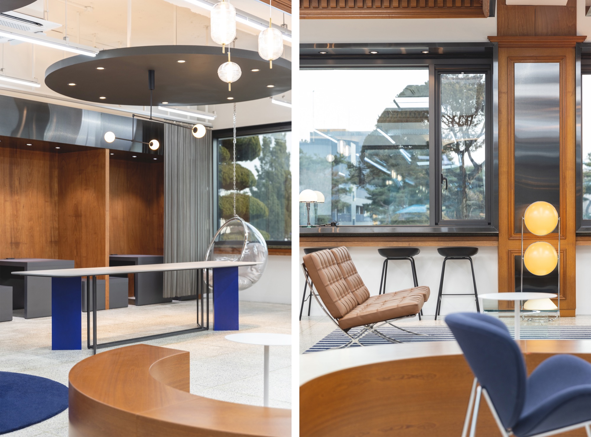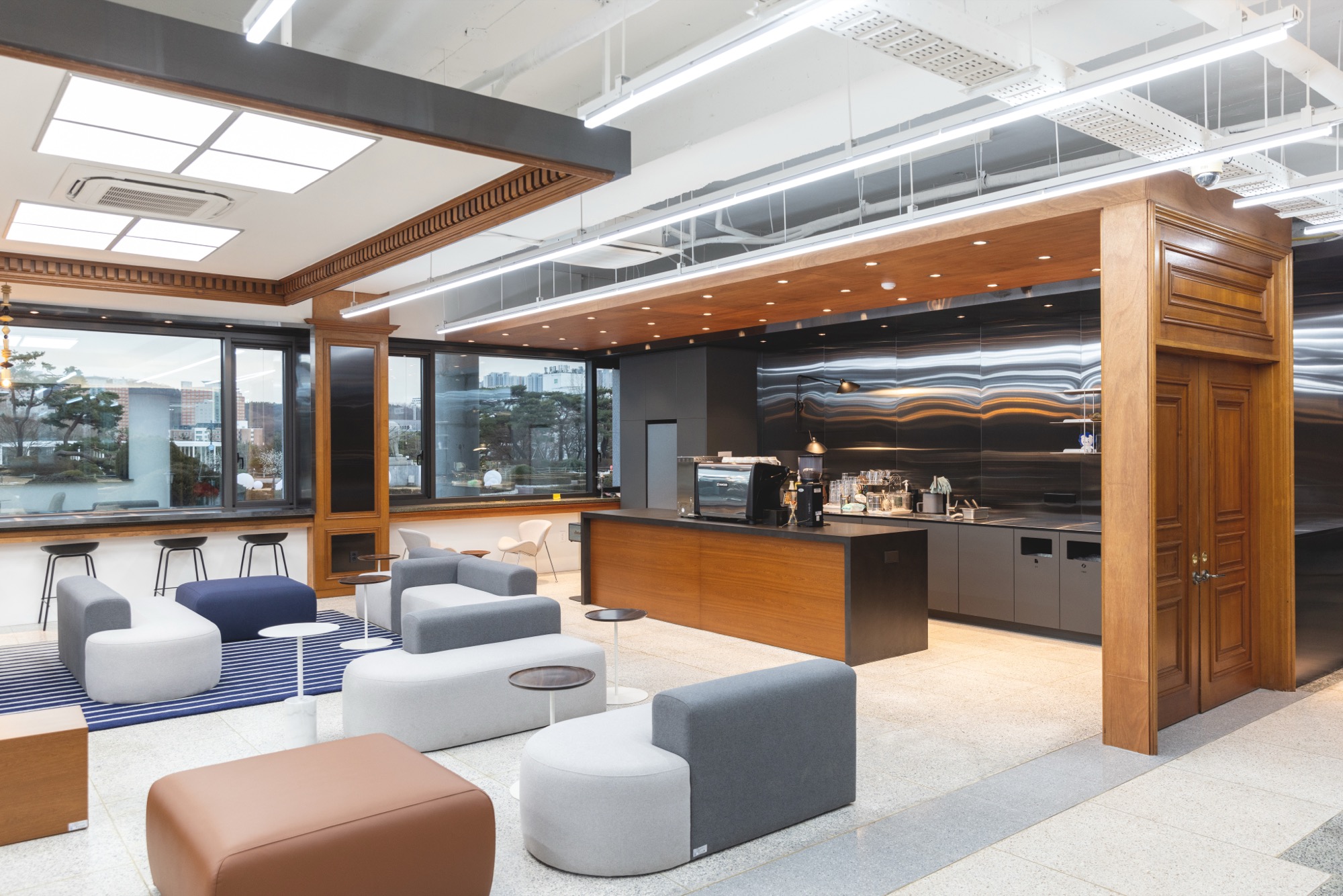 대회의실의 문은 마치 과거와 현재를 연결하는 의미로 공간과 공간 사이를 연결해주는 기능적인 문은 사라지고 시간과 사용자를 연결하는 문으로서 의미를 가진다. 대회의실을 복도와 맞닿은 벽을 철거해 개방감이 있는 열린 공간으로 계획했다. 하지만 기존 천정 일부와 우드 몰딩을 상징으로 남겨 전반적인 분위기의 통일성을 연출했다. 기존에 있던 우드 몰딩과 문을 존치하여 과거의 기억들을 지우지 않고 현대적인 것과 잘 섞어 과거와 현재가 동시에 존재하는 추억이 되는 공간을 기대했다.
