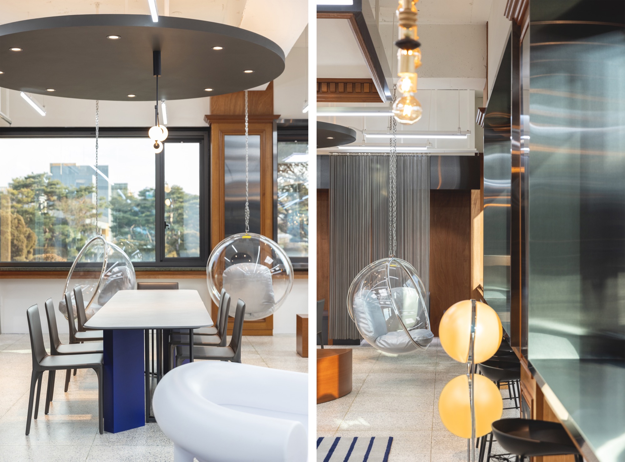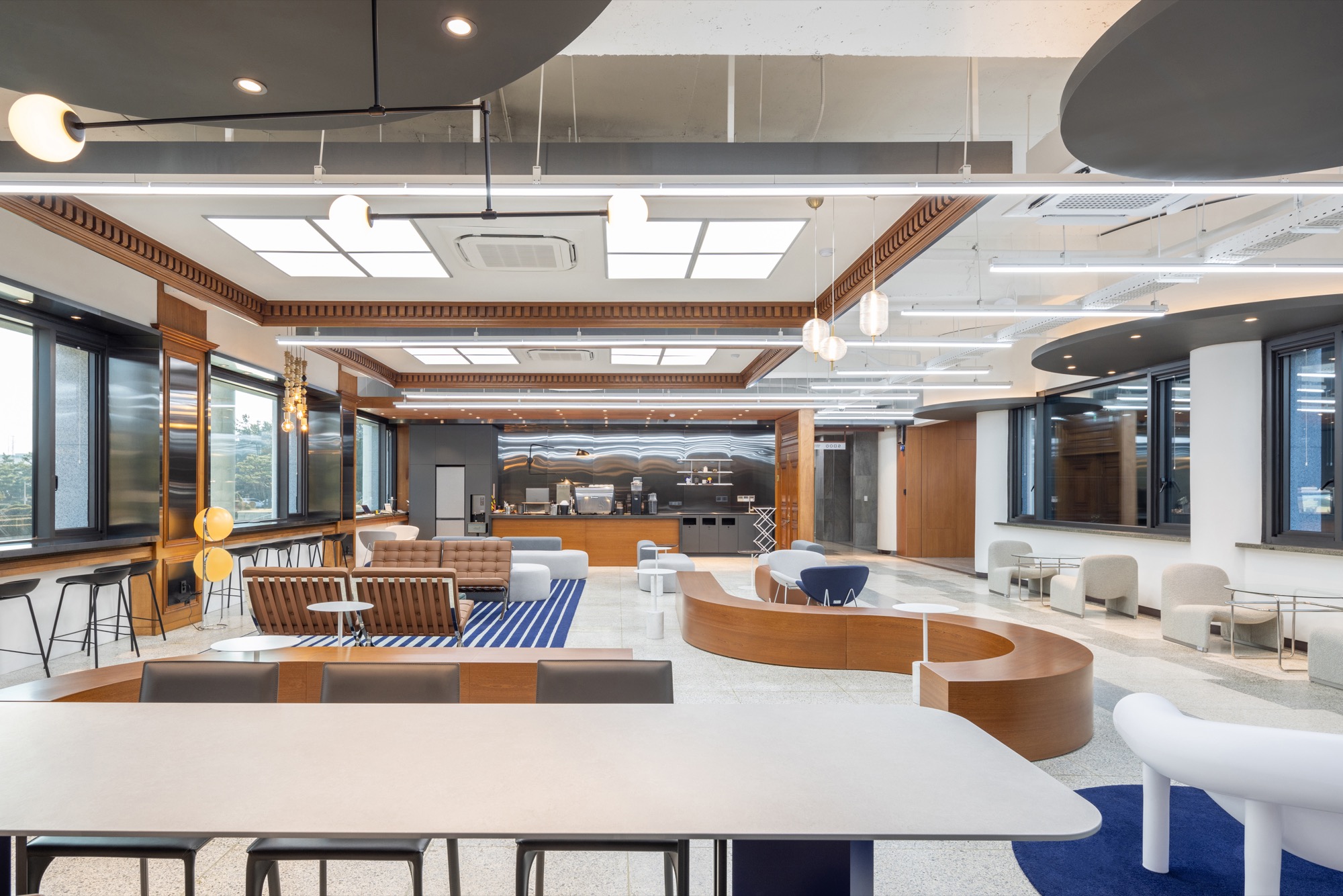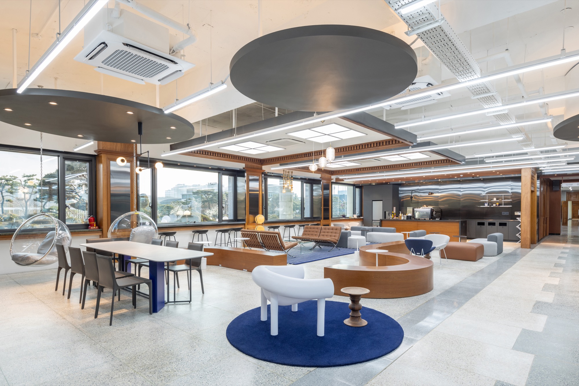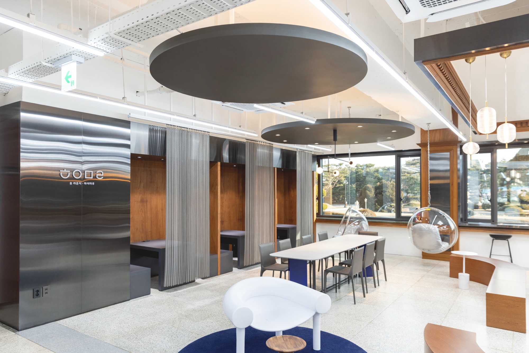 회의 라운지는 많은 인원이 다 같이 앉아 대화를 나누거나 회의를 할 수 있게 큰 테이블을 두었다. 경직된 회의공간이 될 수 있었던 회의 라운지의 천정에는 원형의 천정구조물과 조명을 설치해 딱딱한 느낌을 없애고 편안한 소통의 공간으로 연출하고자 했다.