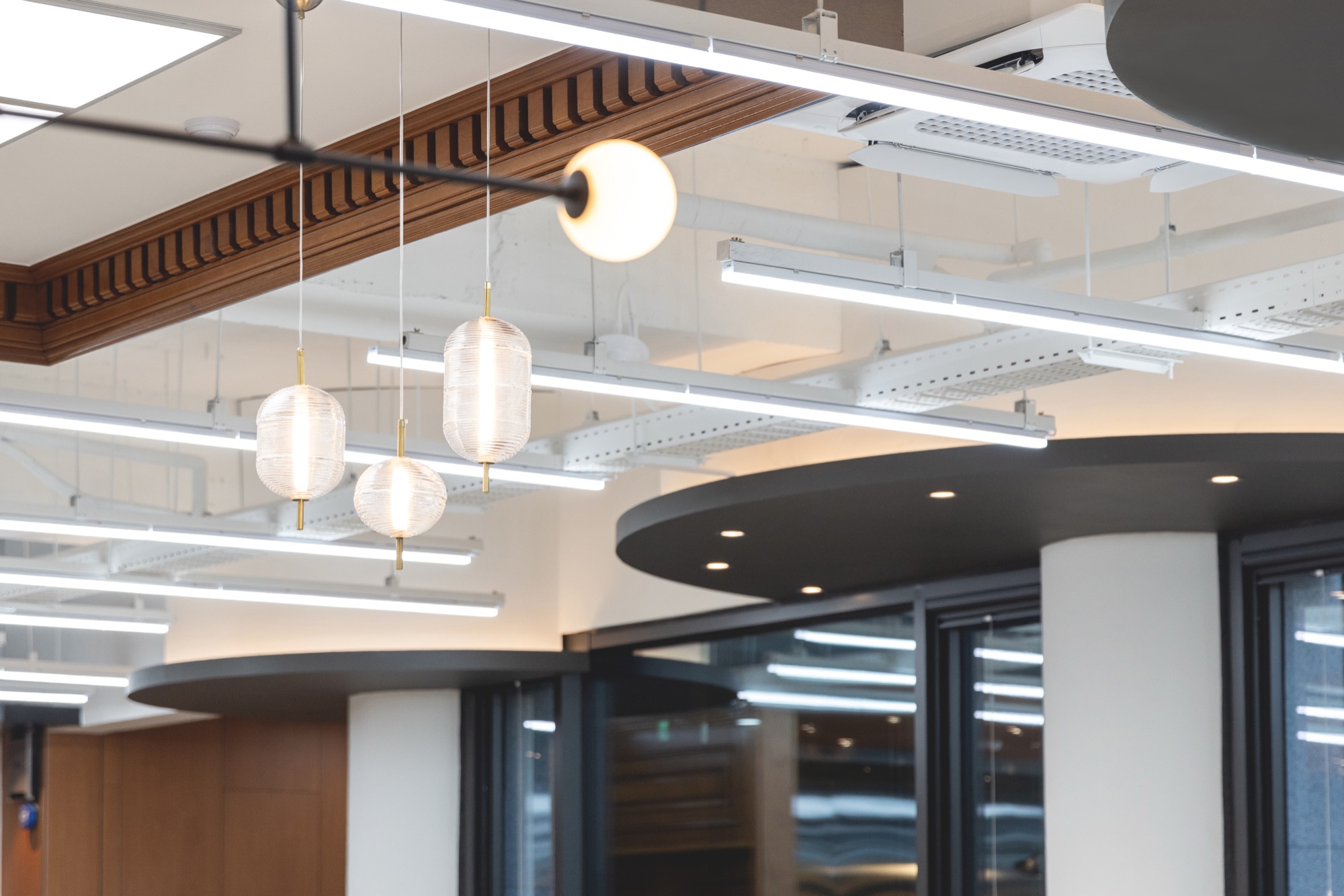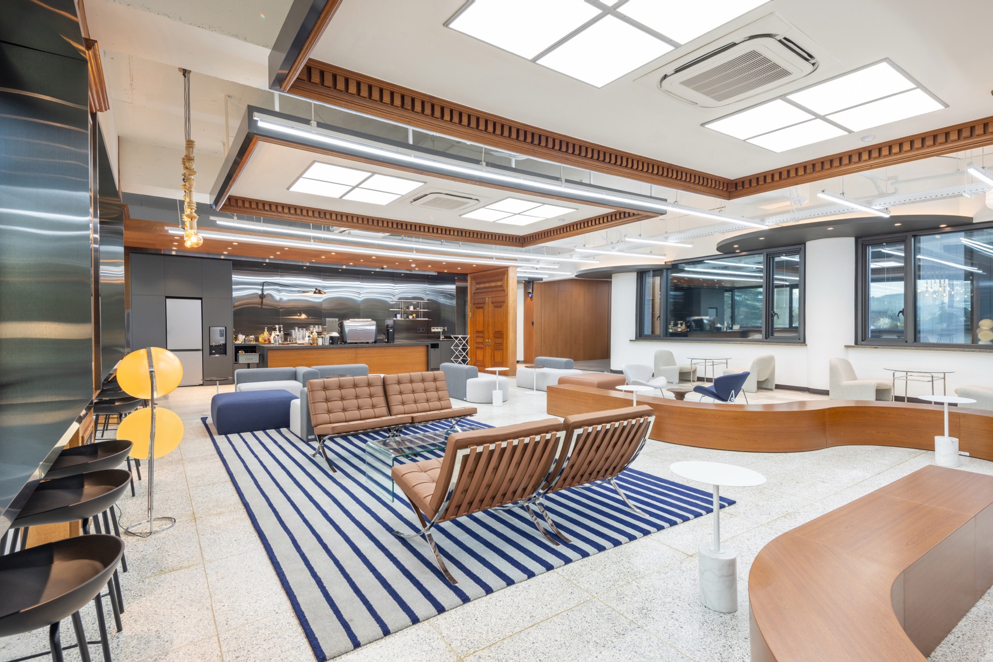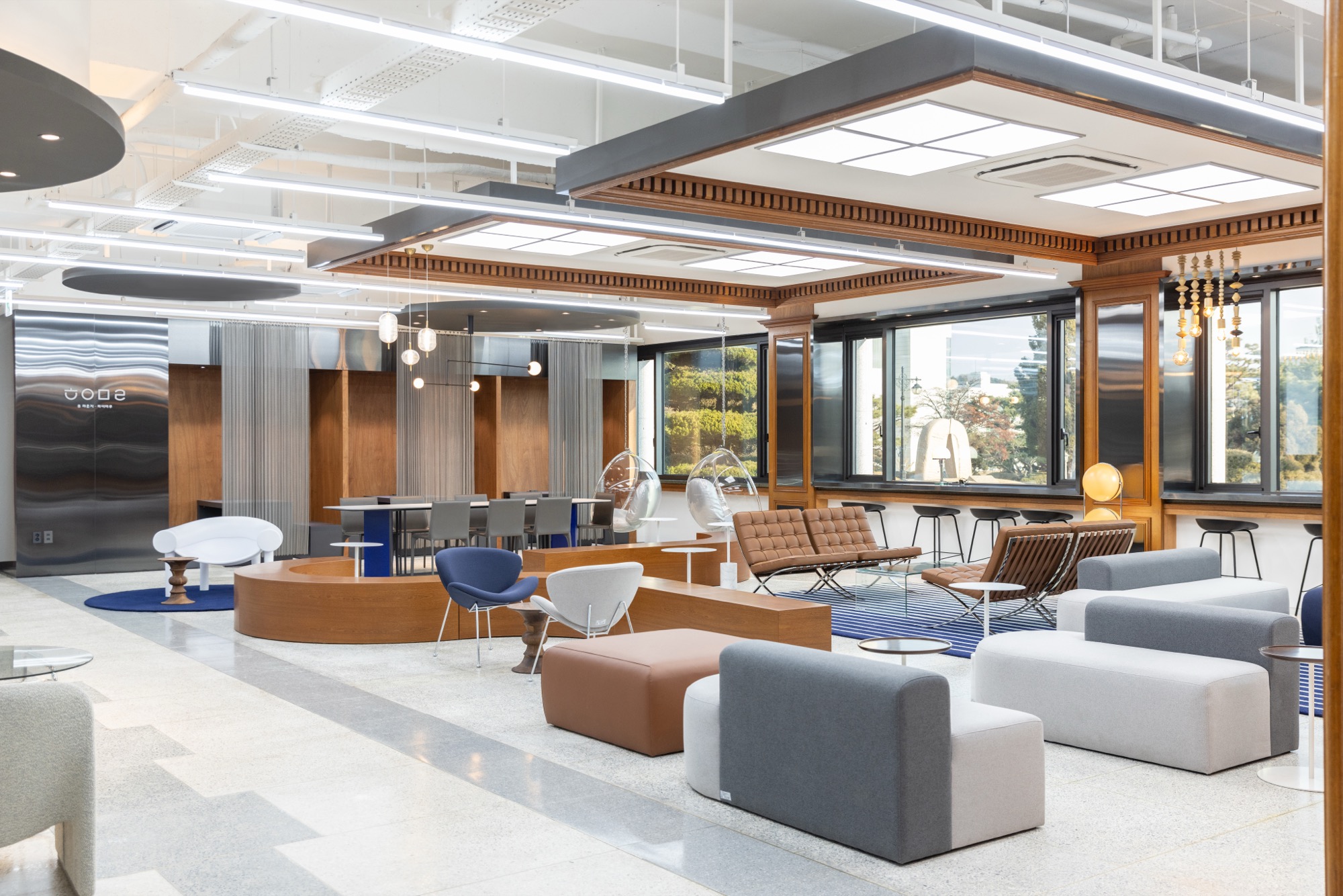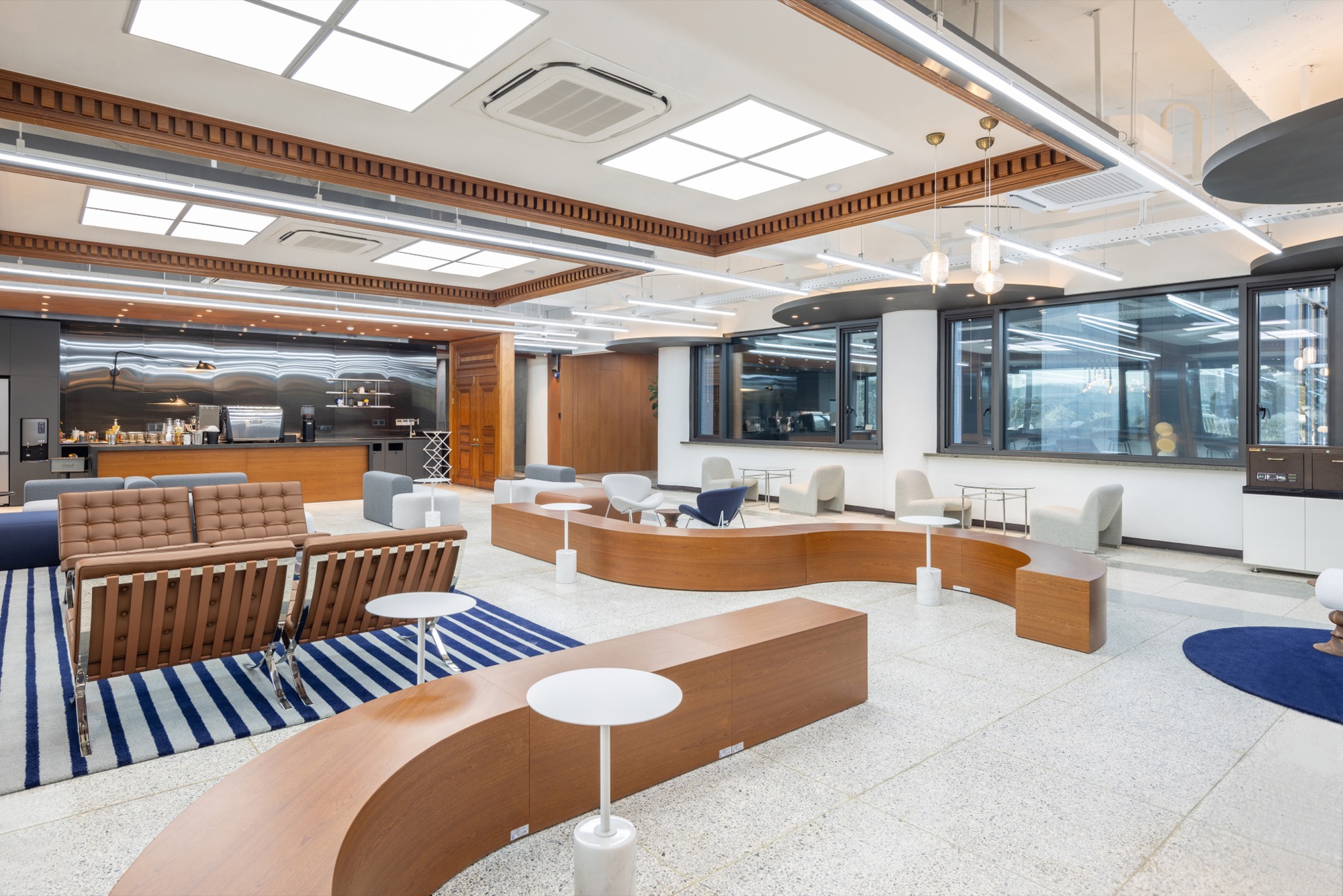 회의 라운지는 많은 인원이 다 같이 앉아 대화를 나누거나 회의를 할 수 있게 큰 테이블을 두었다. 경직된 회의공간이 될 수 있었던 회의 라운지의 천정에는 원형의 천정구조물과 조명을 설치해 딱딱한 느낌을 없애고 편안한 소통의 공간으로 연출하고자 했다.
