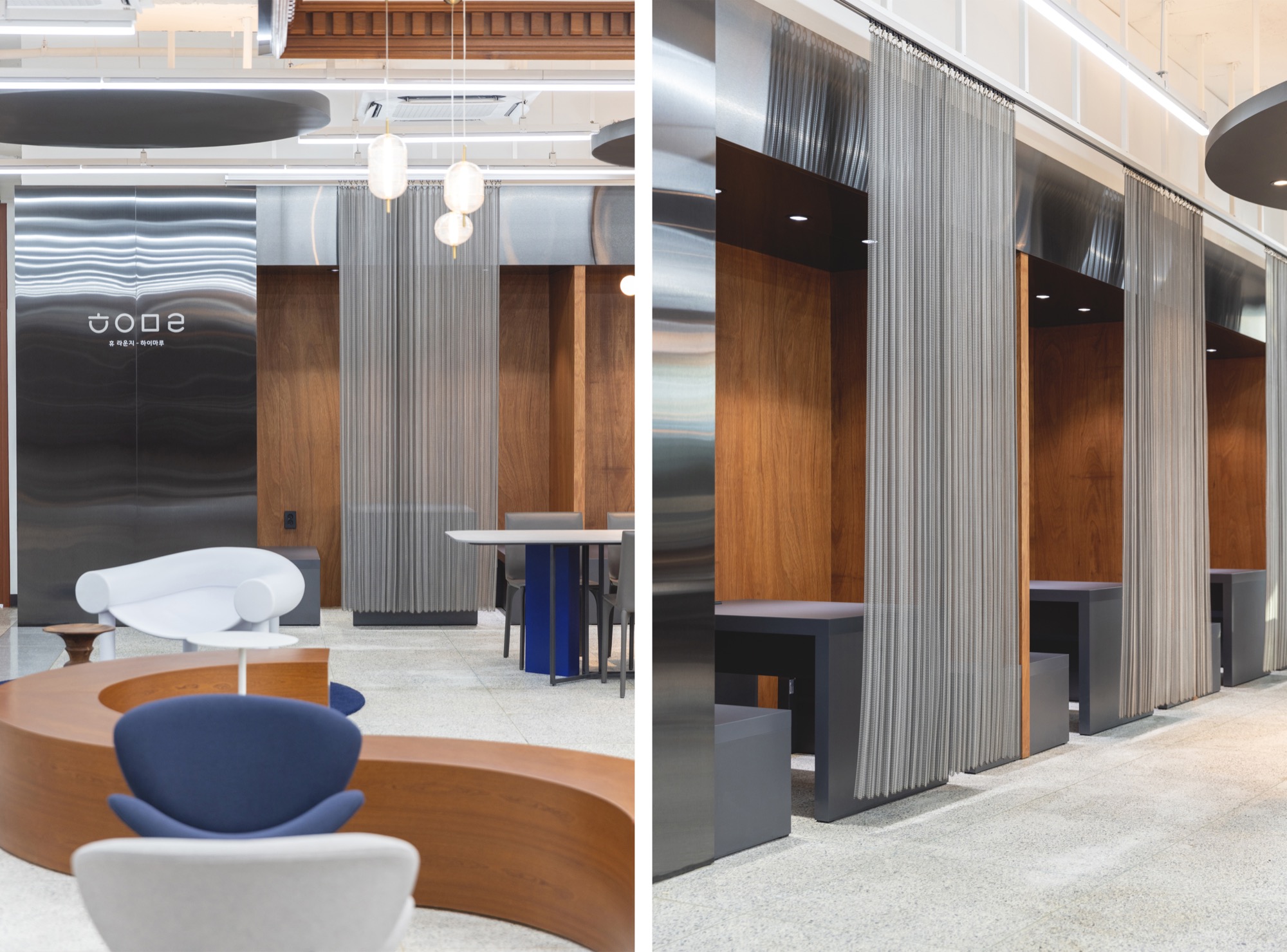 상담 라운지에는 독립적으로 사용할 수 있는 테이블 및 소파를 배치했다. 전면에는 메탈 소재의 메쉬 커튼을 활용해 답답하지 않도록 하며, 공간의 완전한 단절을 덜고자 했다.◼︎
